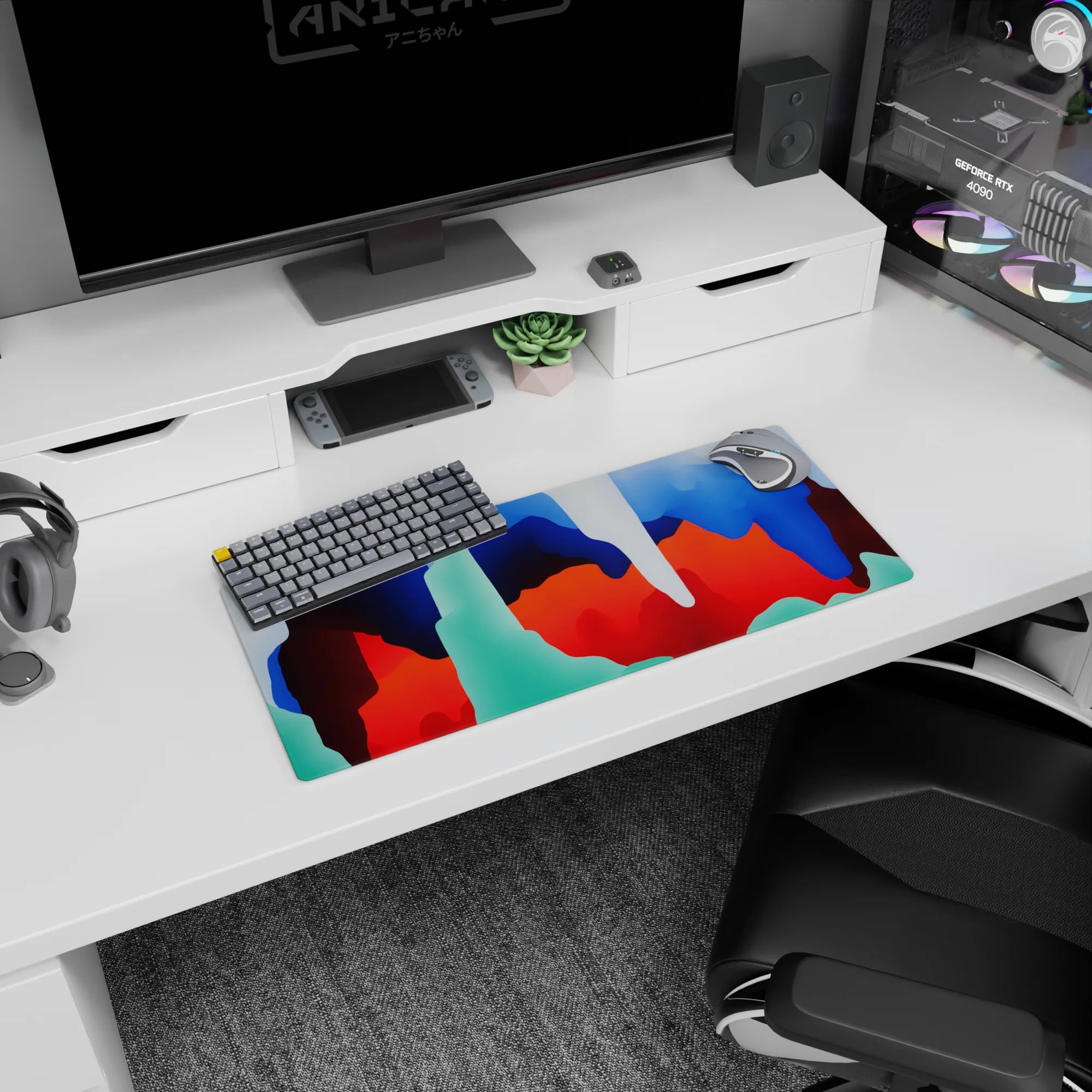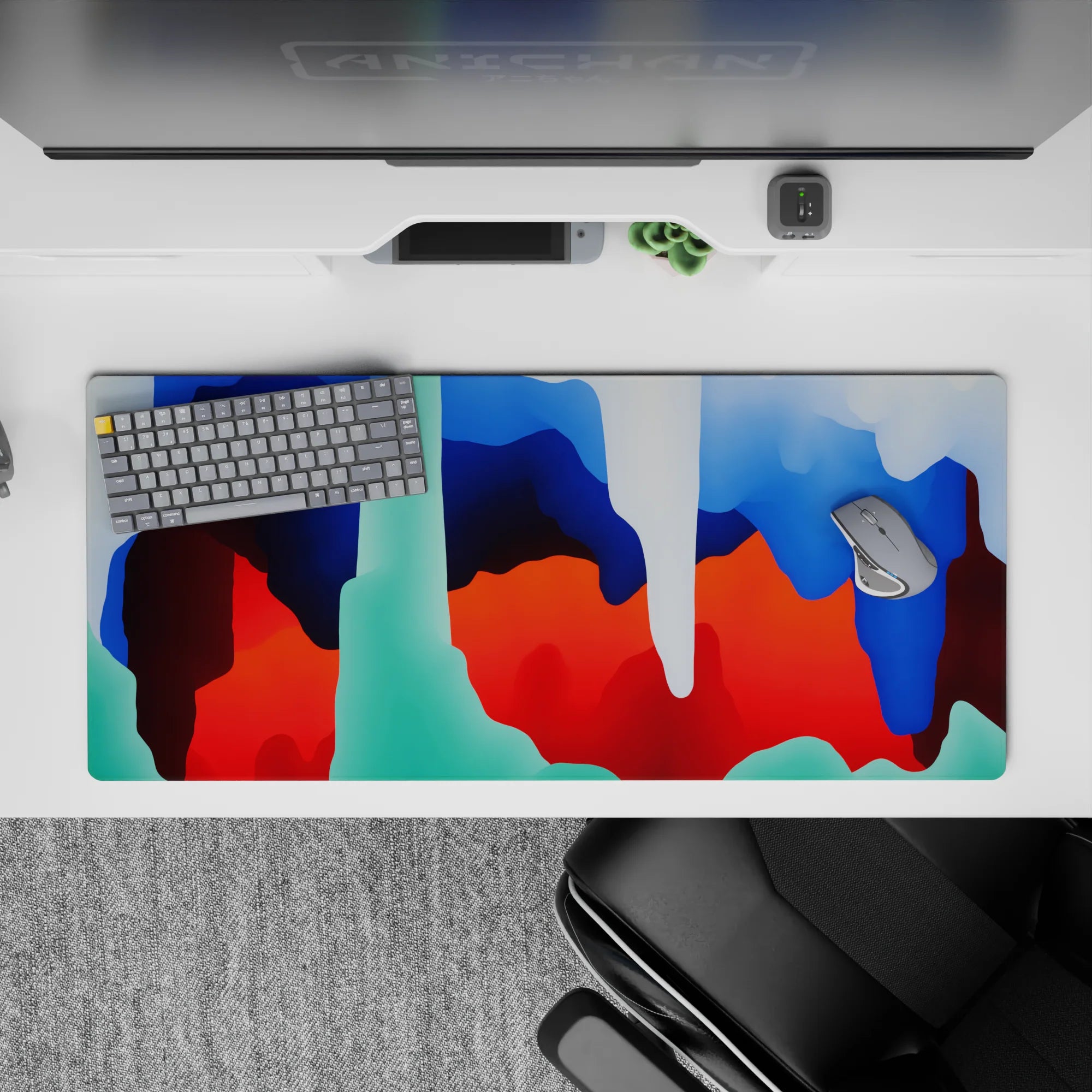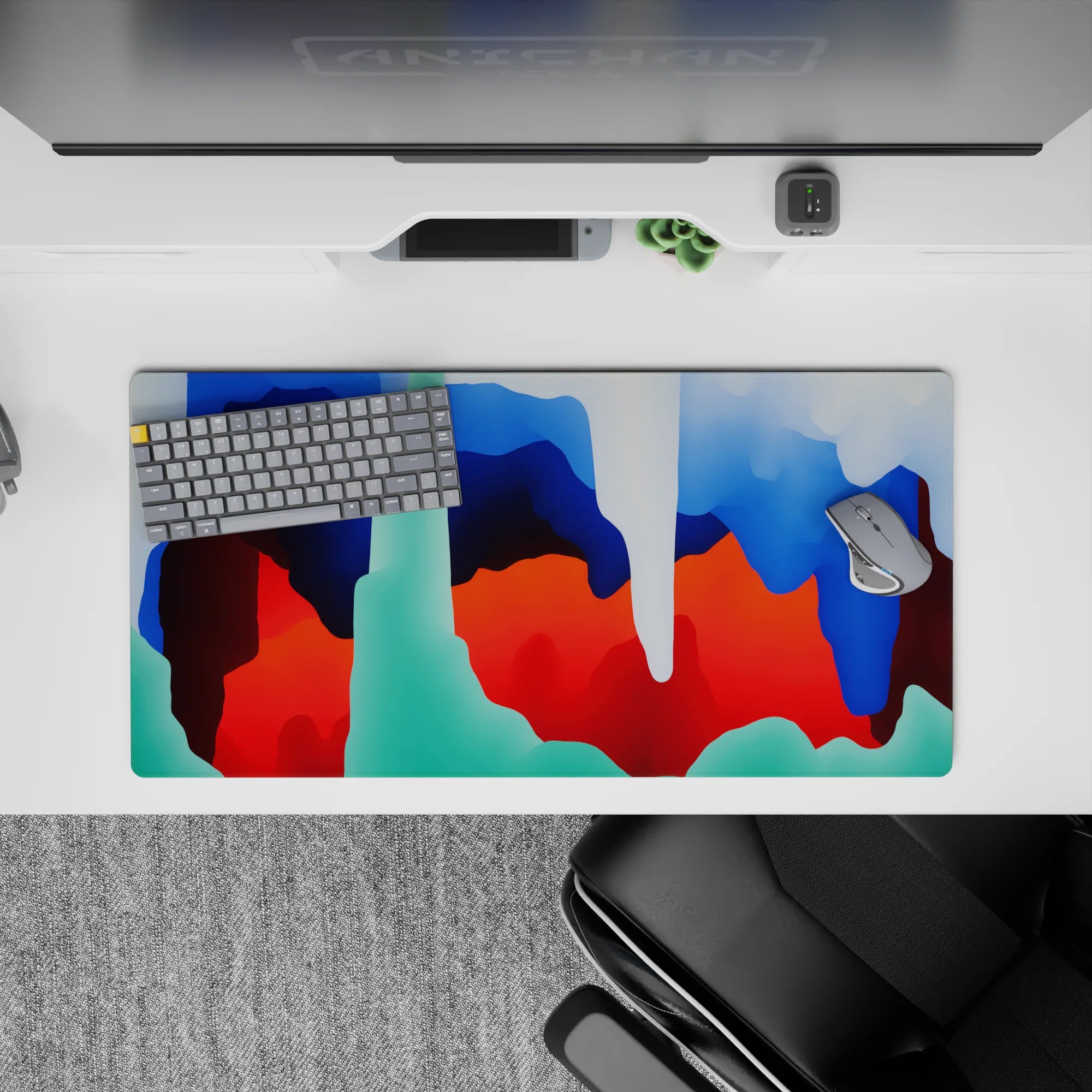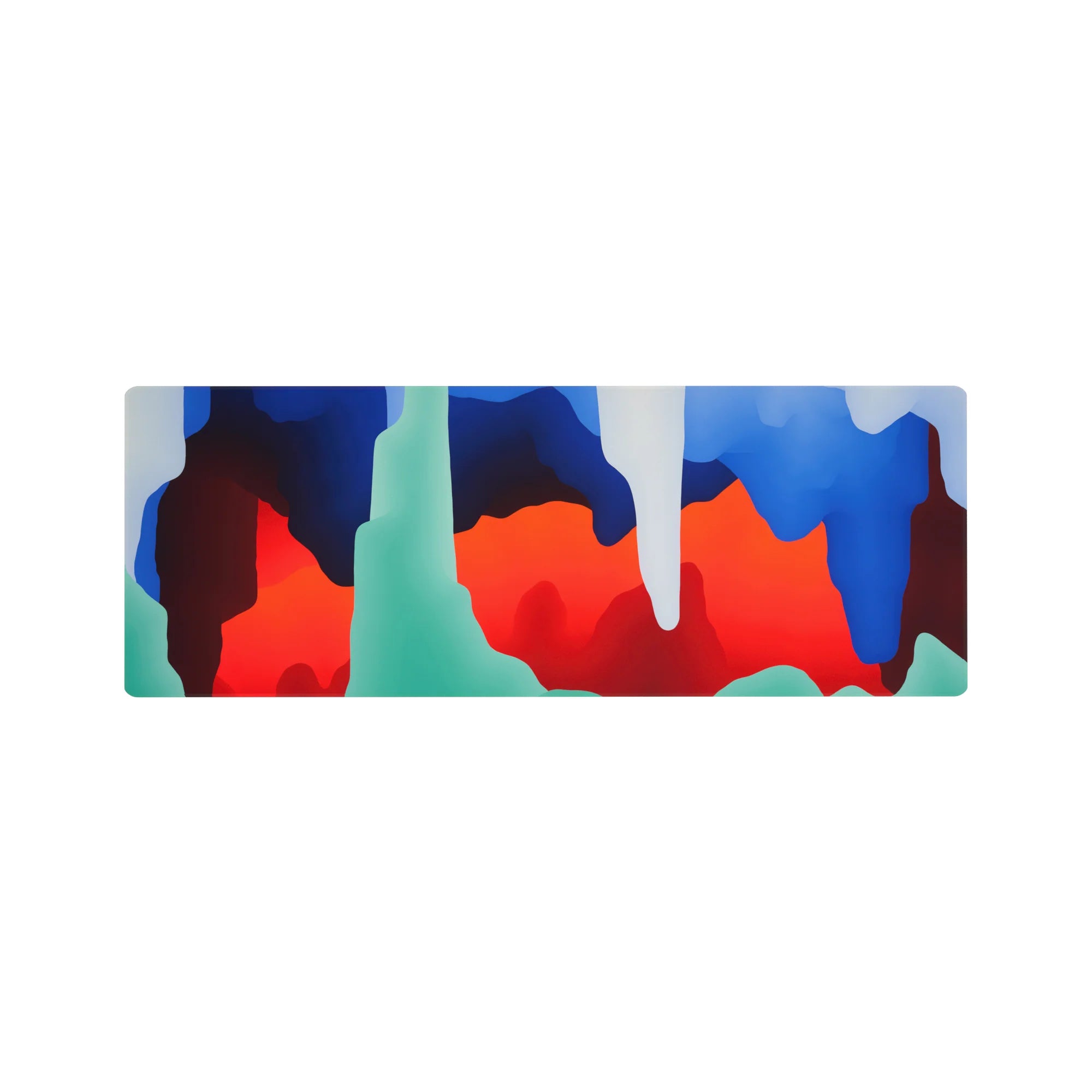 Add a burst of color to your workspace with this abstract deskmat. Featuring bold blue, red, and green swirls that evoke movement and fluidity, this design brings modern energy to your desk. Perfect for fans of abstract art and creative workspaces.