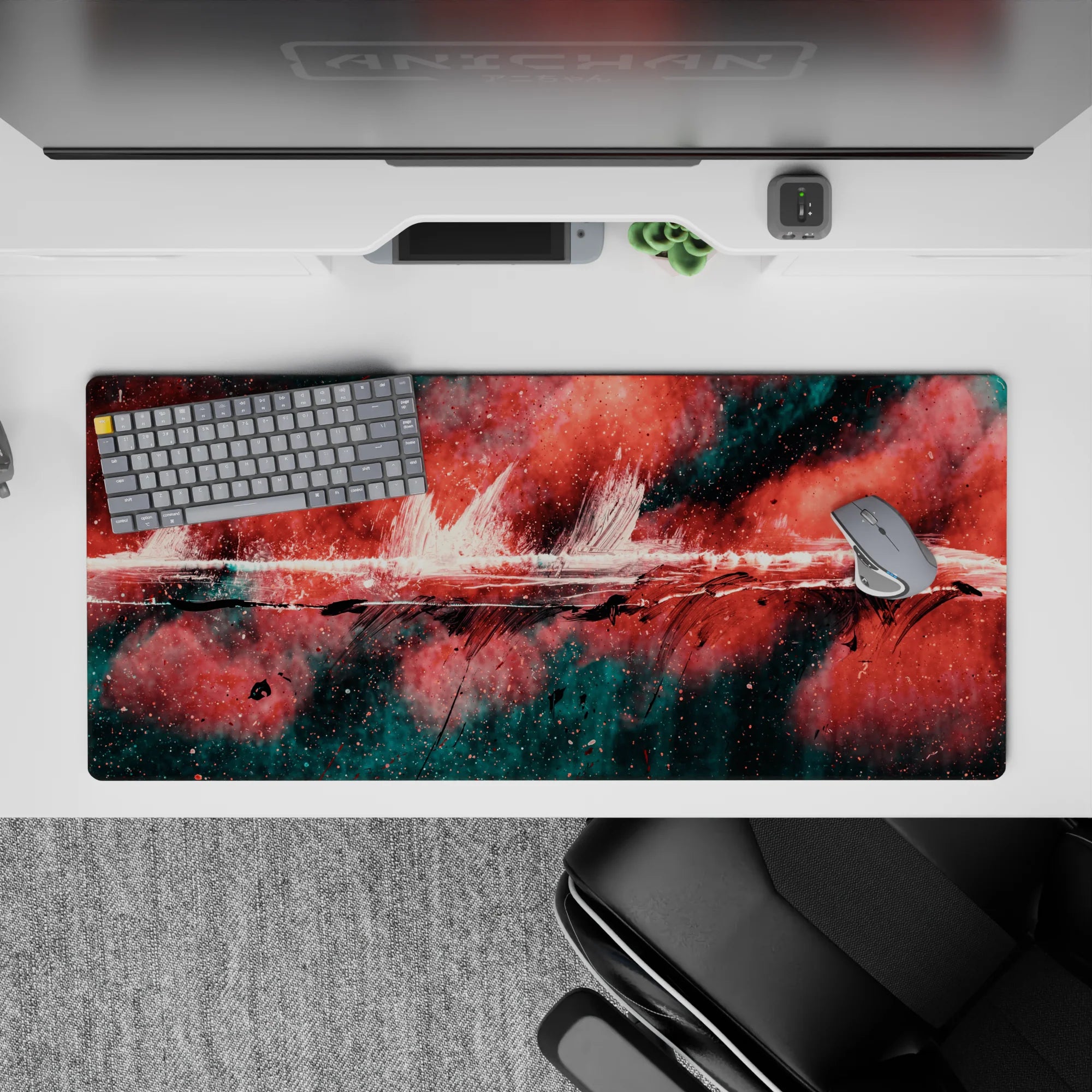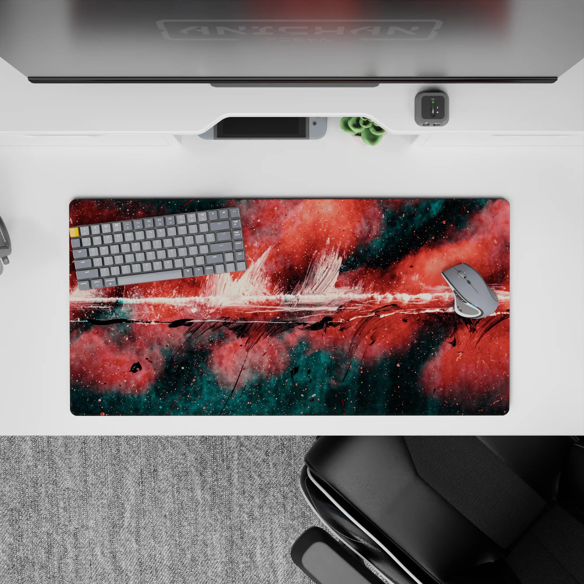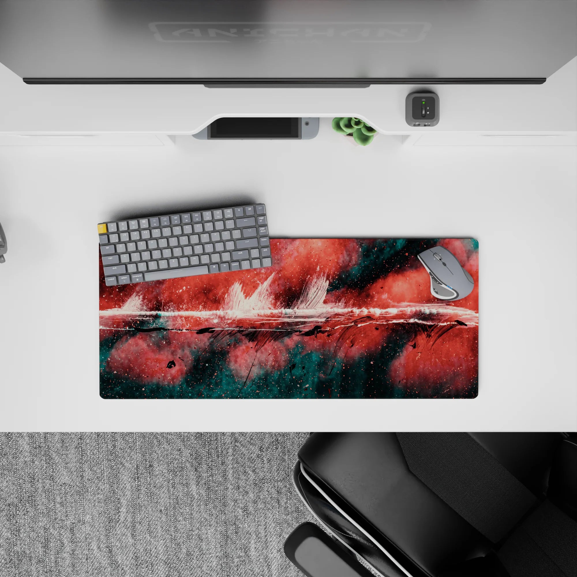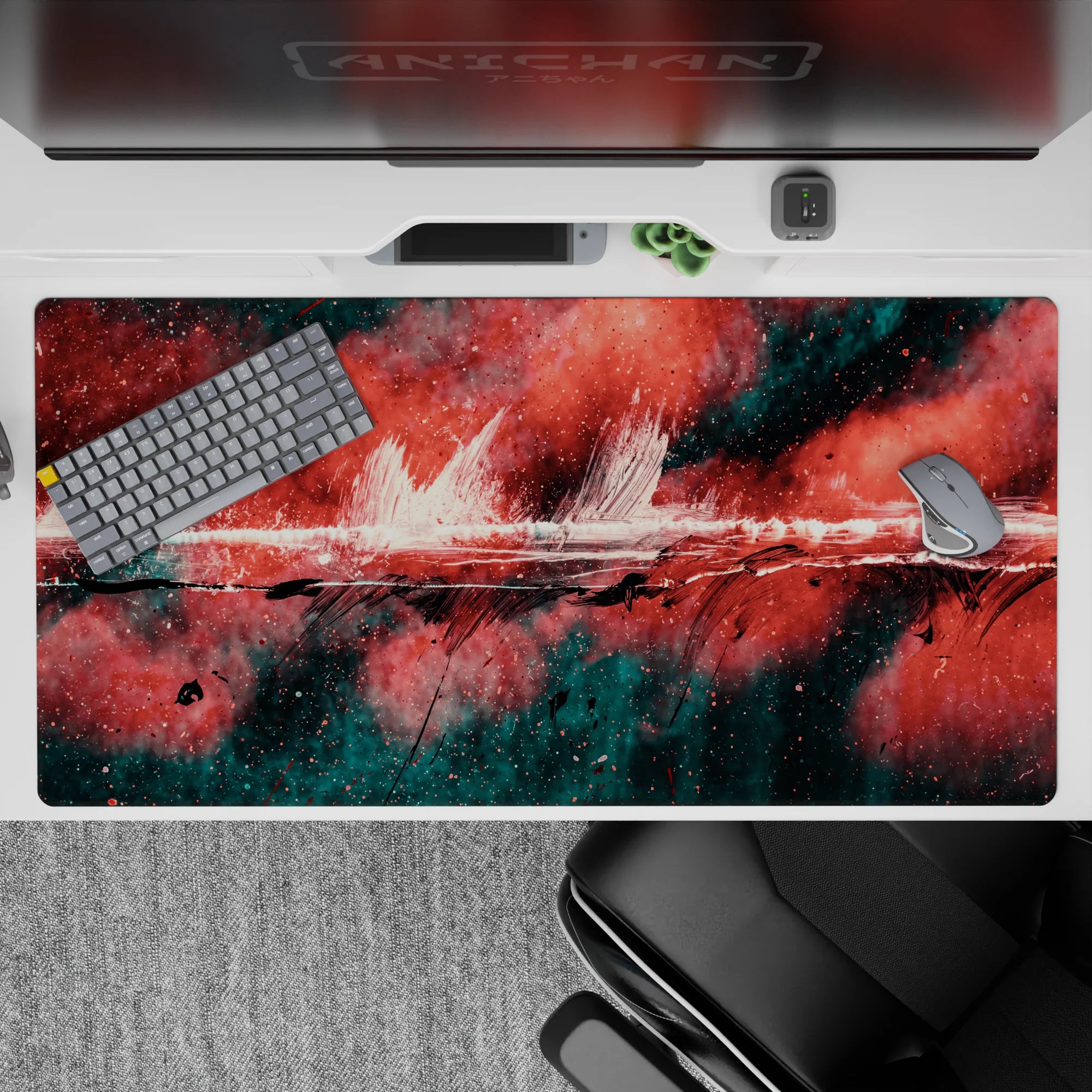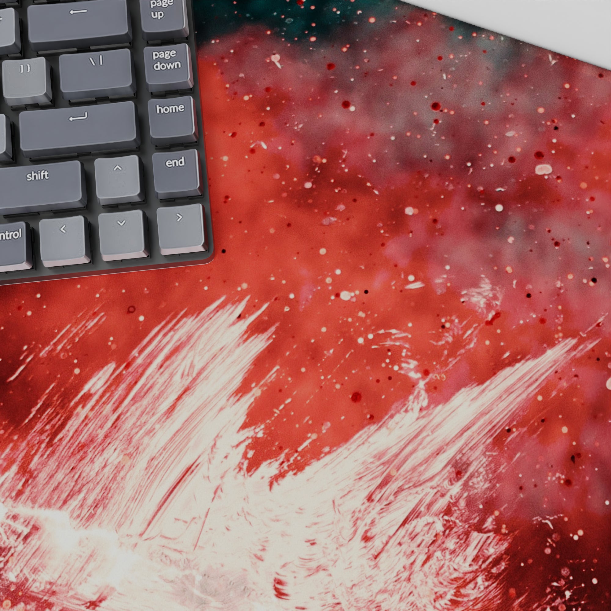 Add a burst of creativity to your workspace with this abstract deskmat featuring bold strokes of red, black, and teal. The dynamic design exudes raw energy, perfect for those who love making bold artistic statements. Transform your desk into a hub of inspiration.