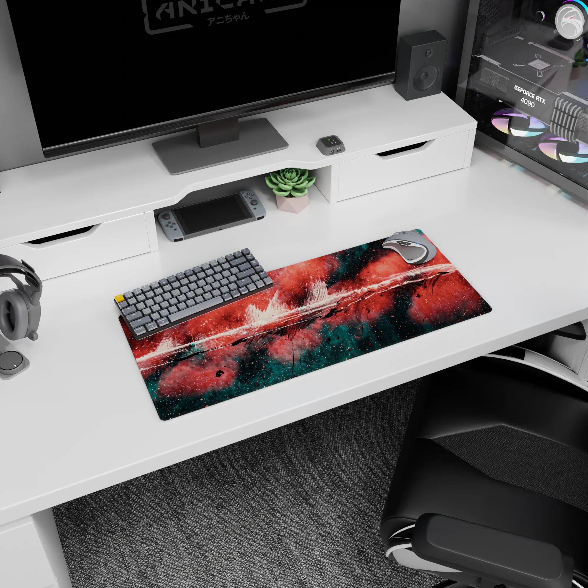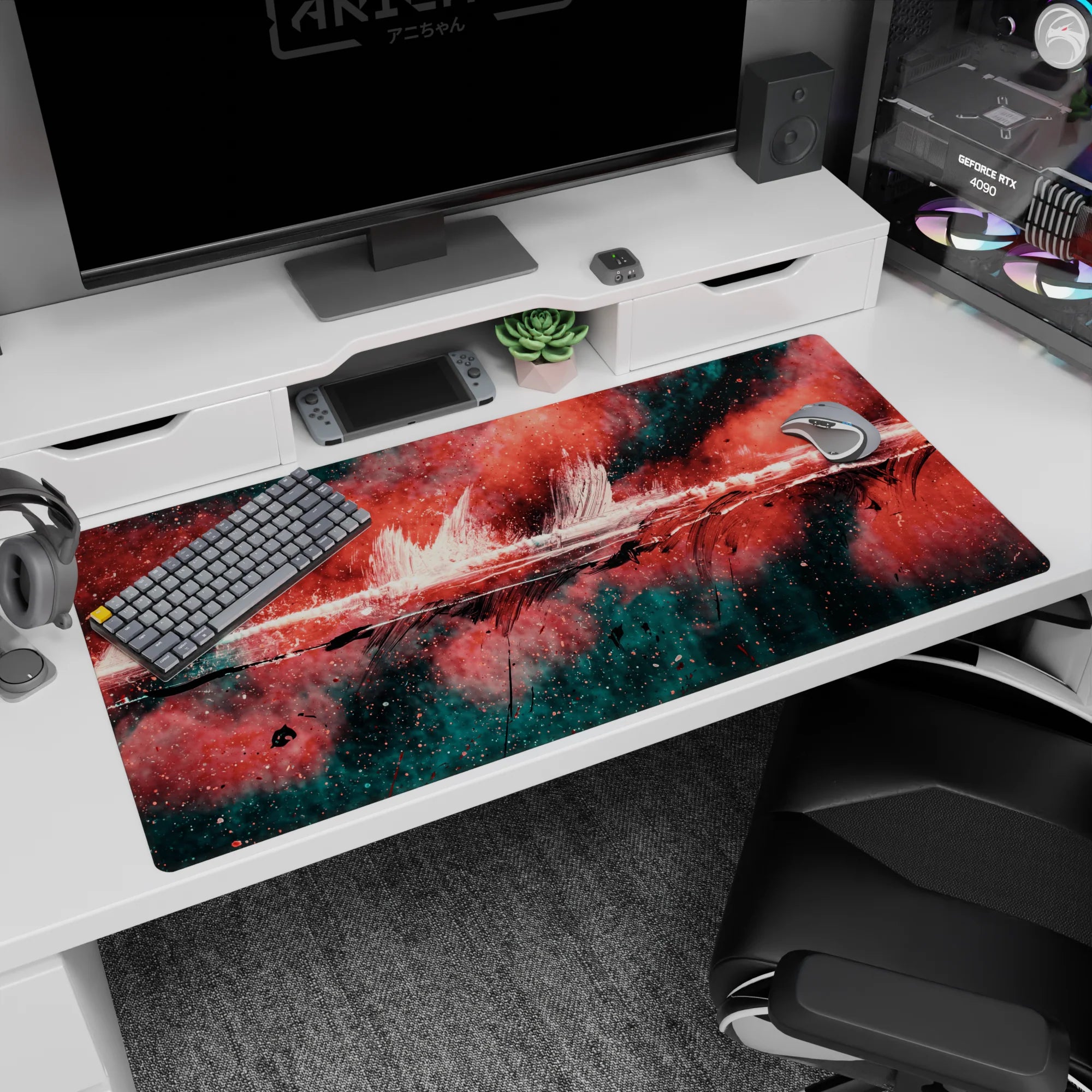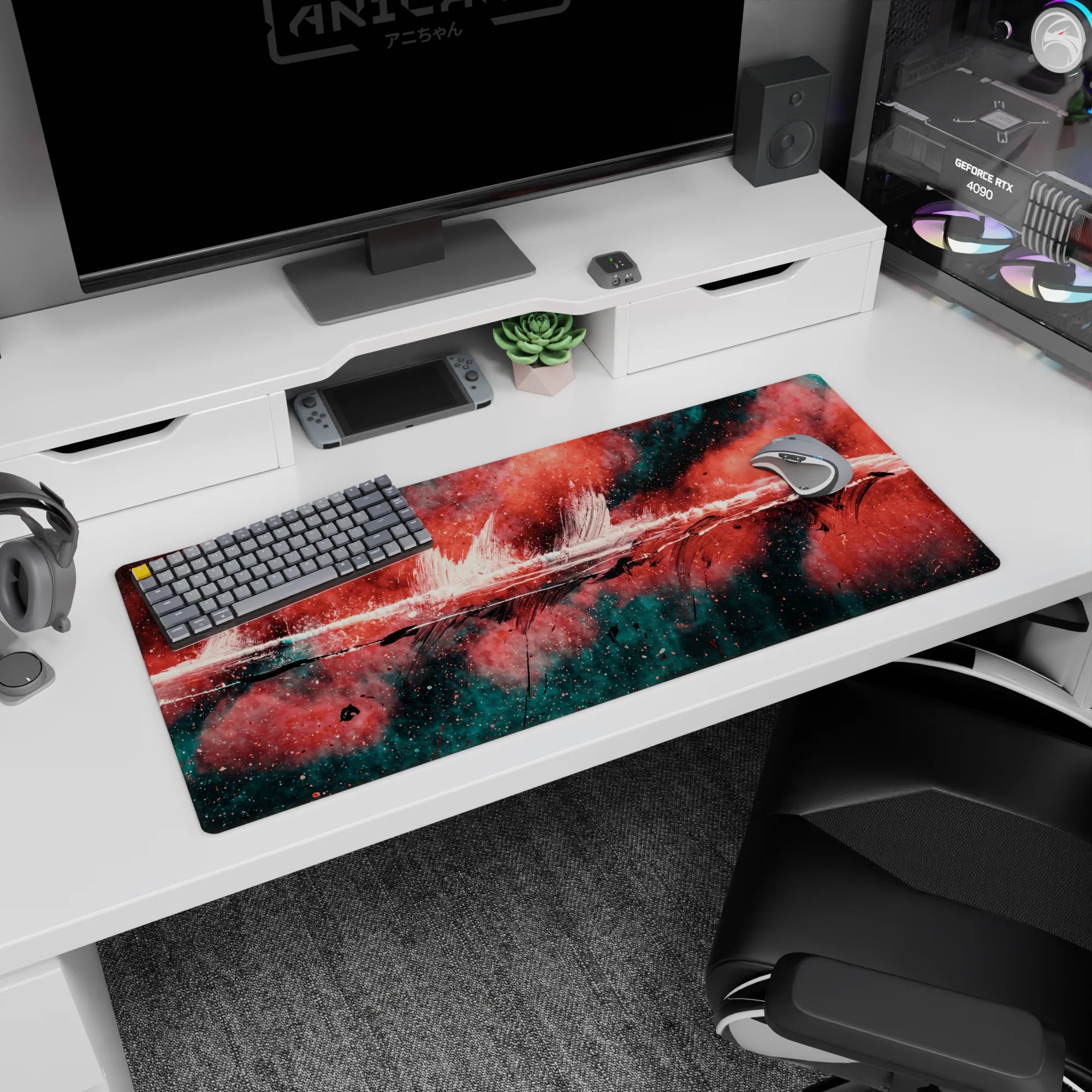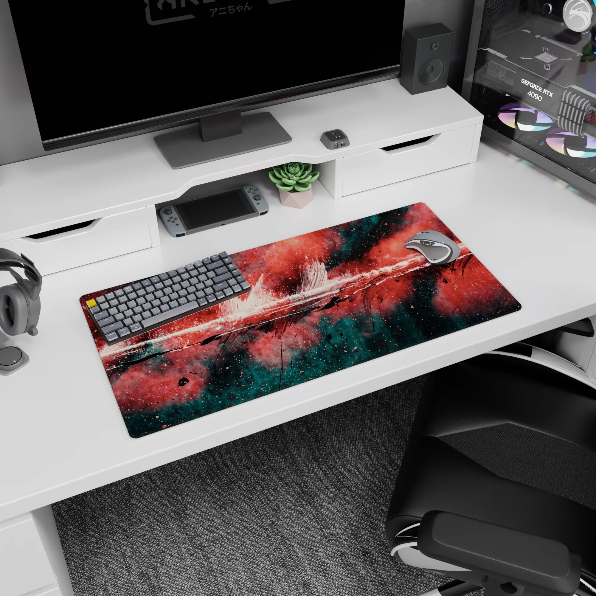 Add a burst of creativity to your workspace with this abstract deskmat featuring bold strokes of red, black, and teal. The dynamic design exudes raw energy, perfect for those who love making bold artistic statements. Transform your desk into a hub of inspiration.