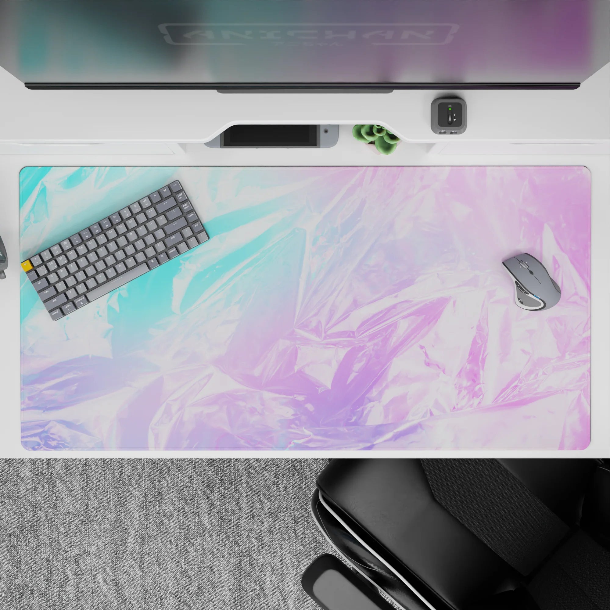 Add a touch of dreamy elegance to your desk with the Iridescent Bliss deskmat. Featuring swirling pastel hues of pink and blue with a soft, crinkled texture, this mat creates a soothing and beautiful workspace for focus and creativity.