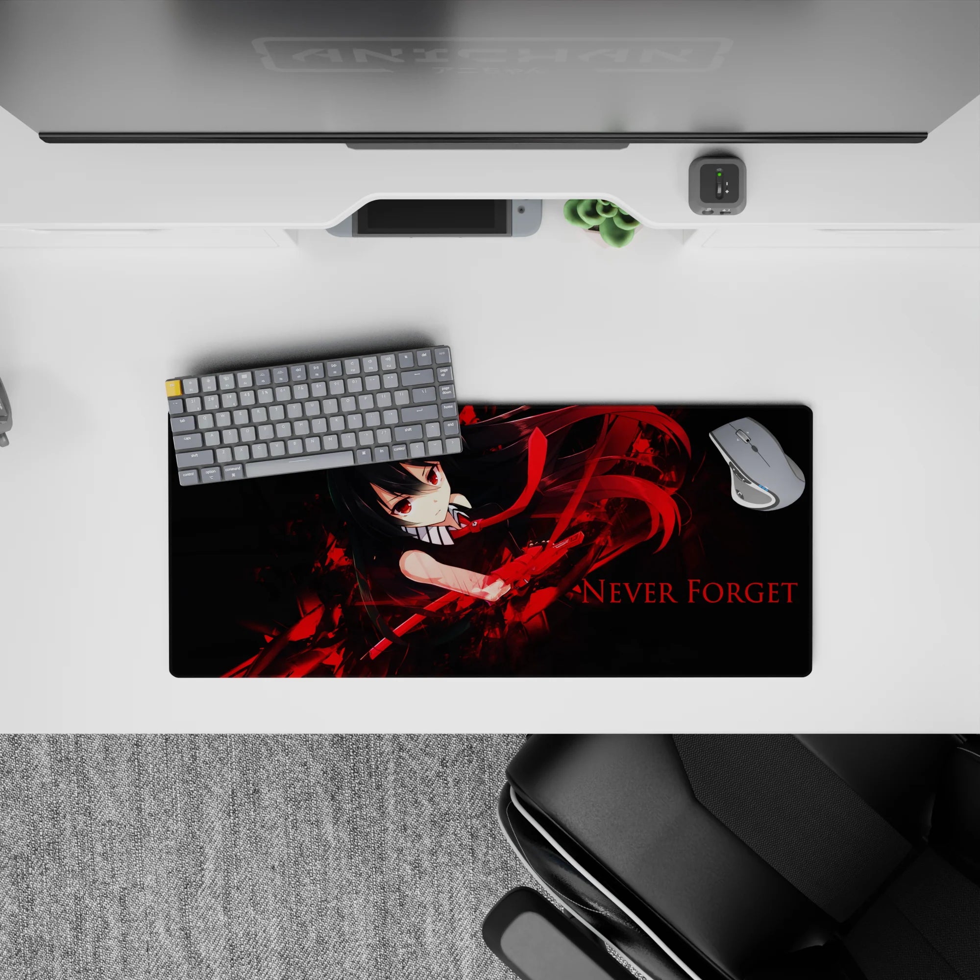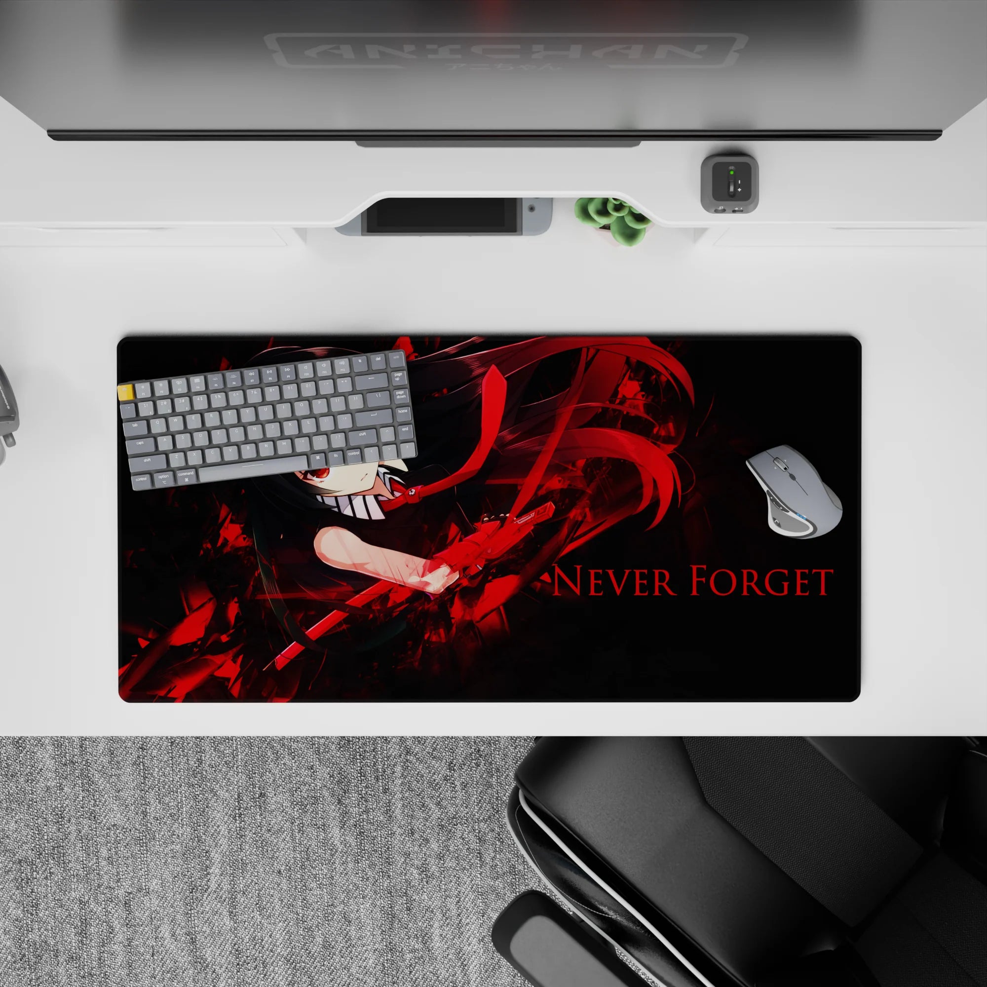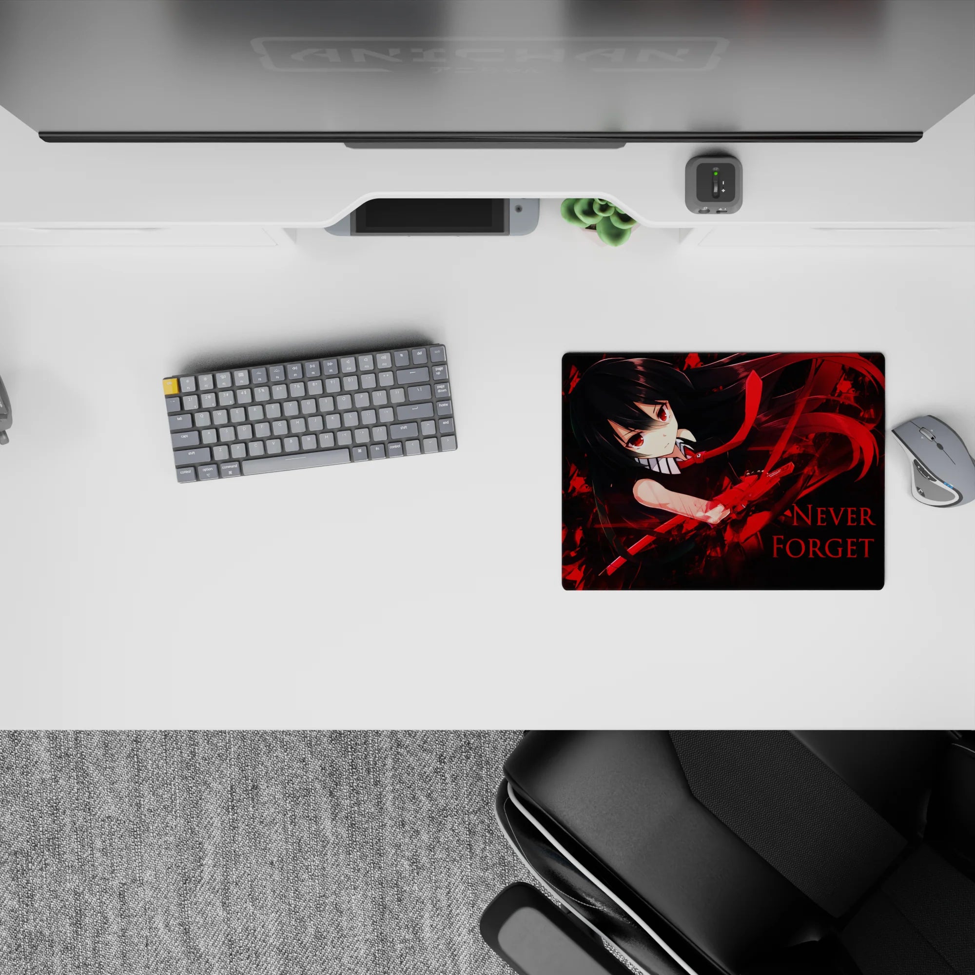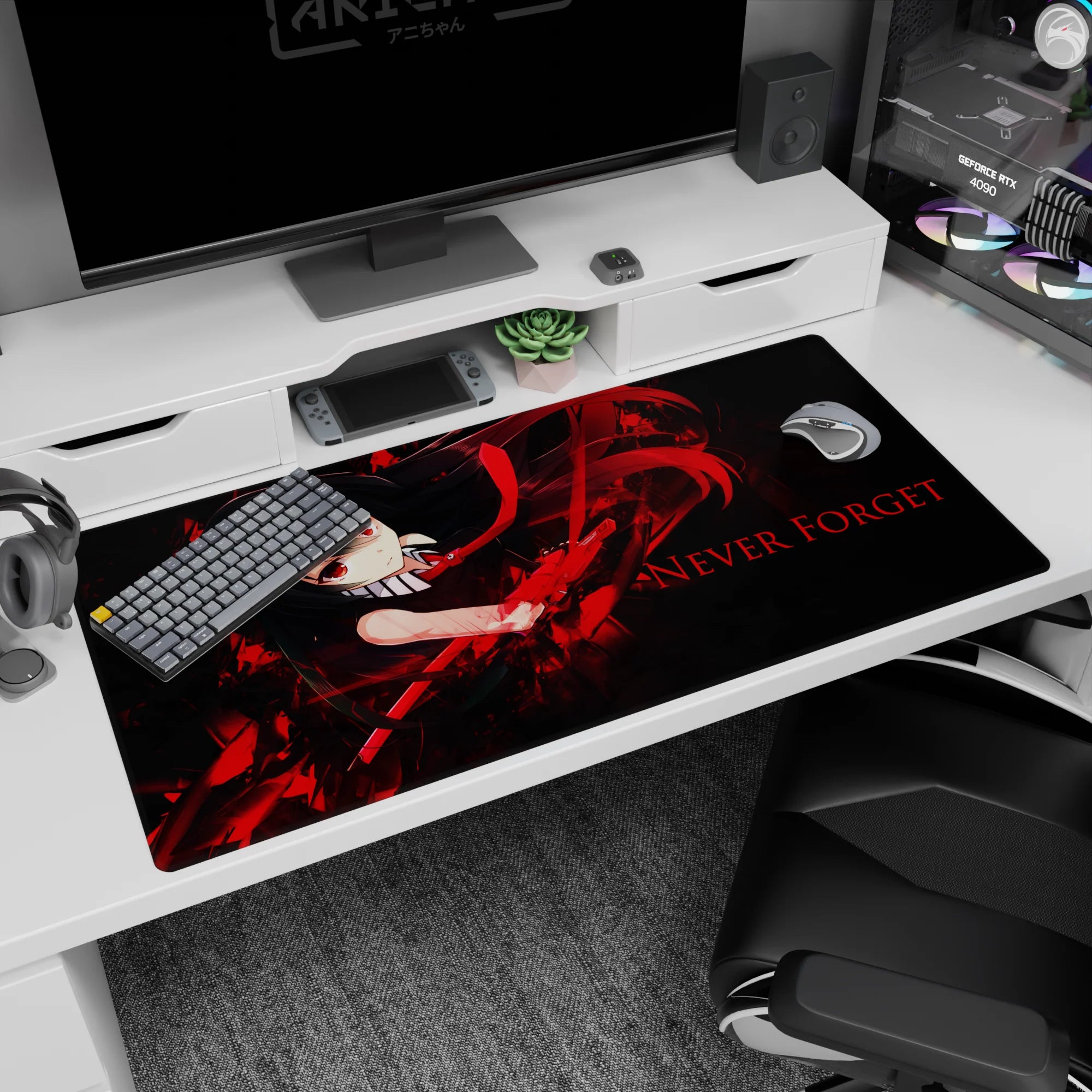 This anime mouse pad captures the unwavering Akame from Akame ga Kill, set against a powerful black and red contrast. Her piercing gaze and the Never Forget inscription make this an anime desk pad that embodies determination and sacrifice.