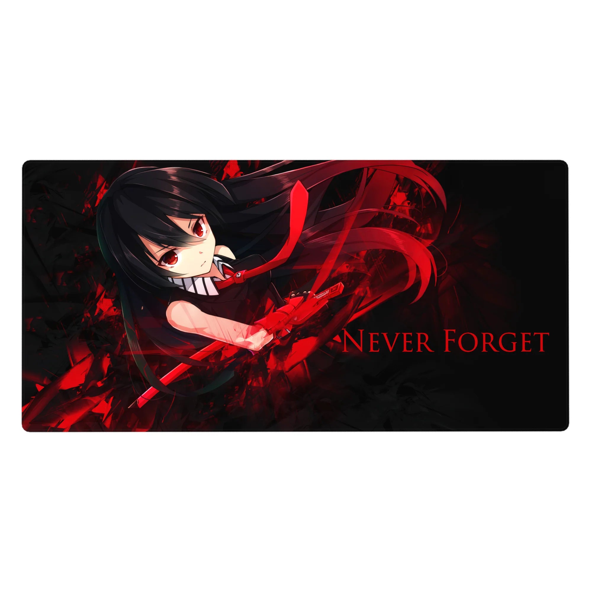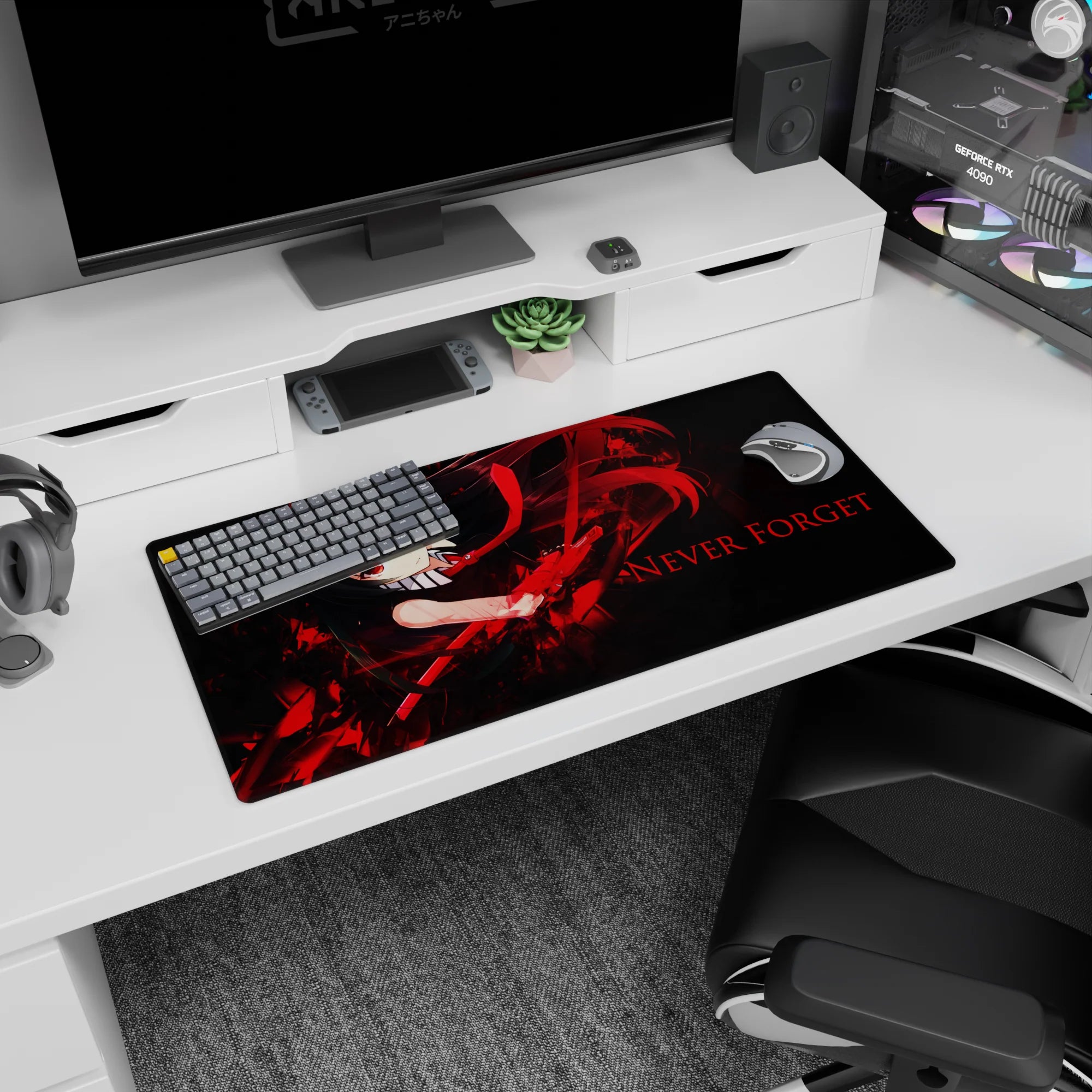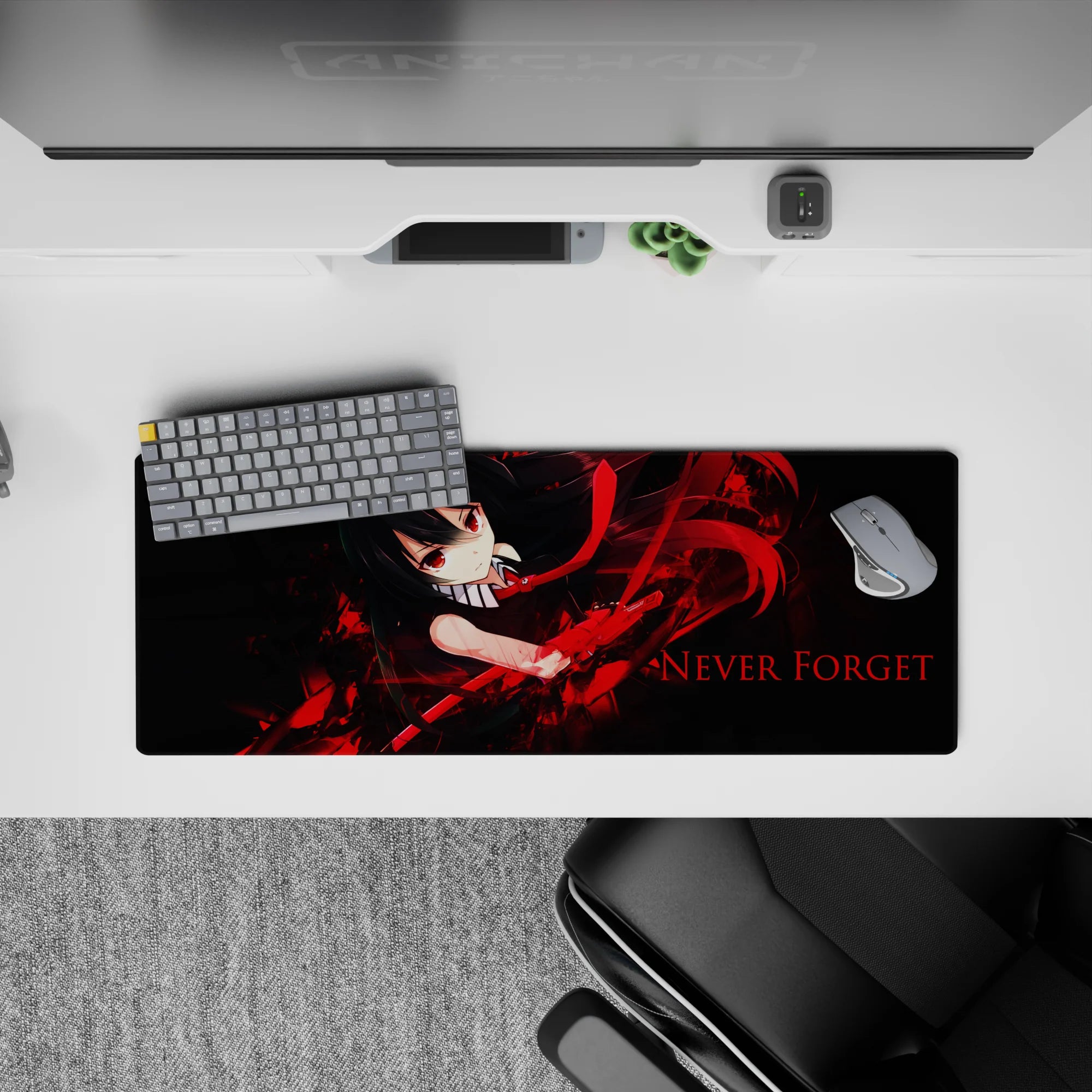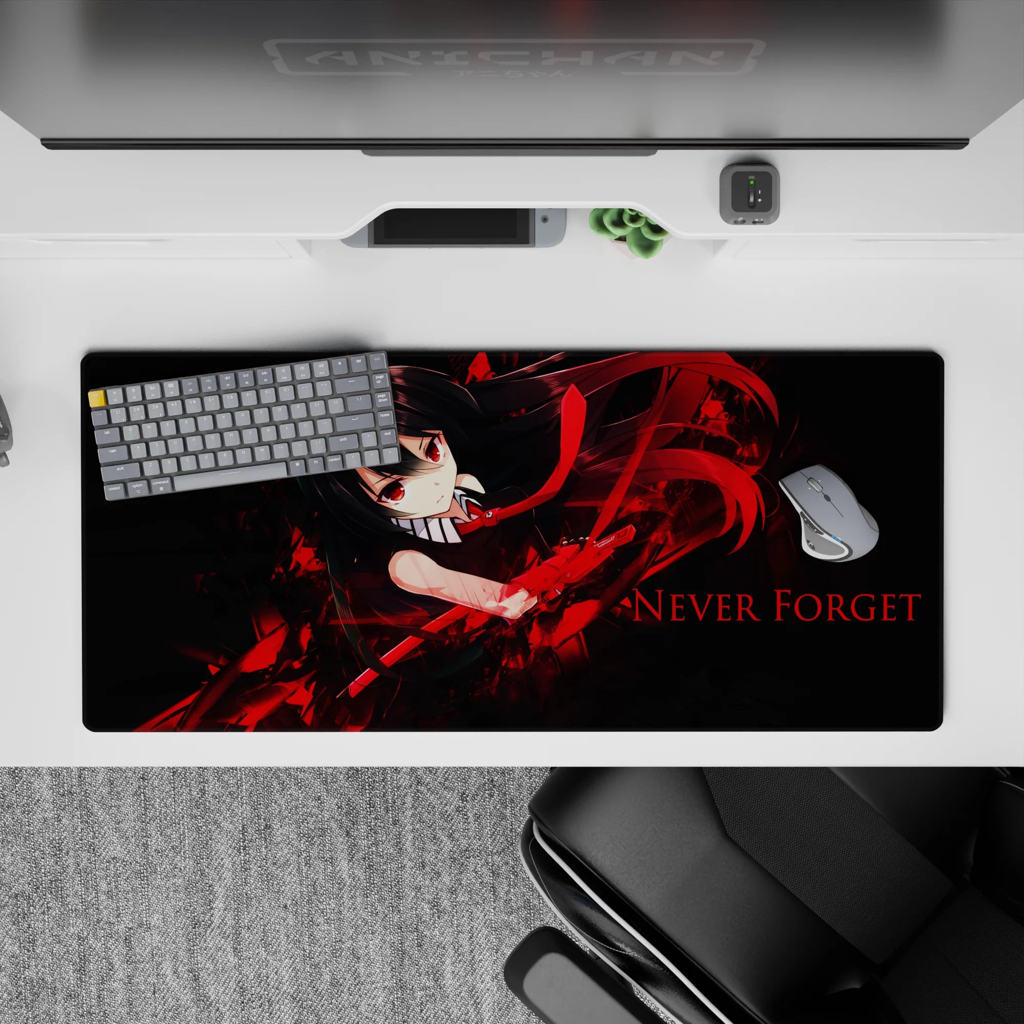 This anime mouse pad captures the unwavering Akame from Akame ga Kill, set against a powerful black and red contrast. Her piercing gaze and the Never Forget inscription make this an anime desk pad that embodies determination and sacrifice.