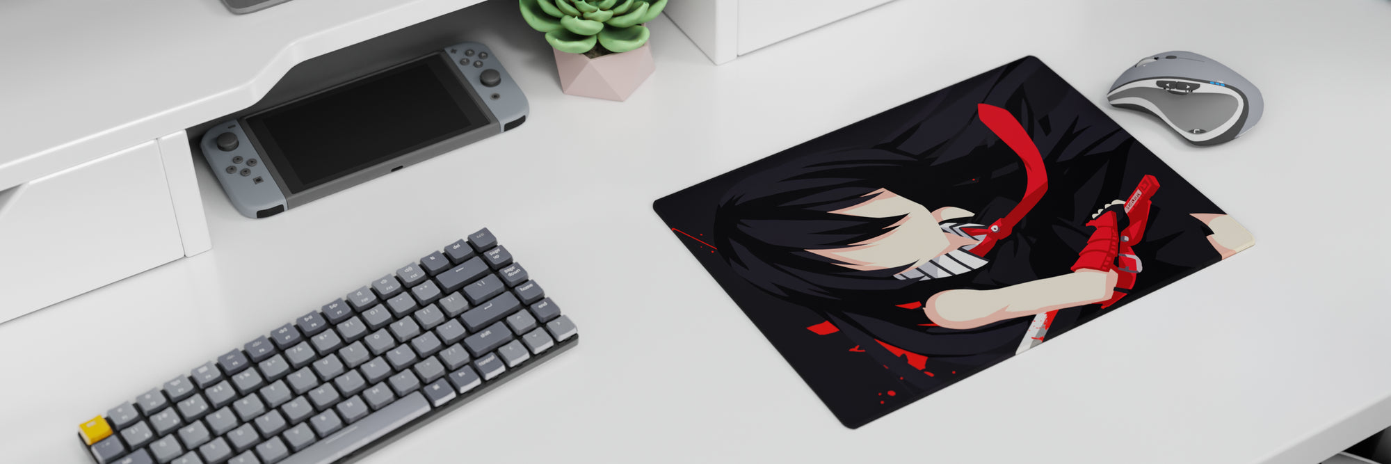 Akame takes on a sharp, minimalist style in this bold anime mouse pad. Strong lines, vivid contrast, and splattered red details make it a standout piece for fans of stylized edge and clean anime art.