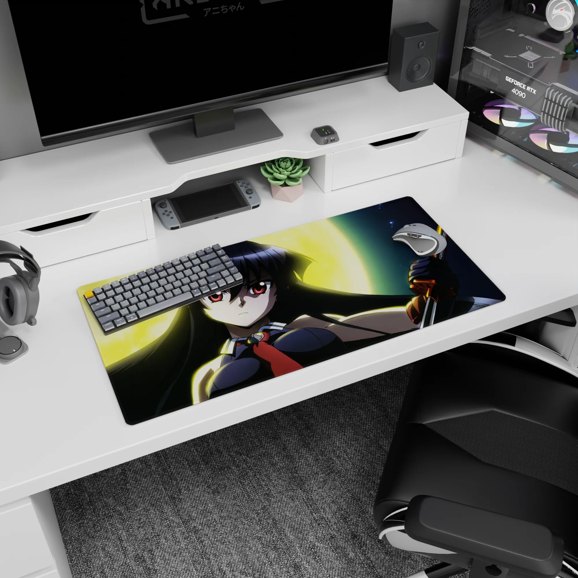 This anime mouse pad captures Akame from Akame ga Kill, standing against a radiant golden moon, her red eyes glowing with determination. A stunning anime desk pad for those drawn to power, fate, and dramatic contrasts.