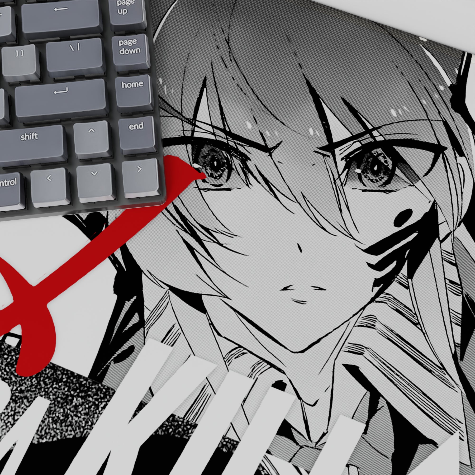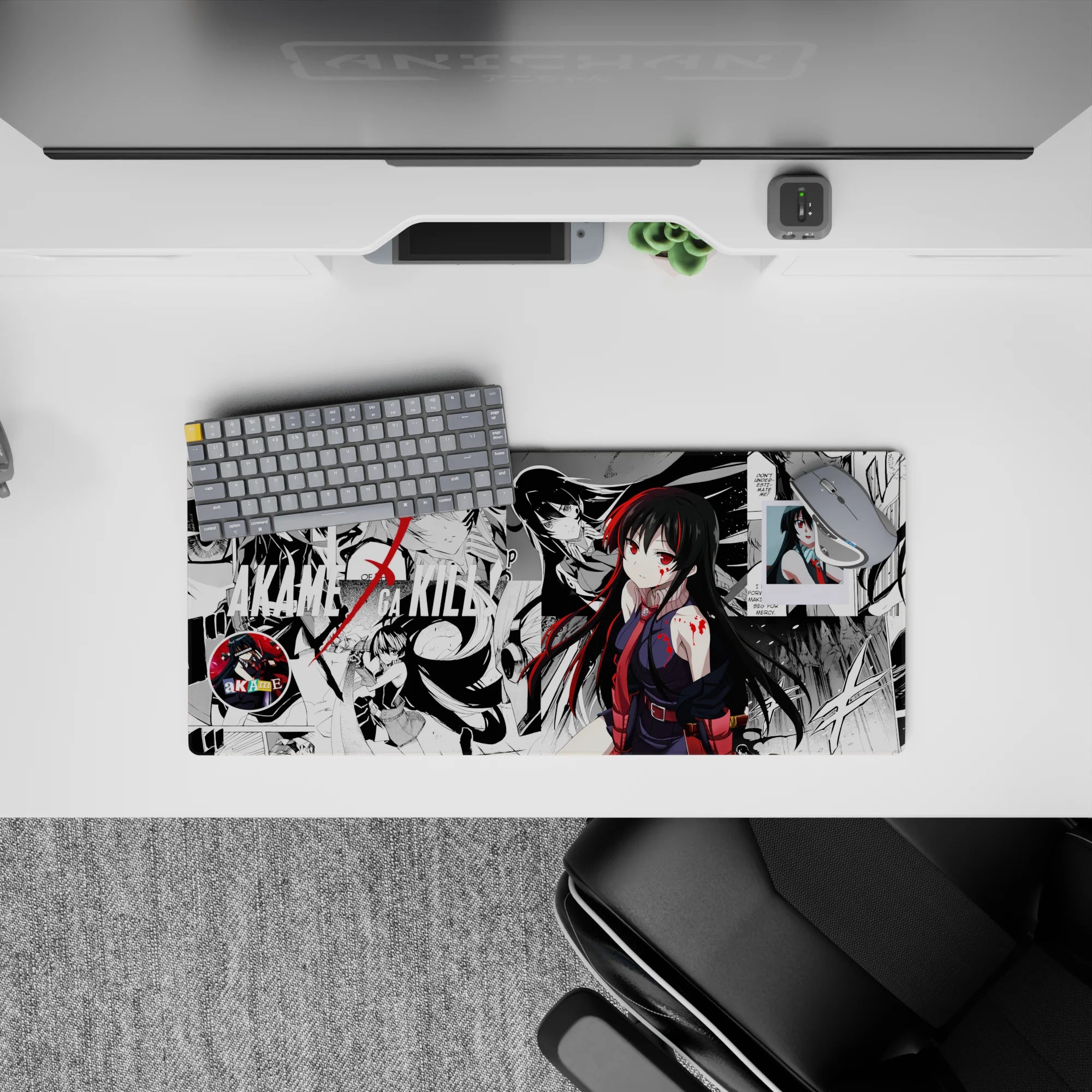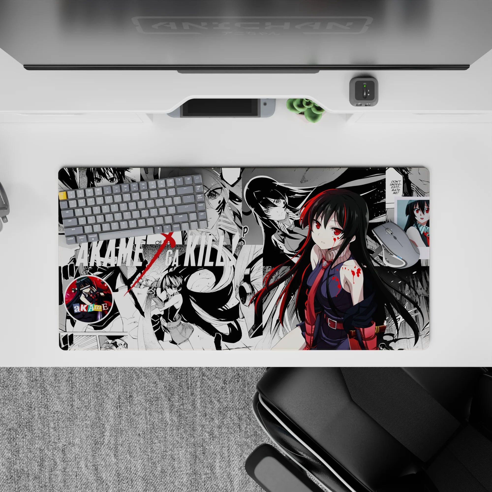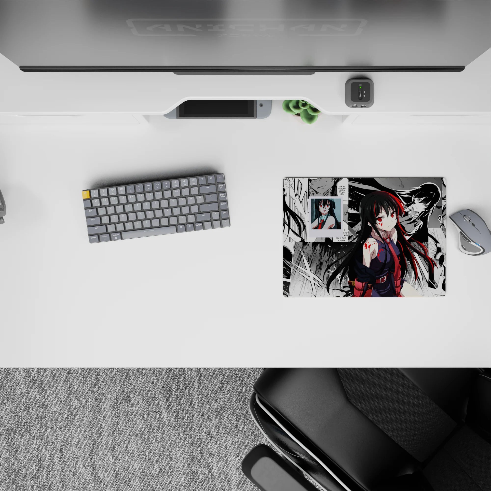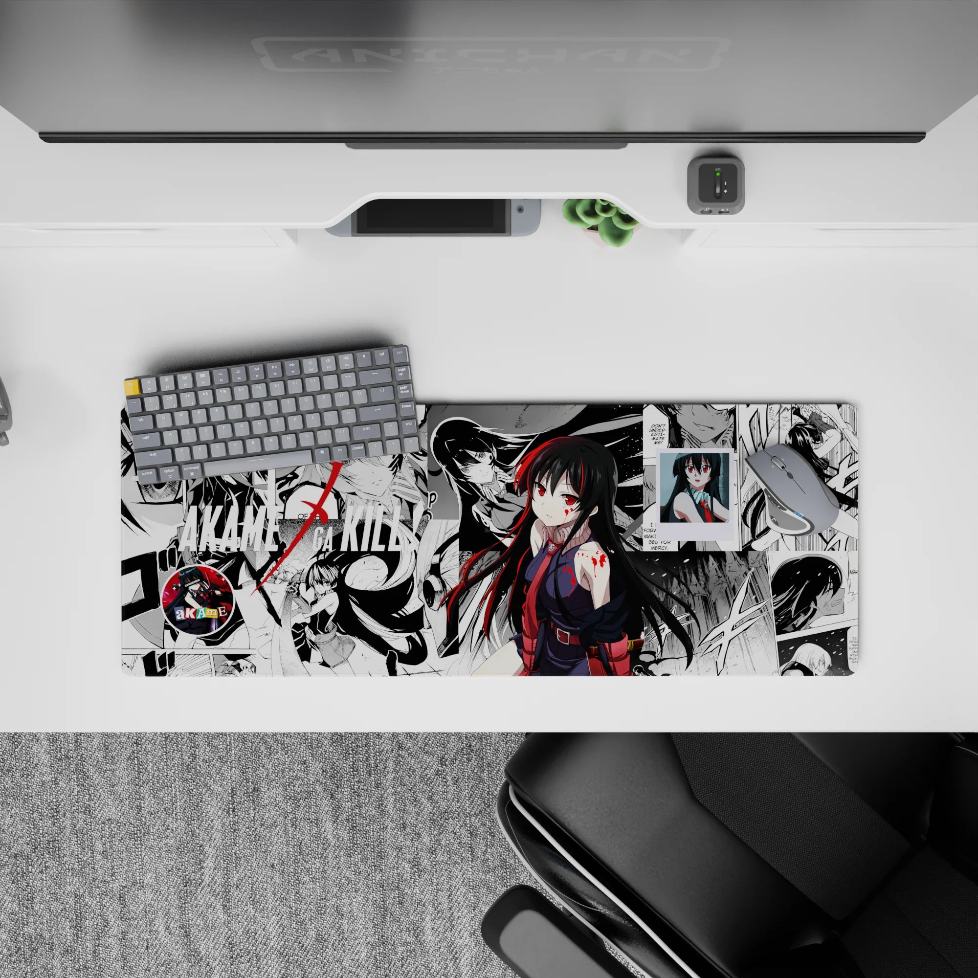 This anime mouse pad showcases Akame from Akame ga Kill! in a manga-anime fusion, blending bold black-and-white panels with splashes of deep crimson. Perfect for fans seeking an action-packed and visually striking anime desk pad.