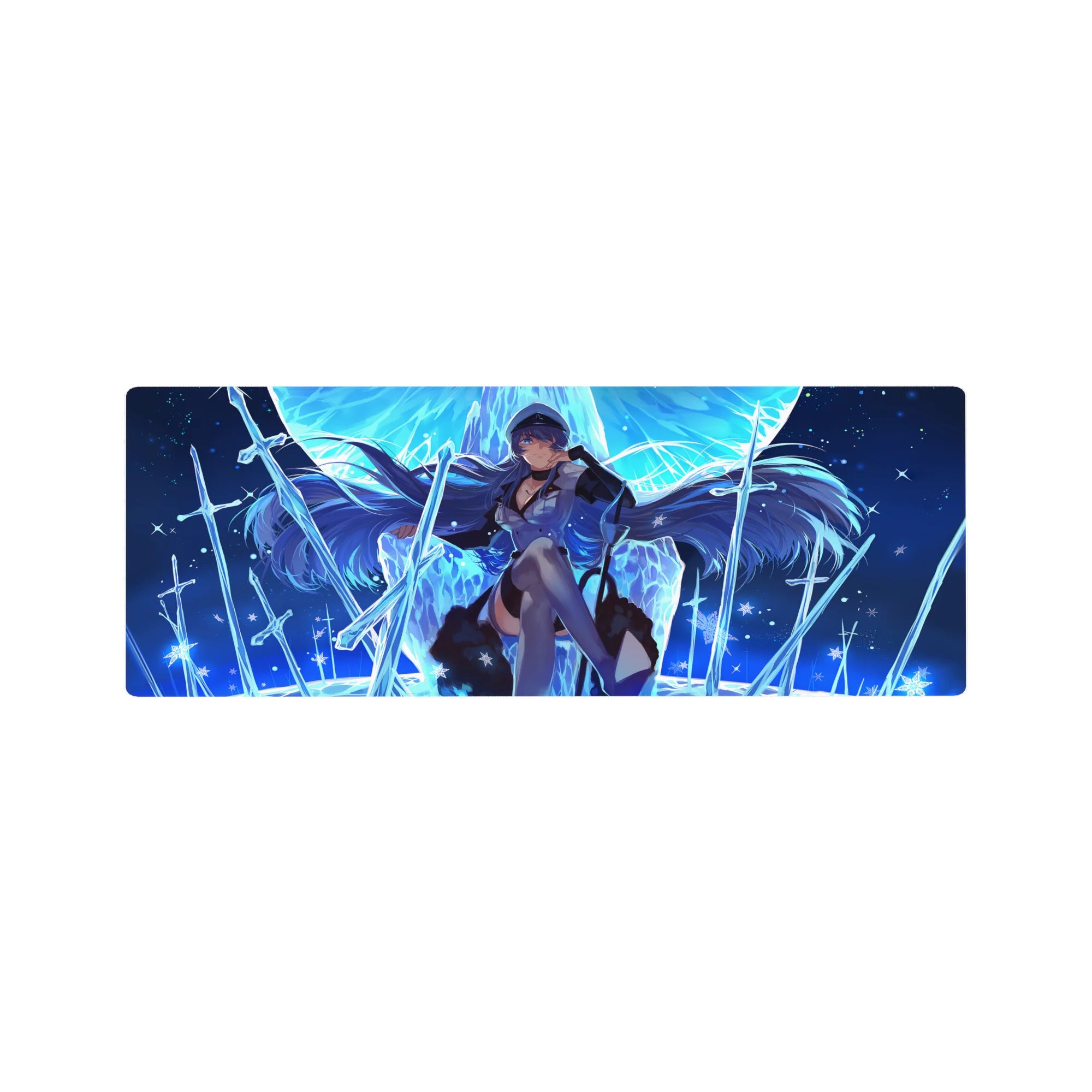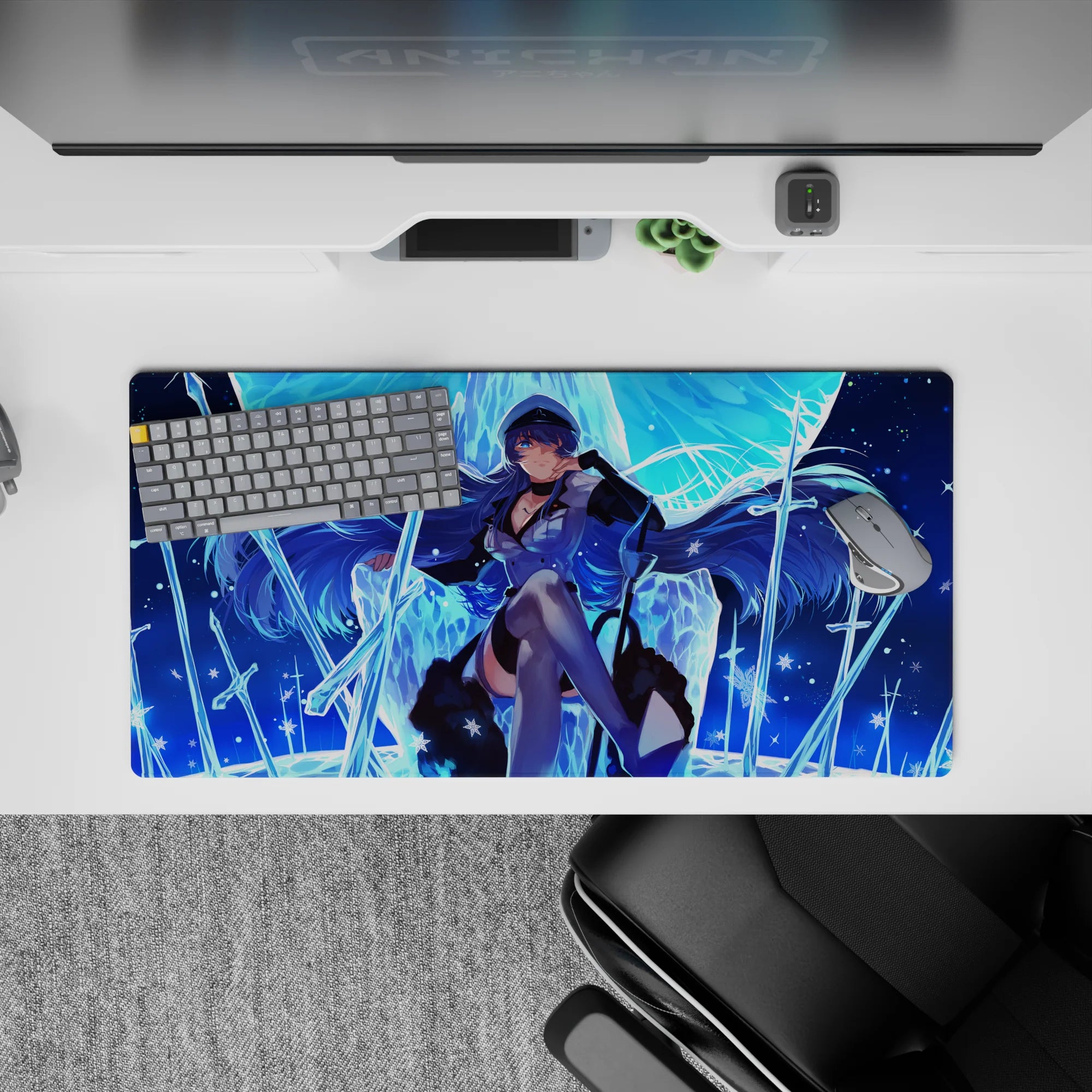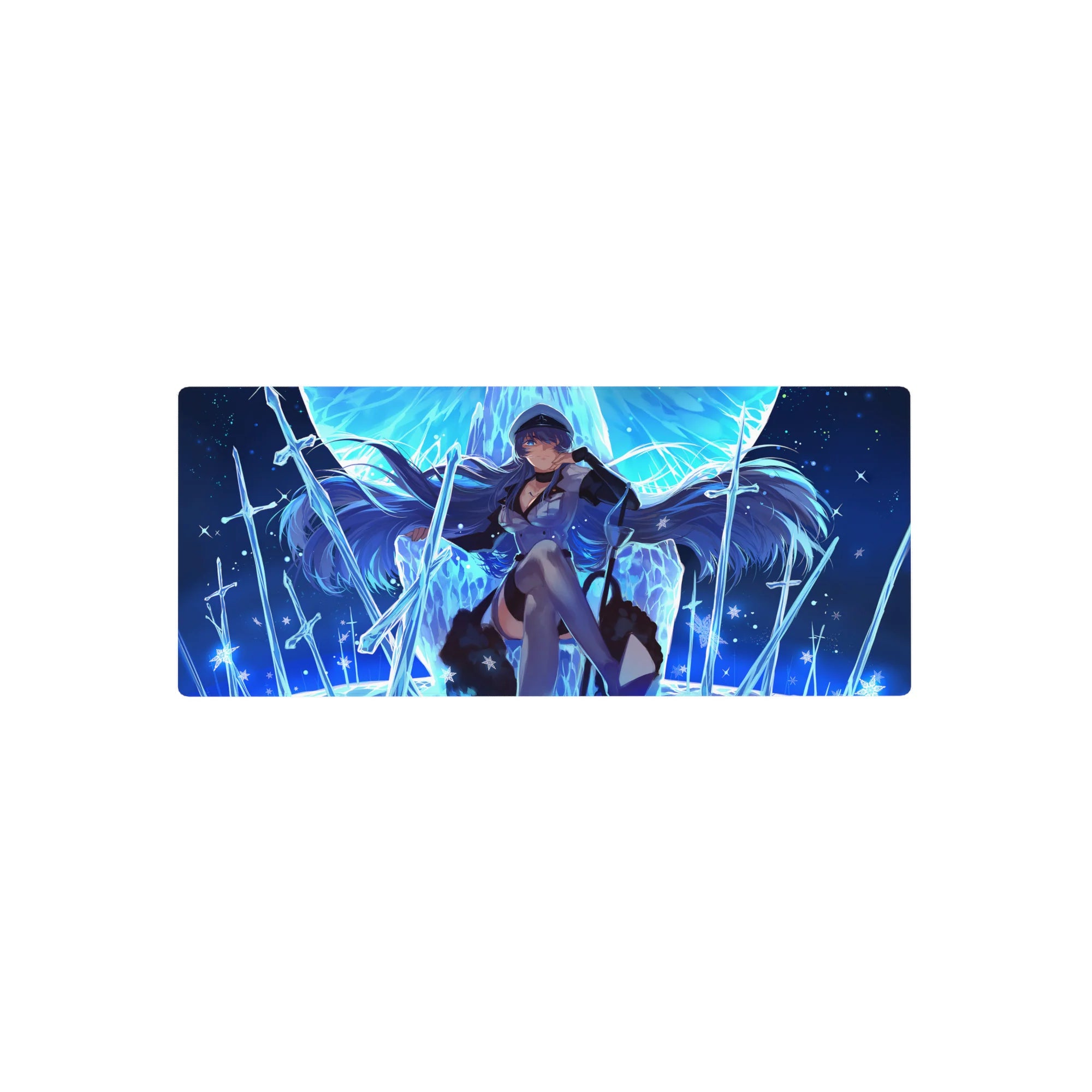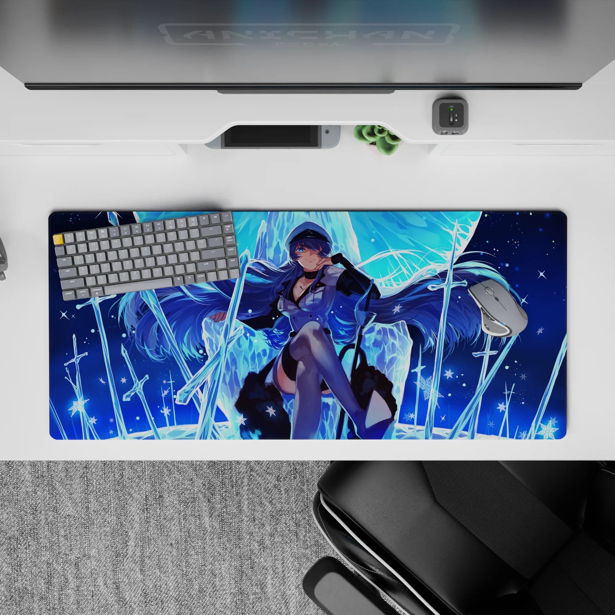 This anime mouse pad features Esdeath from Akame ga Kill, seated on a throne of glacial ice, surrounded by frozen swords under a midnight blue sky. A breathtaking anime desk pad for those who admire her chilling strength and beauty.