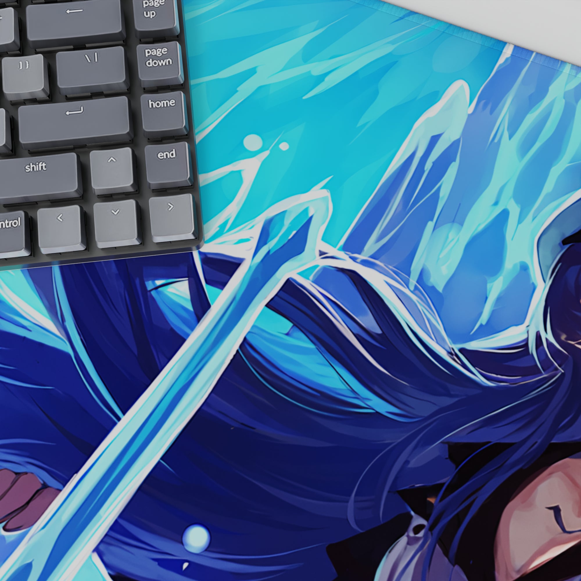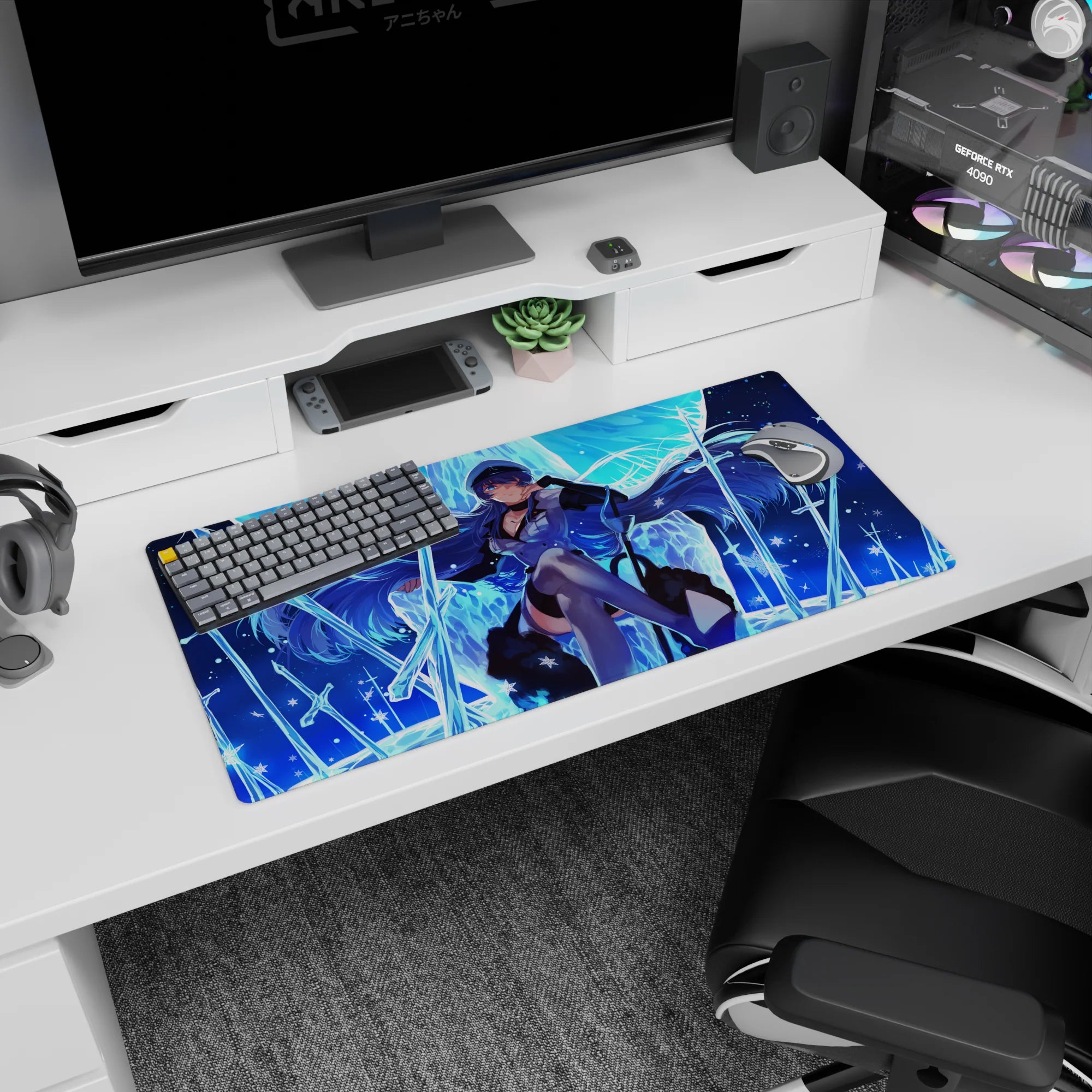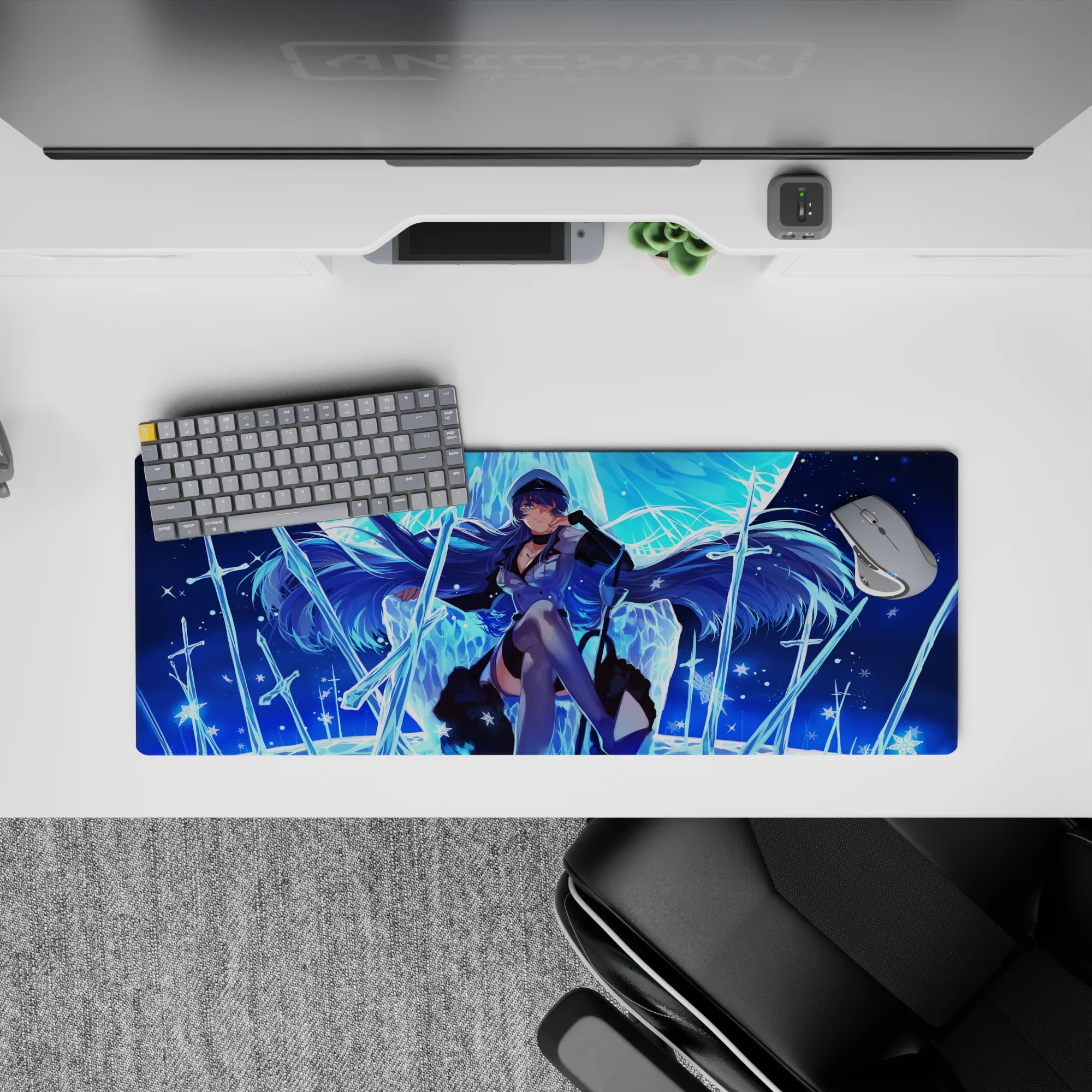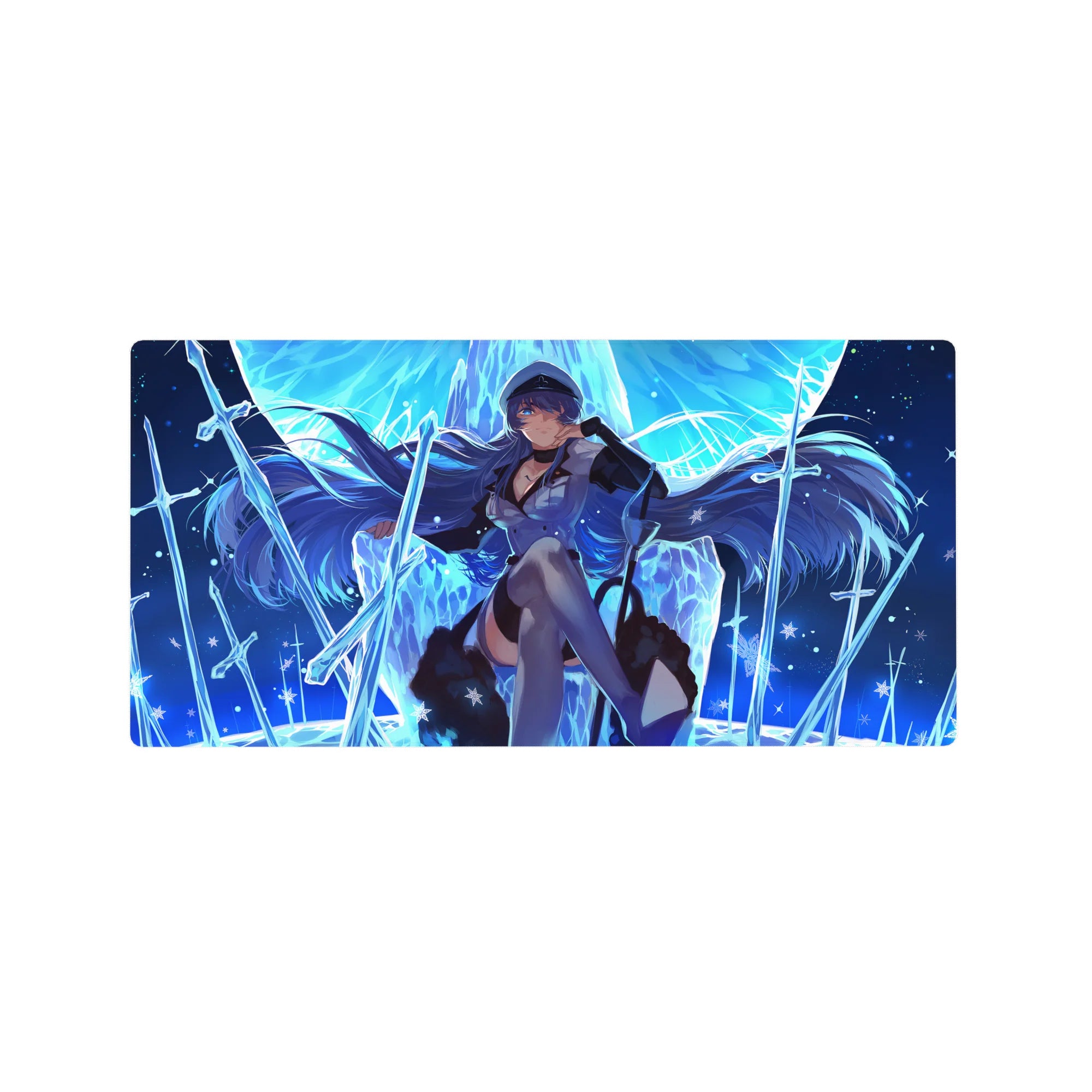 This anime mouse pad features Esdeath from Akame ga Kill, seated on a throne of glacial ice, surrounded by frozen swords under a midnight blue sky. A breathtaking anime desk pad for those who admire her chilling strength and beauty.