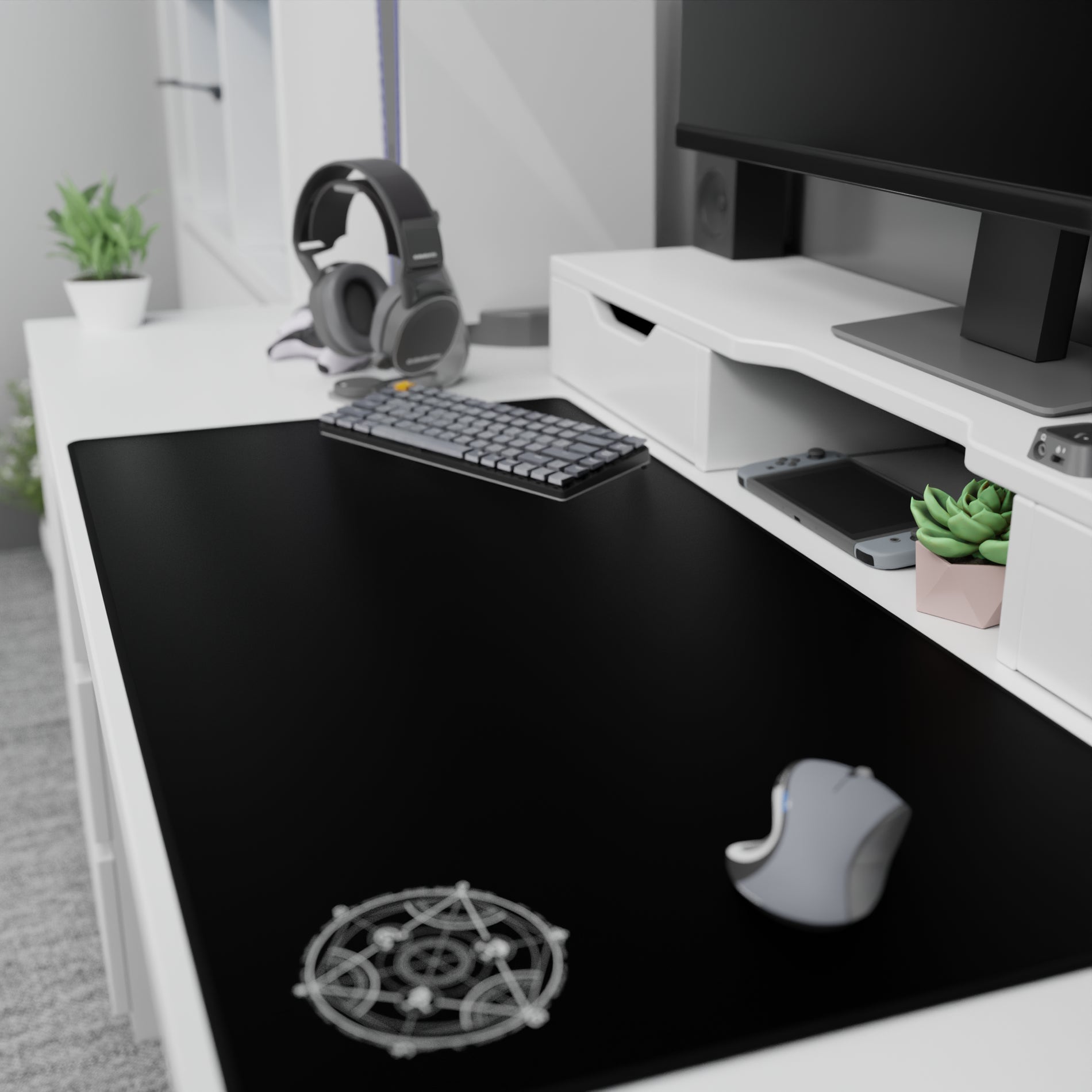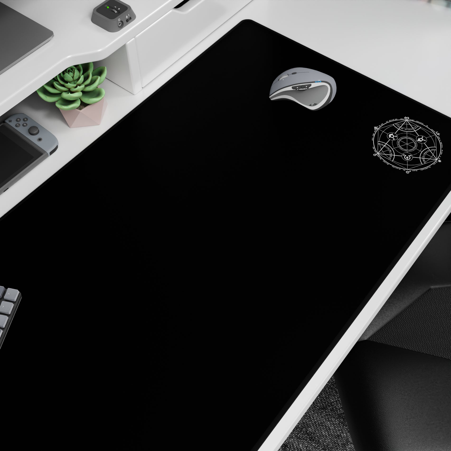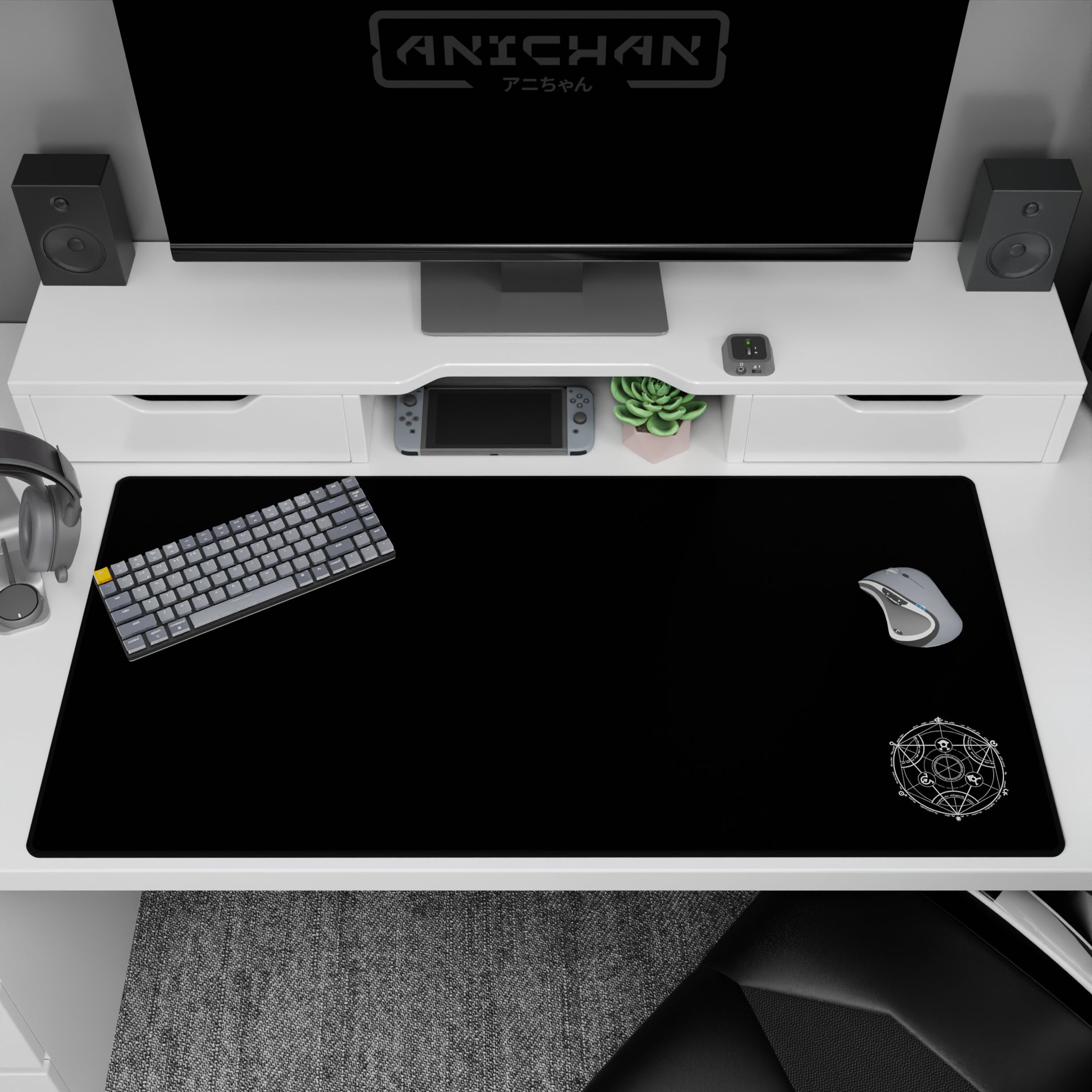 Midnight navy anime mouse pad inspired by Fullmetal Alchemist, with a crisp white alchemy circle and tiny symbols in the corner. Minimal, calm negative space, clean lines, secret-lab vibe; smooth glide for precise control and a quietly dramatic desk setup.