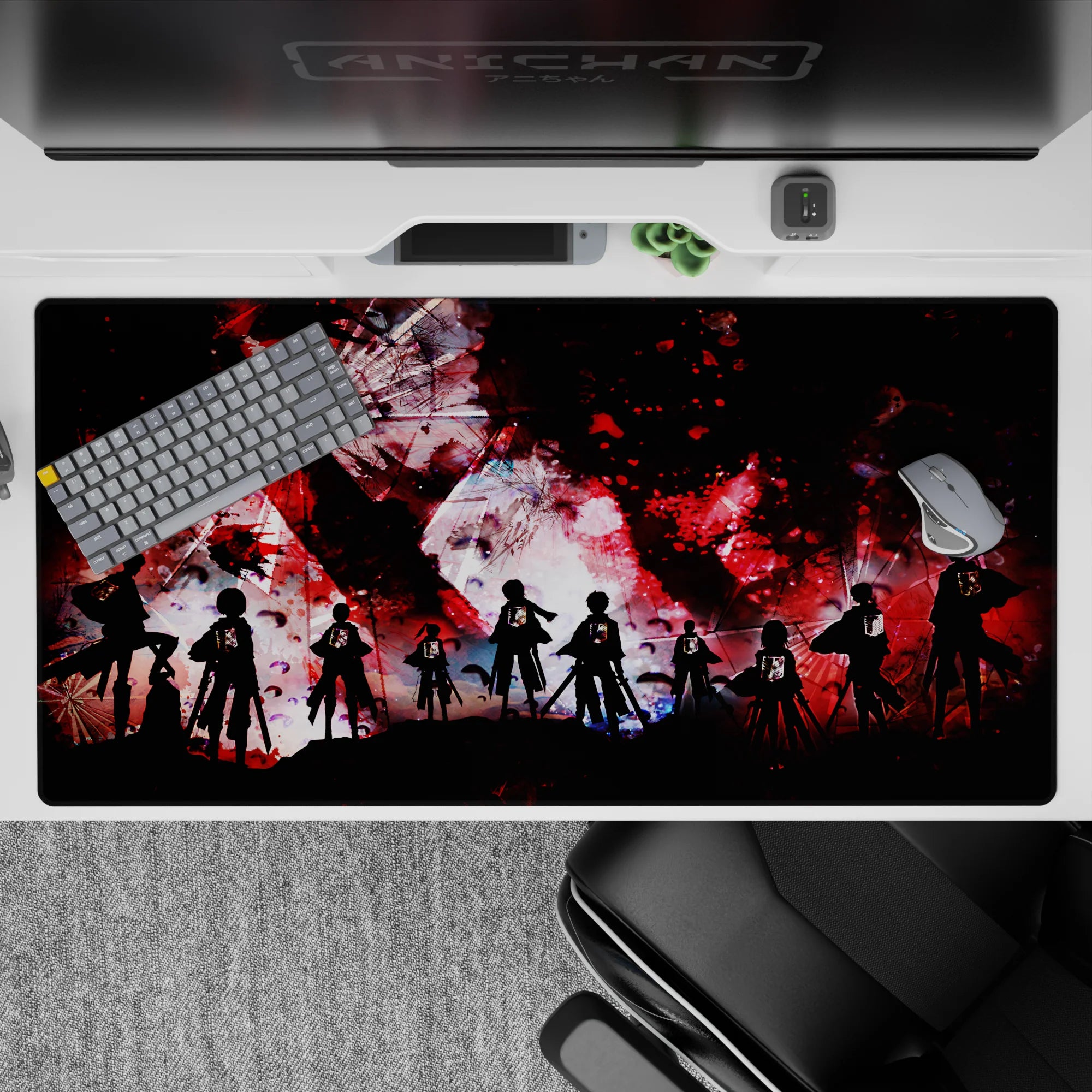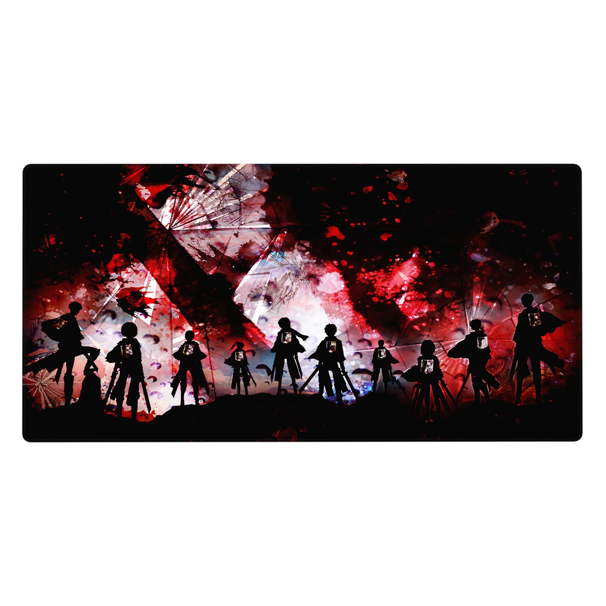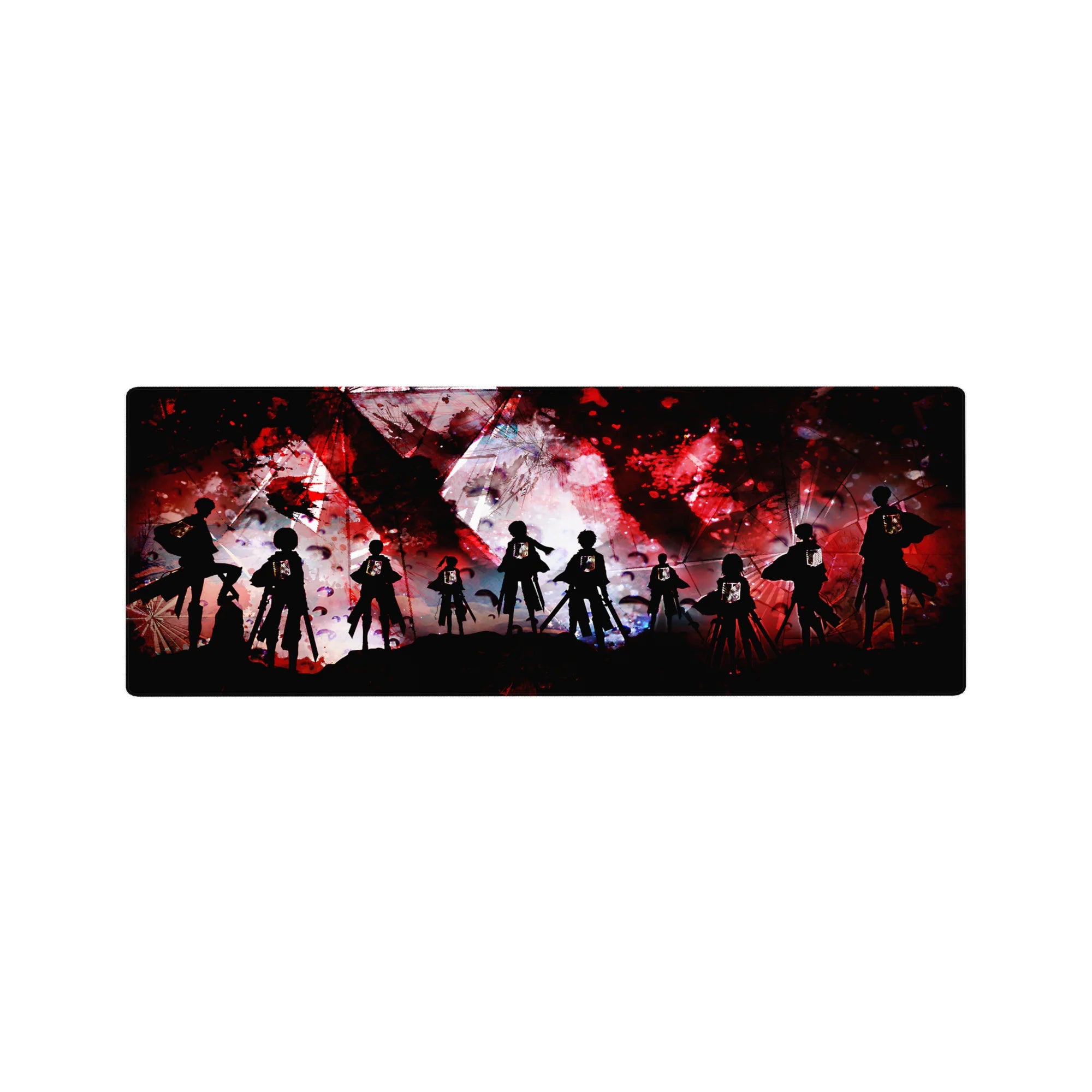 Step into the battle with this Attack on Titan anime mouse pad, featuring a gritty abstract design of the Survey Corps standing against chaos. The Wings of Freedom shine against intense red, black, and white splashes, making this desk pad a bold statement for any fan of the series.