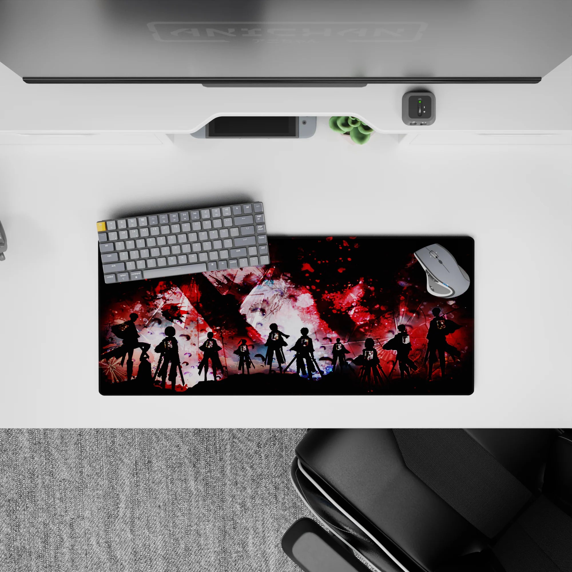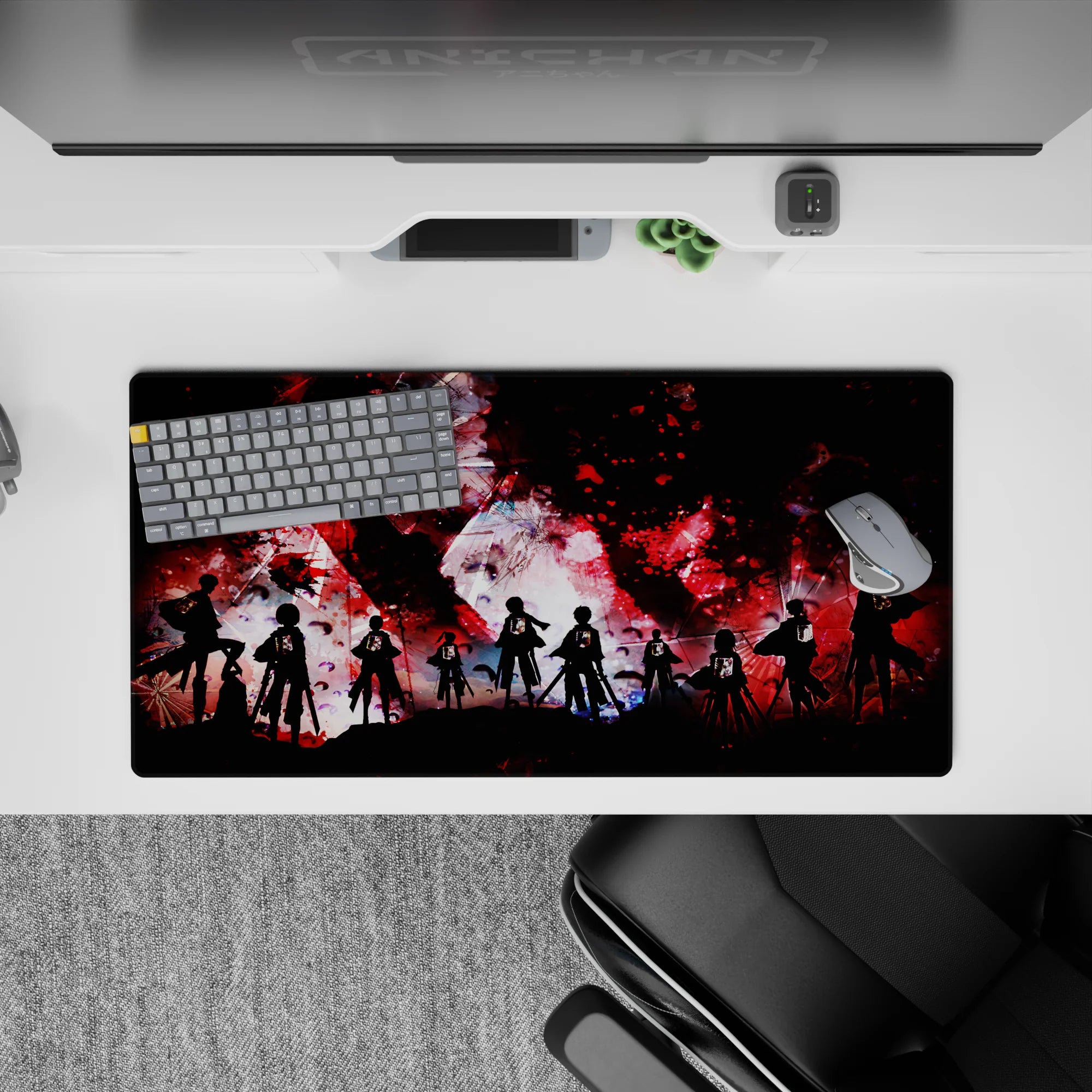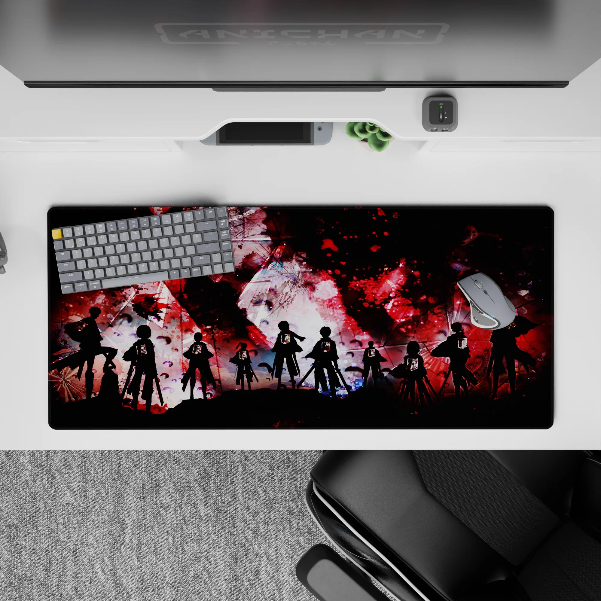Step into the battle with this Attack on Titan anime mouse pad, featuring a gritty abstract design of the Survey Corps standing against chaos. The Wings of Freedom shine against intense red, black, and white splashes, making this desk pad a bold statement for any fan of the series.