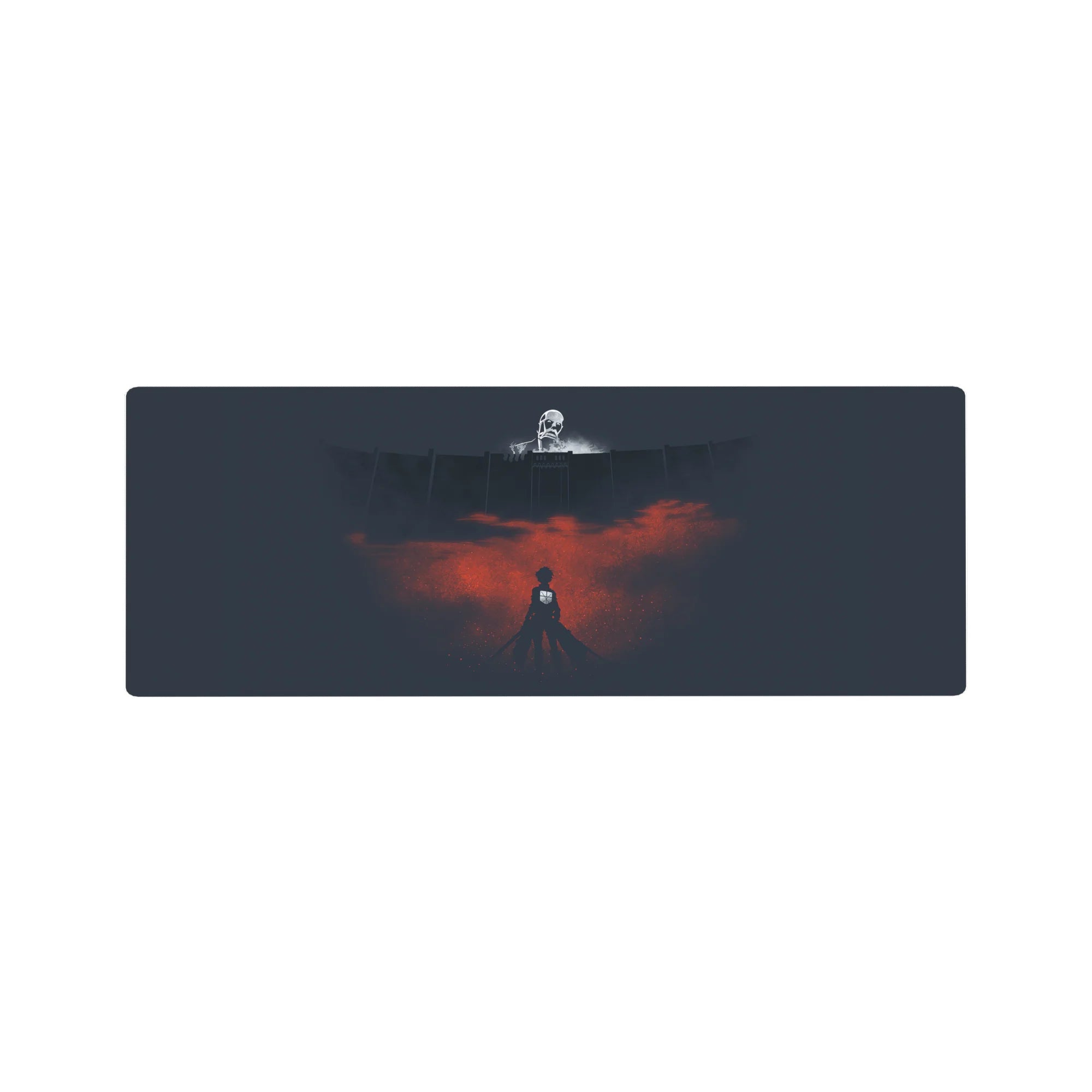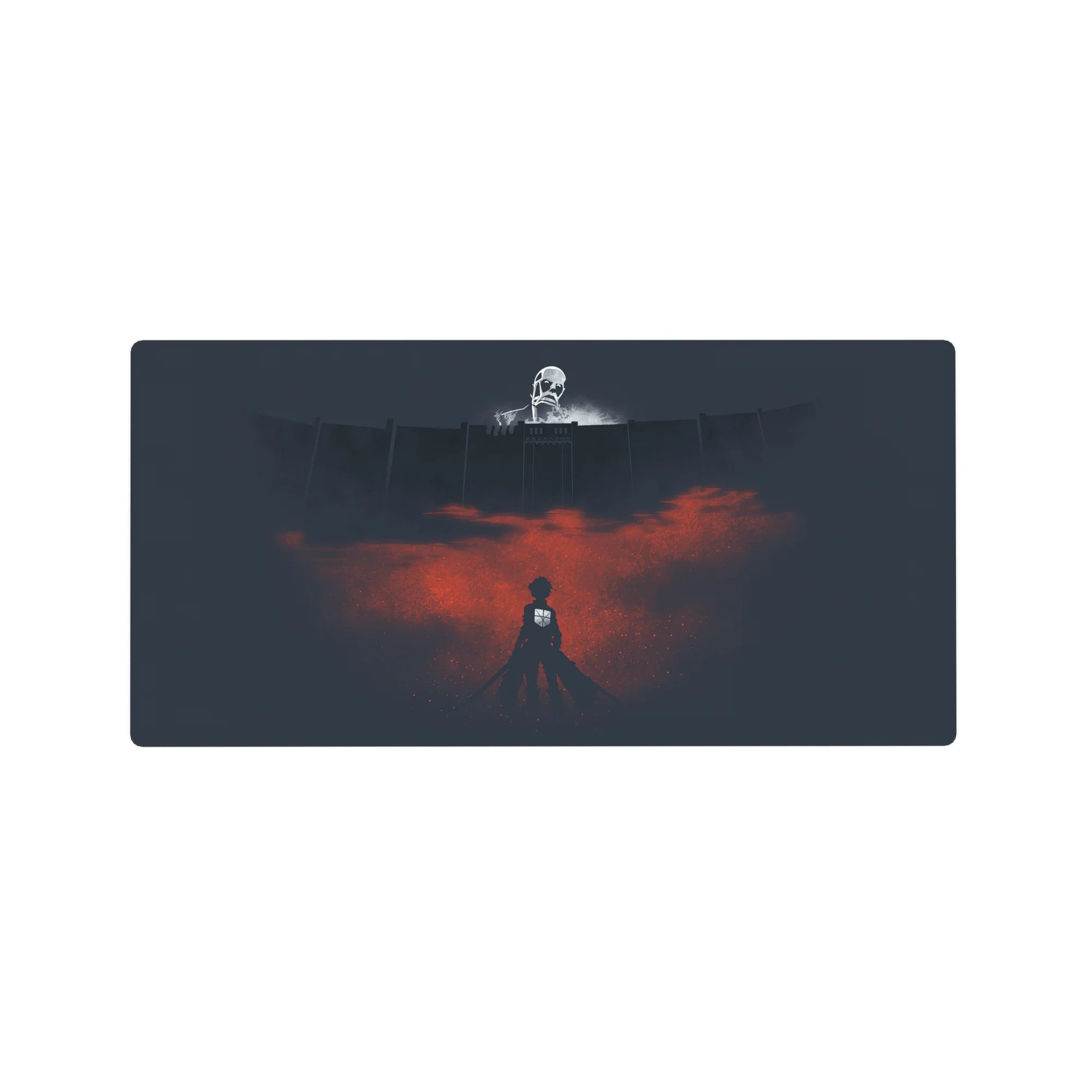 Stand before the Colossal Titan with this Attack on Titan anime mouse pad, featuring Eren Yeager facing the destruction of Wall Maria. A stunning mix of dark blues and fiery reds creates an intense, cinematic atmosphere. This desk pad is a must-have for fans of epic storytelling.