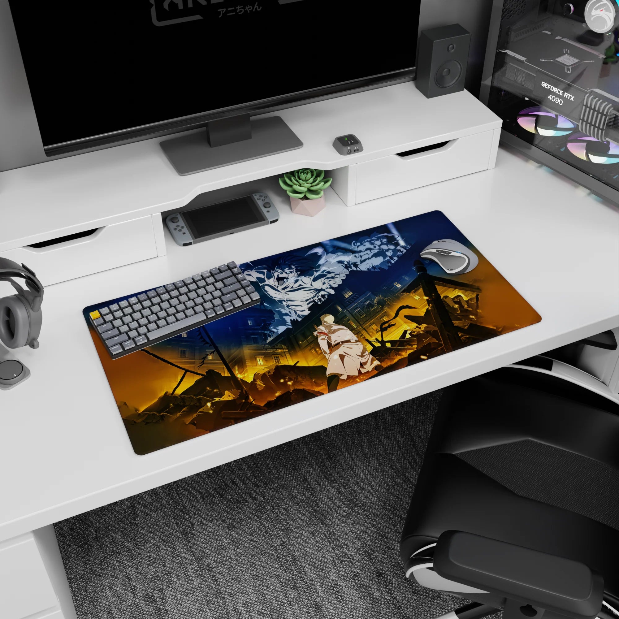 Immerse yourself in the world of Attack on Titan with this stunning anime mouse pad featuring Eren Yeager in his Titan form, roaring over a battlefield in cinematic detail. With fiery contrasts and epic lighting, this desk pad is a must-have for fans who crave intense action in their setup.