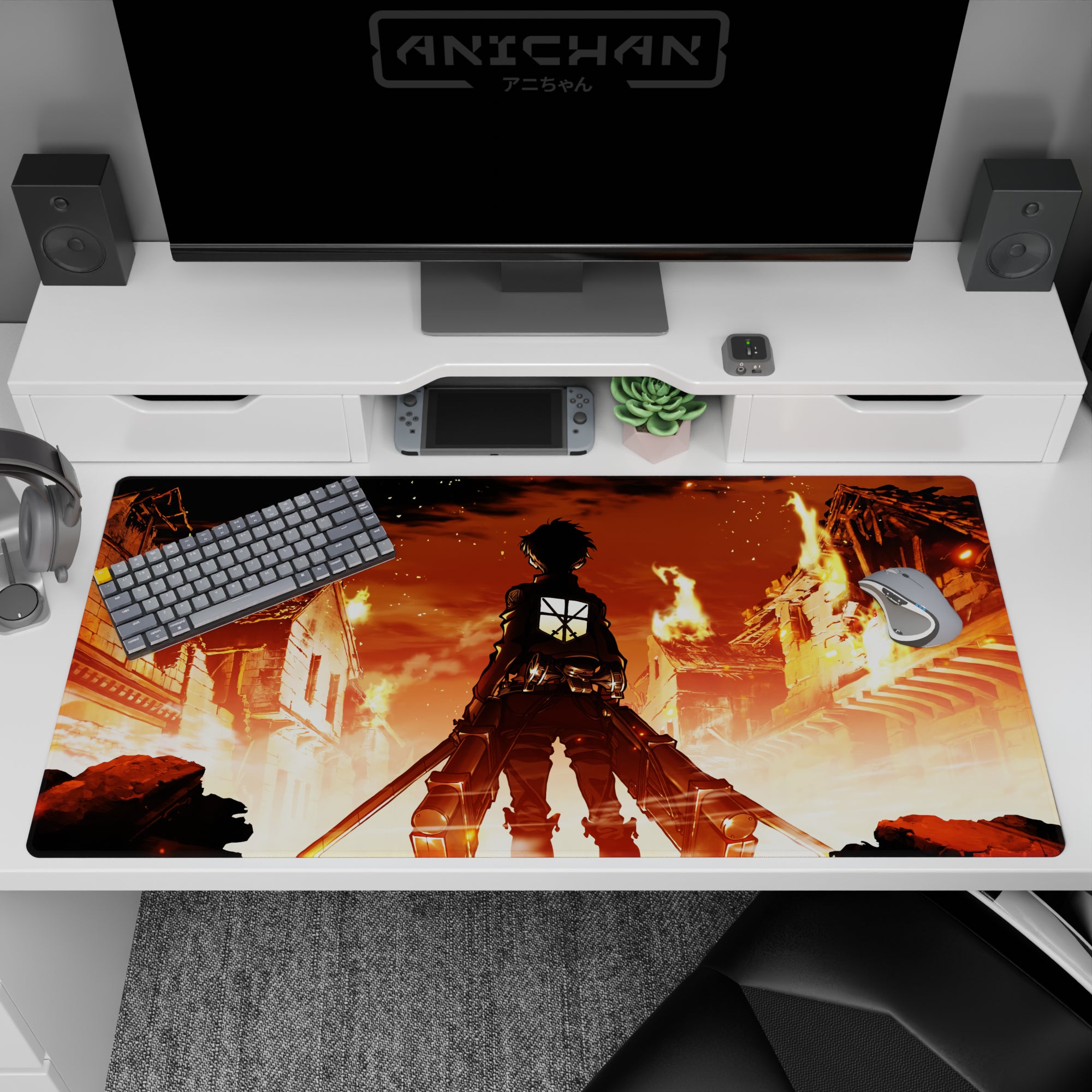 Immerse in the iconic universe of Attack on Titan with our Eren Yeager anime mouse pad. Experience fiery intensity as Eren stands ready amidst a burning cityscape. Not just a mouse pad, but a tale of resolve and retribution, offering both style and thrilling action for your workspace.
