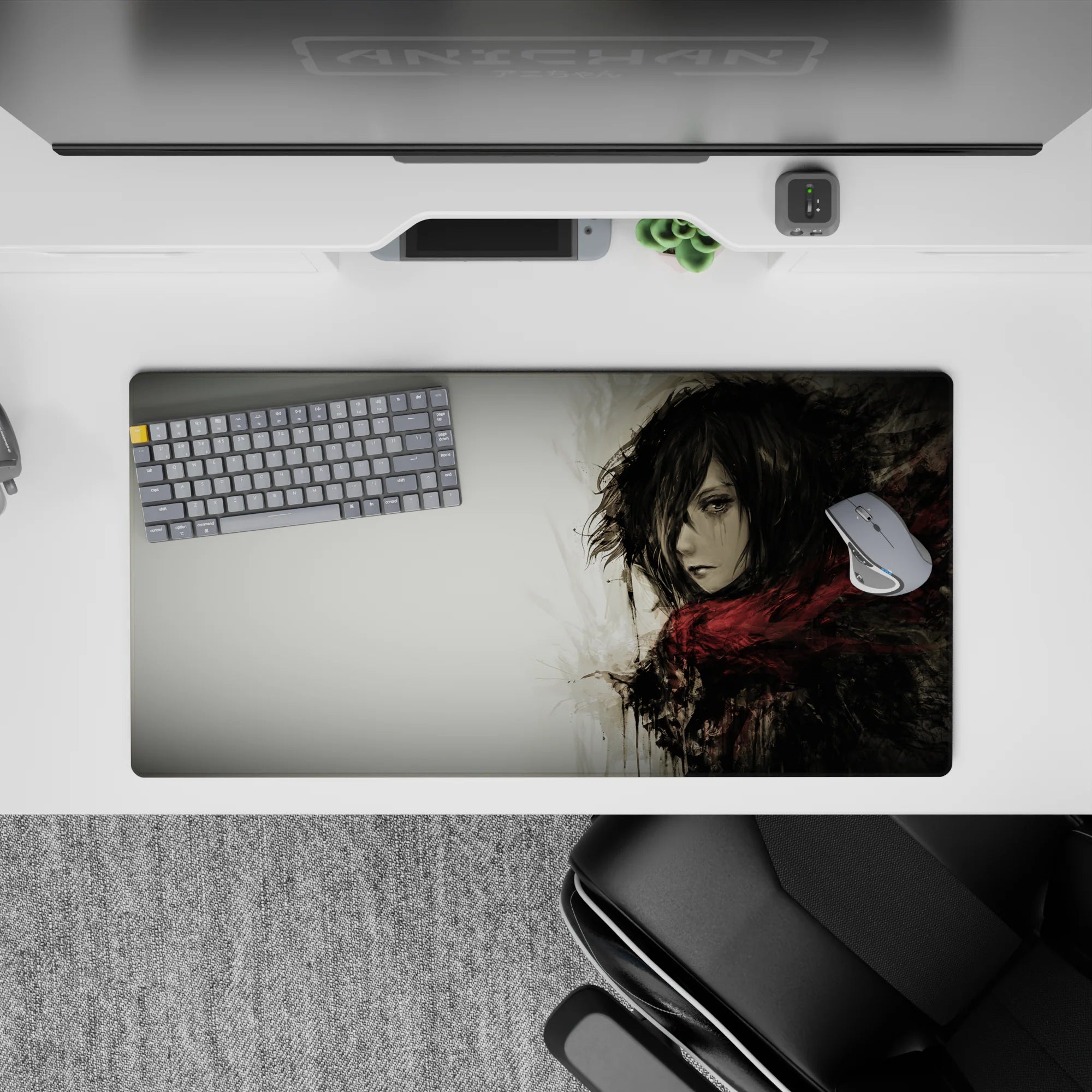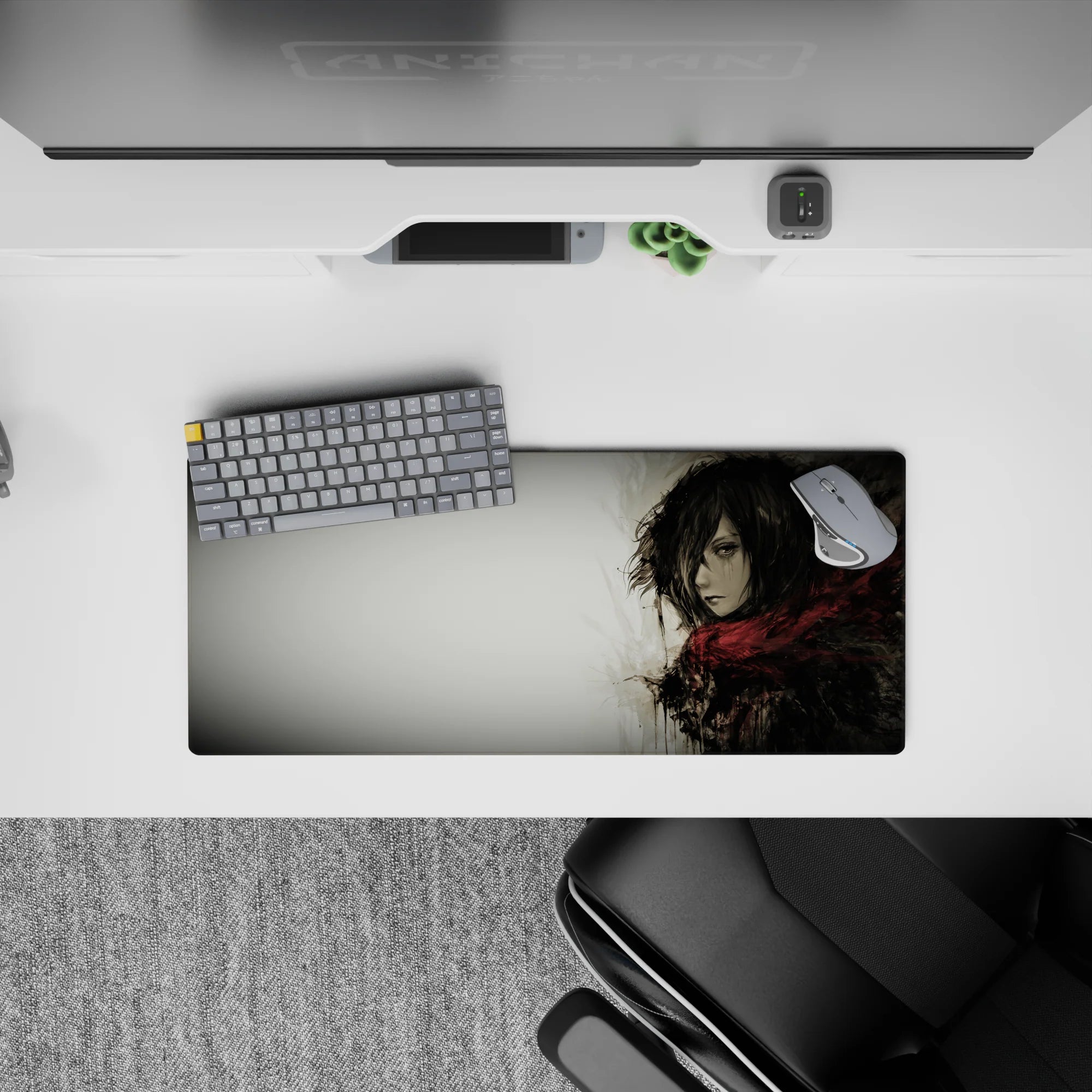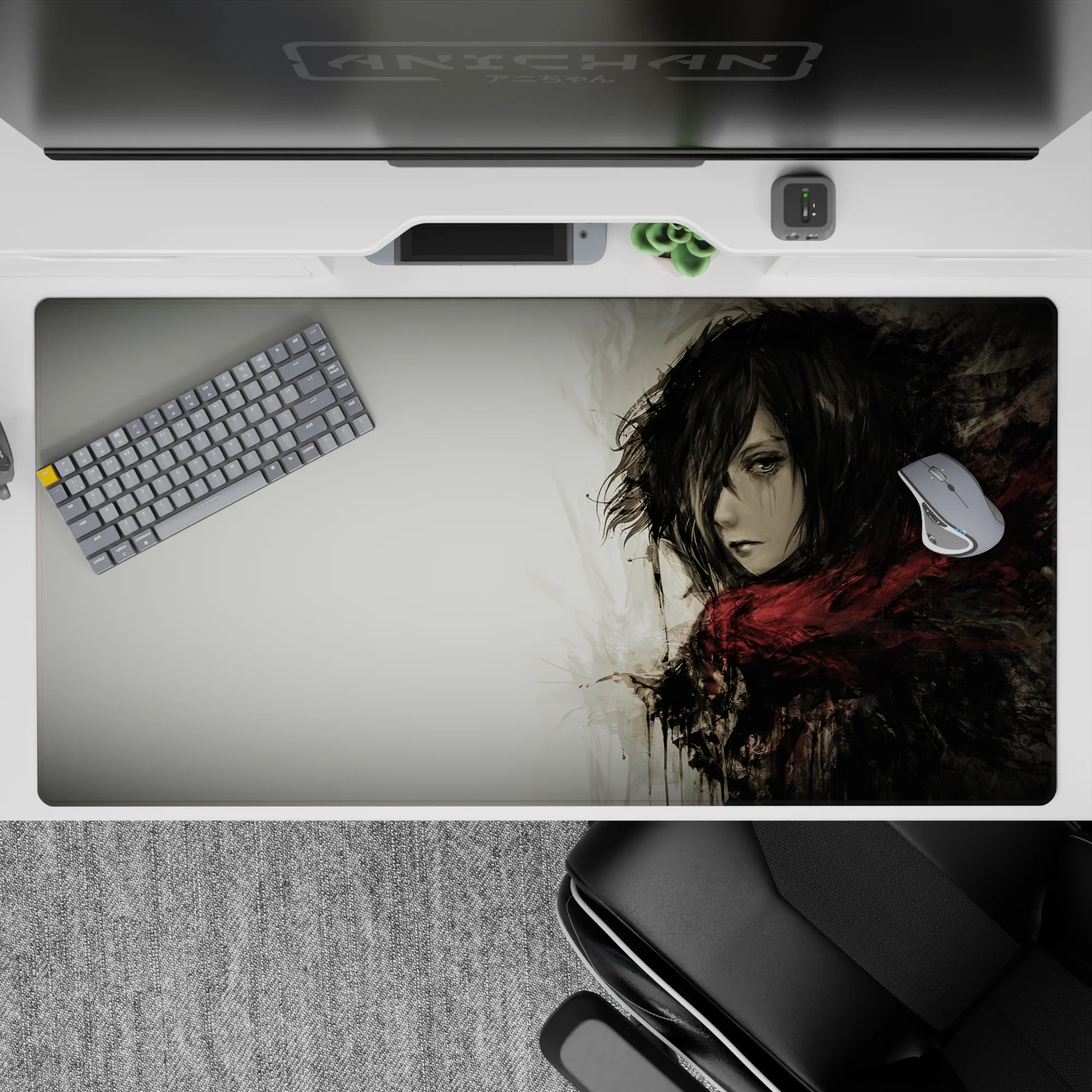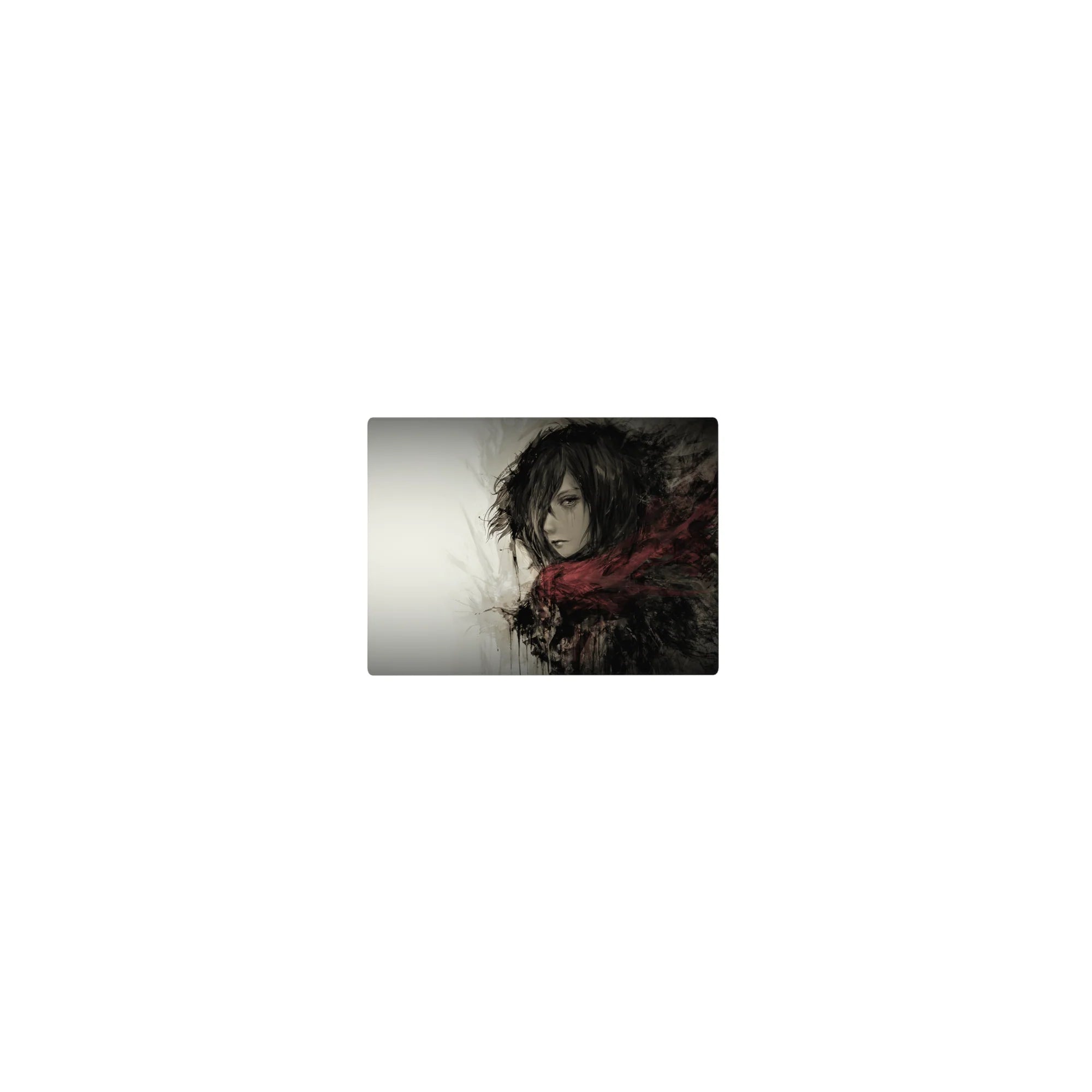 Embrace the quiet strength of Mikasa Ackerman with this stunning Attack on Titan anime mouse pad. Featuring a grayscale watercolor design, this desk pad captures her fierce yet solemn presence, wrapped in her iconic red scarf. Perfect for any AOT fan’s workspace.