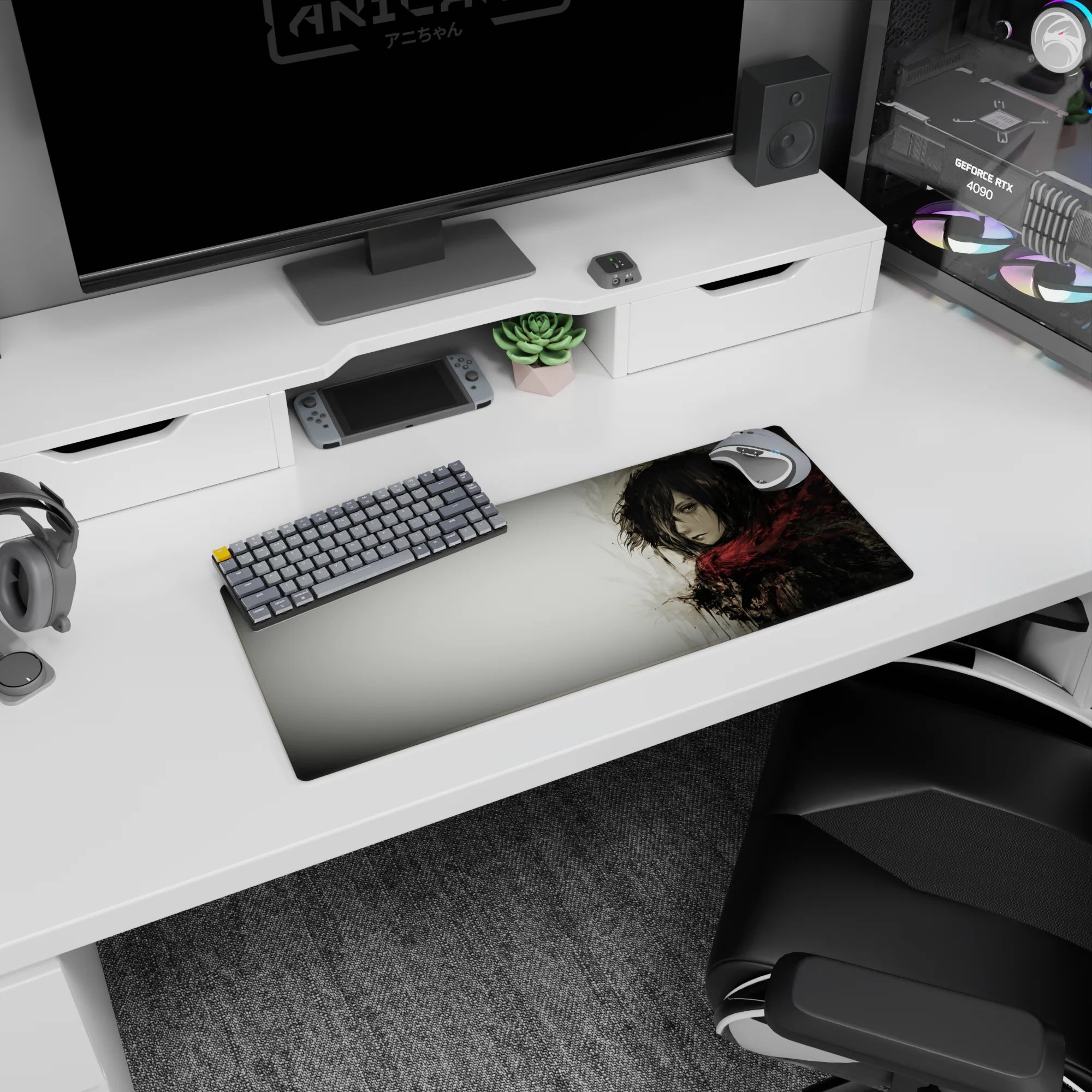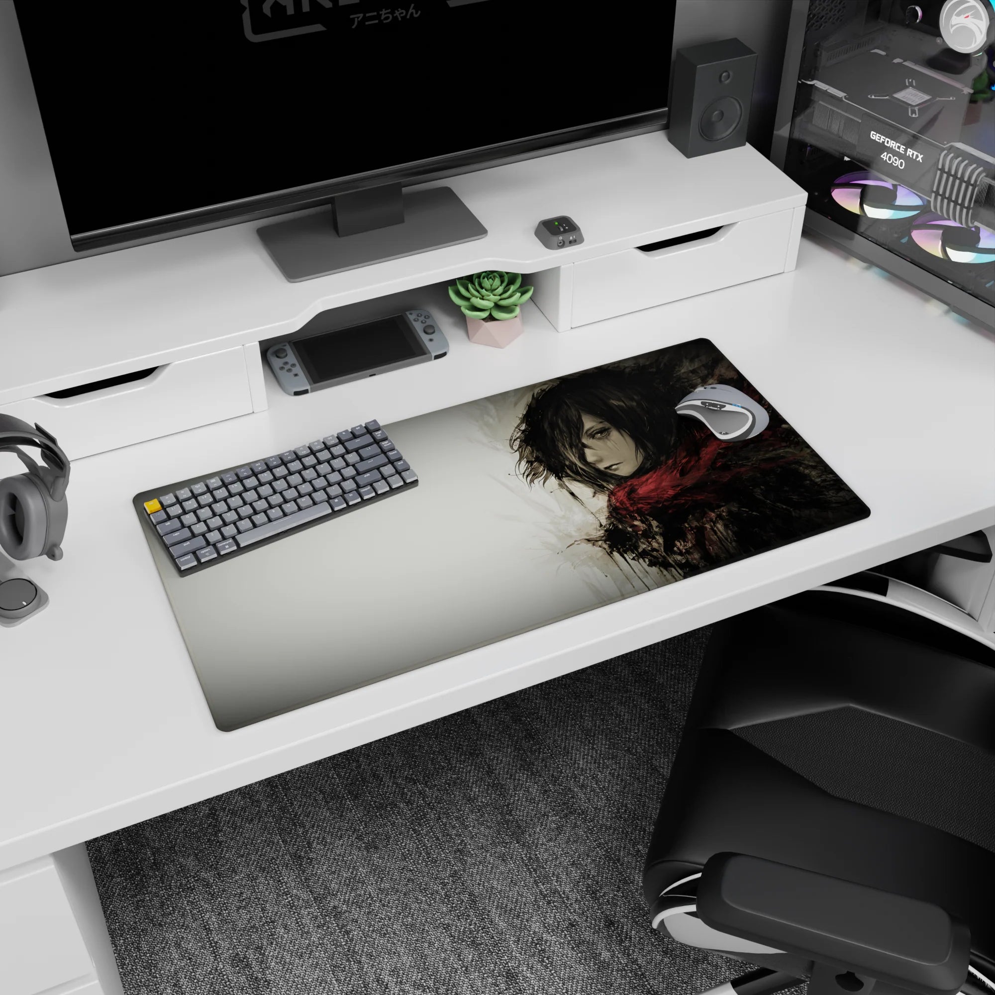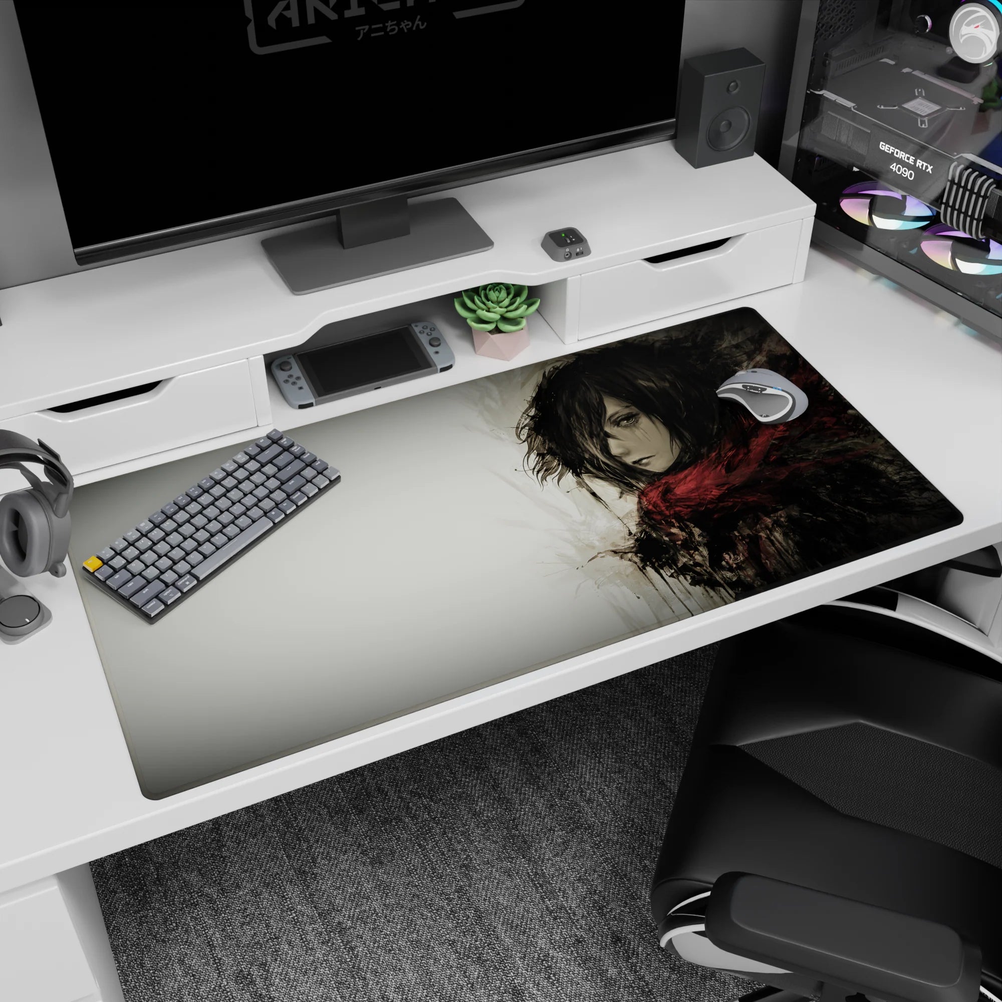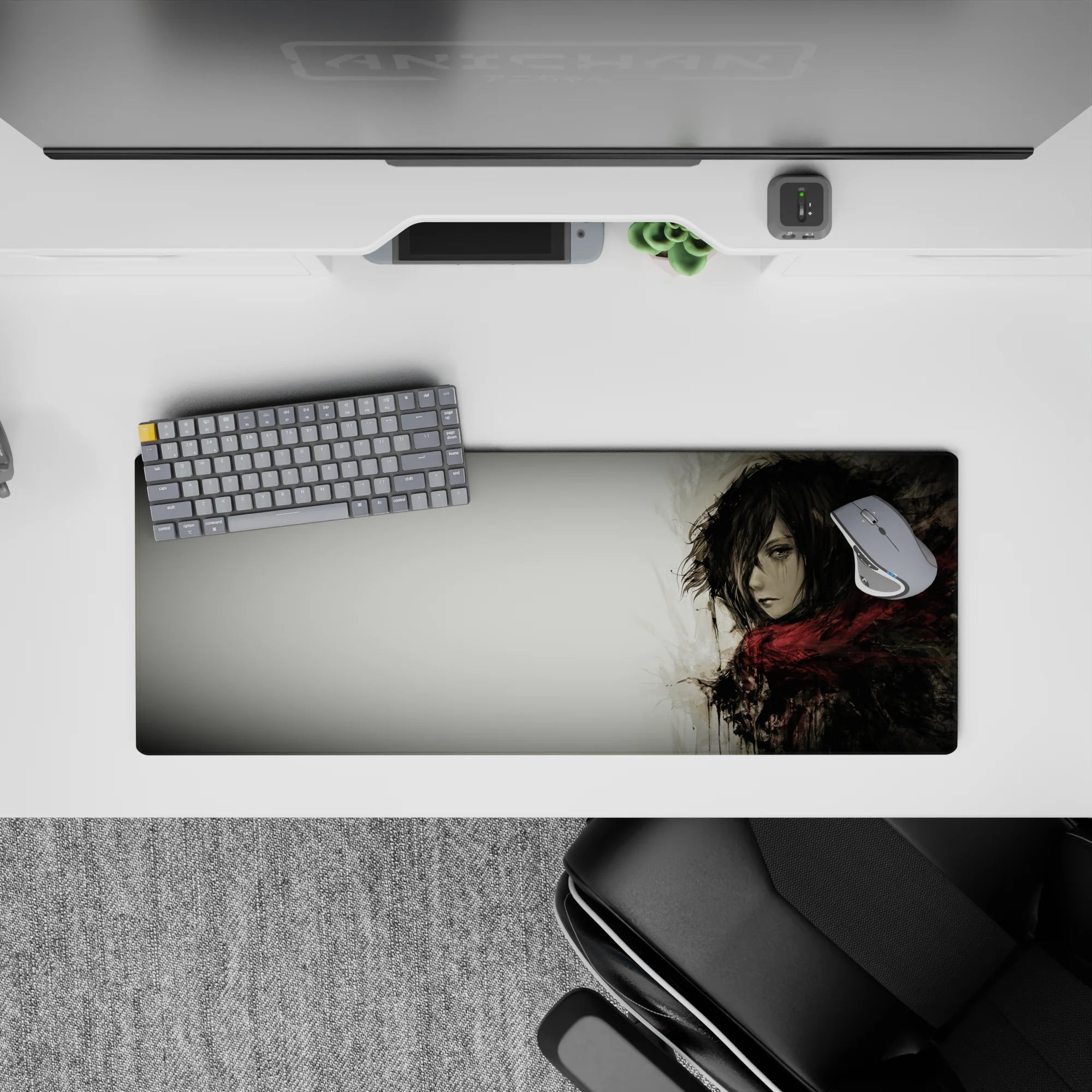 Embrace the quiet strength of Mikasa Ackerman with this stunning Attack on Titan anime mouse pad. Featuring a grayscale watercolor design, this desk pad captures her fierce yet solemn presence, wrapped in her iconic red scarf. Perfect for any AOT fan’s workspace.
