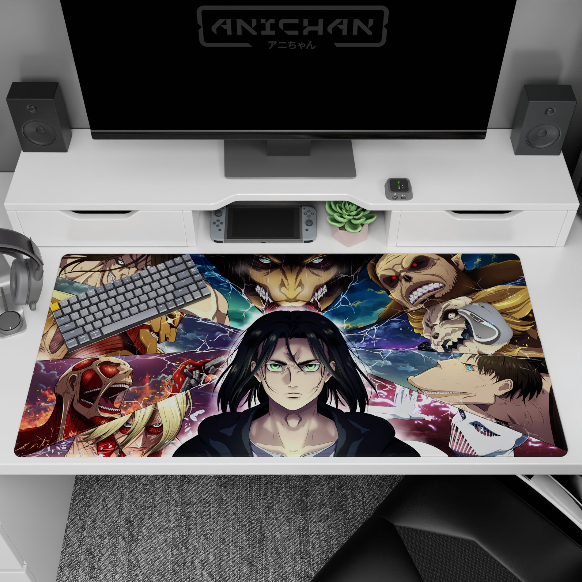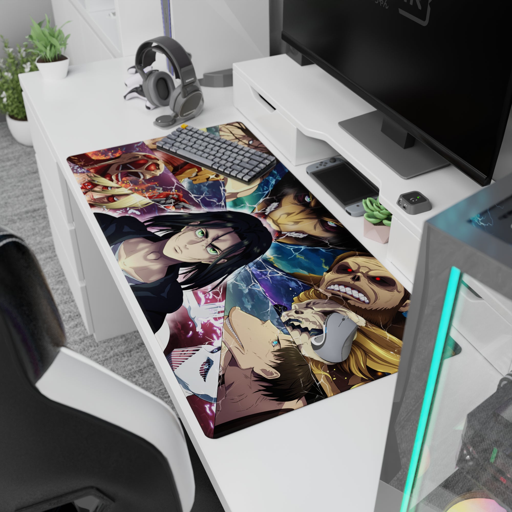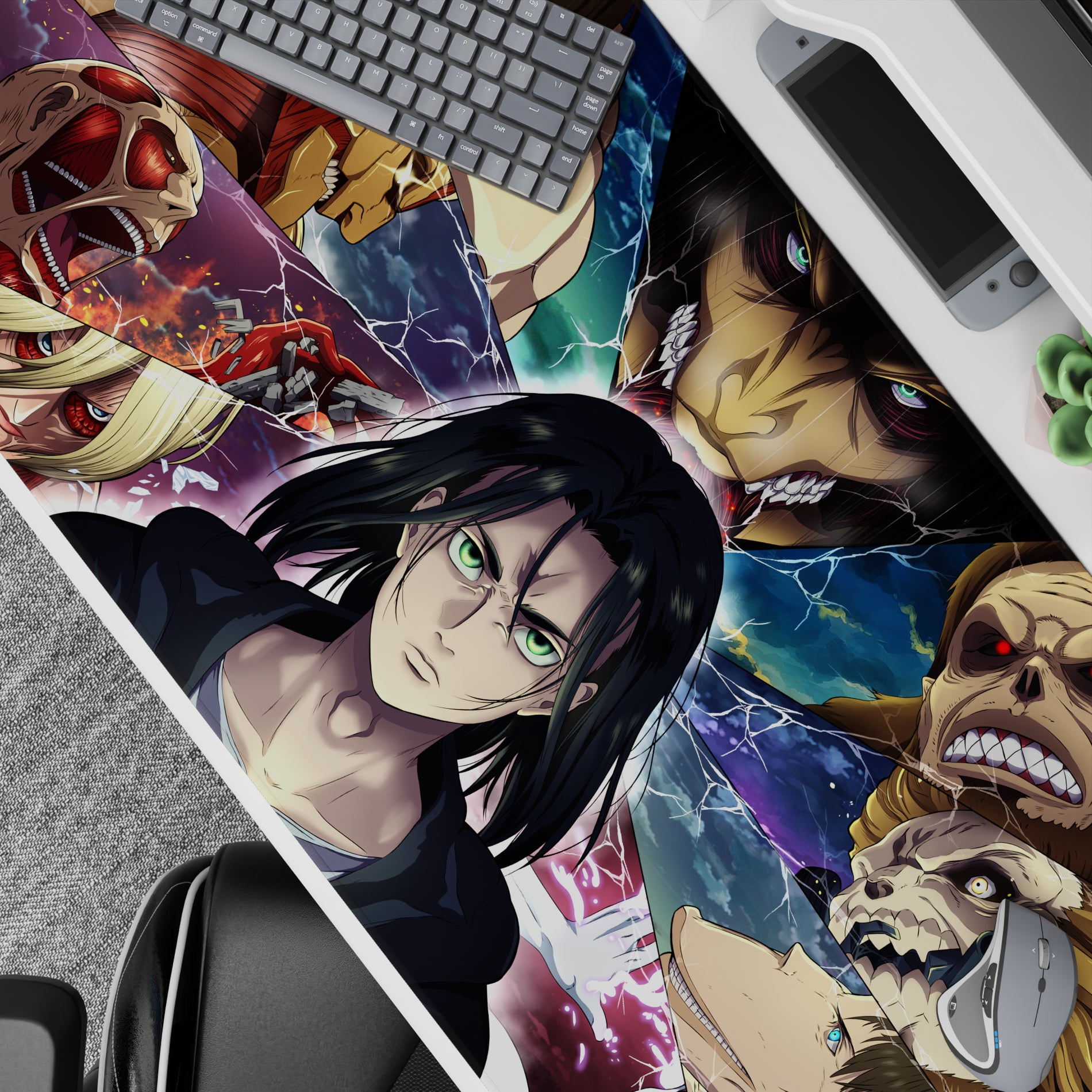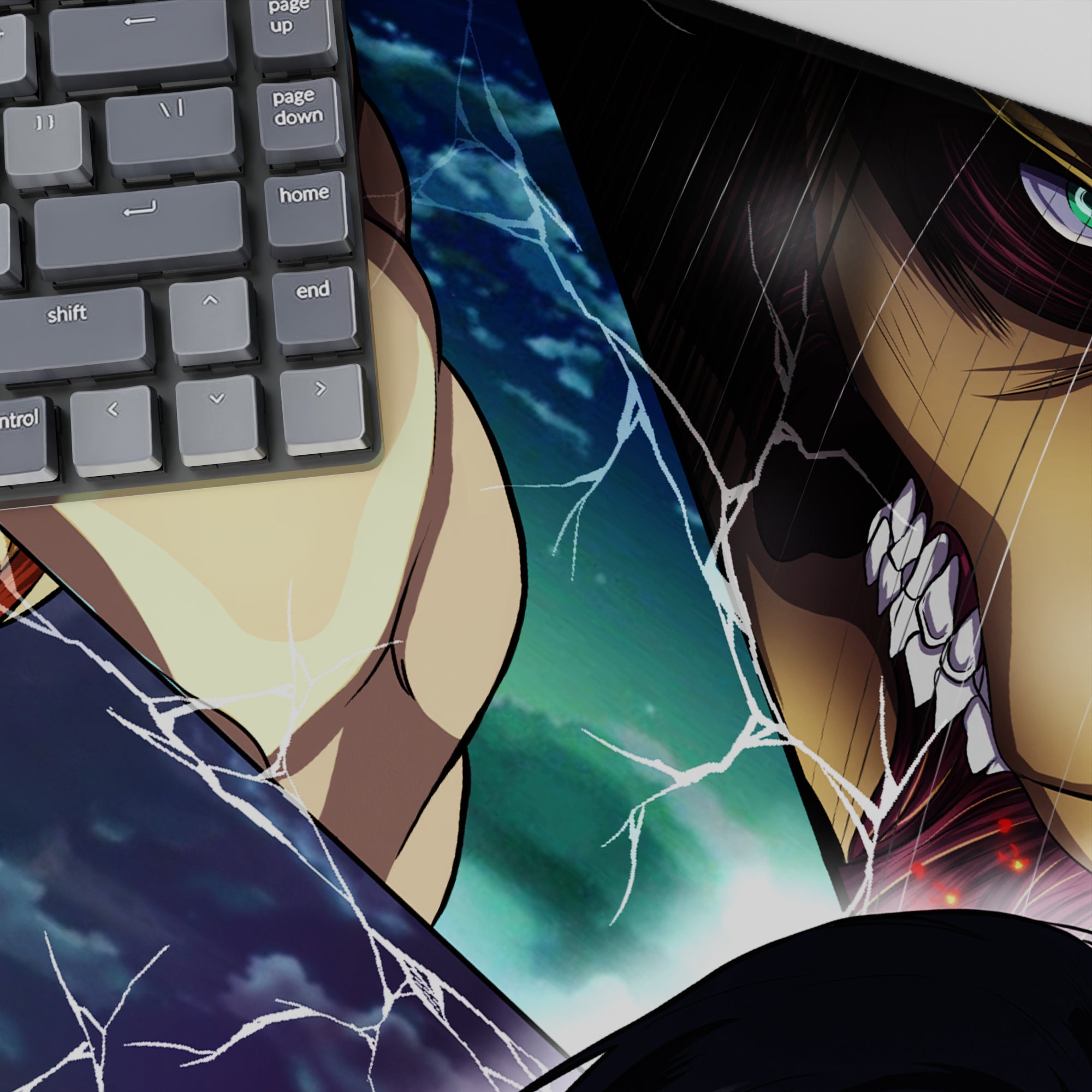 This anime mouse pad throws you into the Titan warzone, where Eren faces his destiny and every Titan shifter surrounds him in broken, electrified fragments.