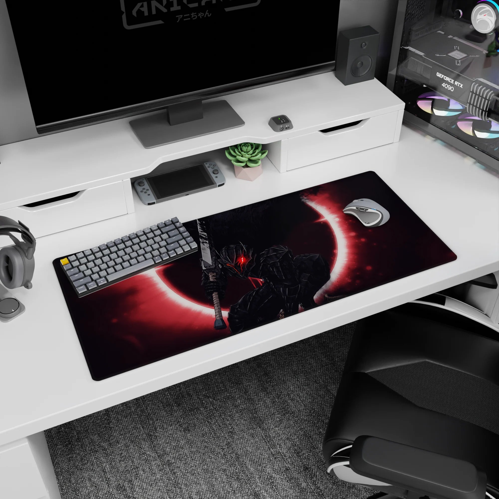 Unleash the fury of Guts in his Berserker Armor with this powerful desk pad. Set against a blood-red eclipse, this design captures the intensity of the Black Swordsman and is perfect for fans of Berserk seeking a bold and dramatic statement piece.