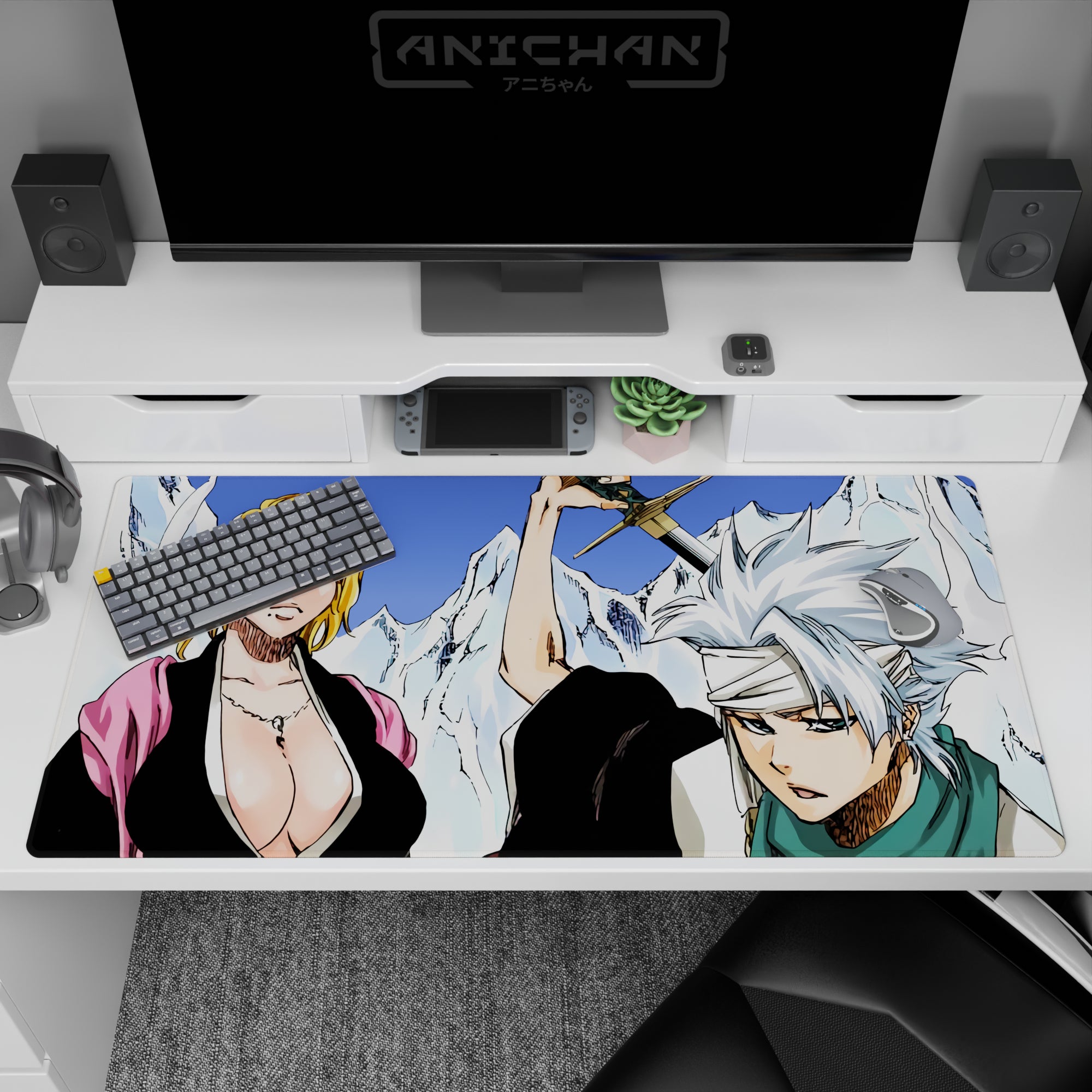 Discover the "Bleach" anime mouse pad featuring Rangiku and Tōshirō, where fiery passion meets icy determination. Stark whites and glacier blues pop vividly, enhancing your workspace with a bold, crisp, and slightly dangerous aura. Perfect for fans wanting a cooler desk vibe.