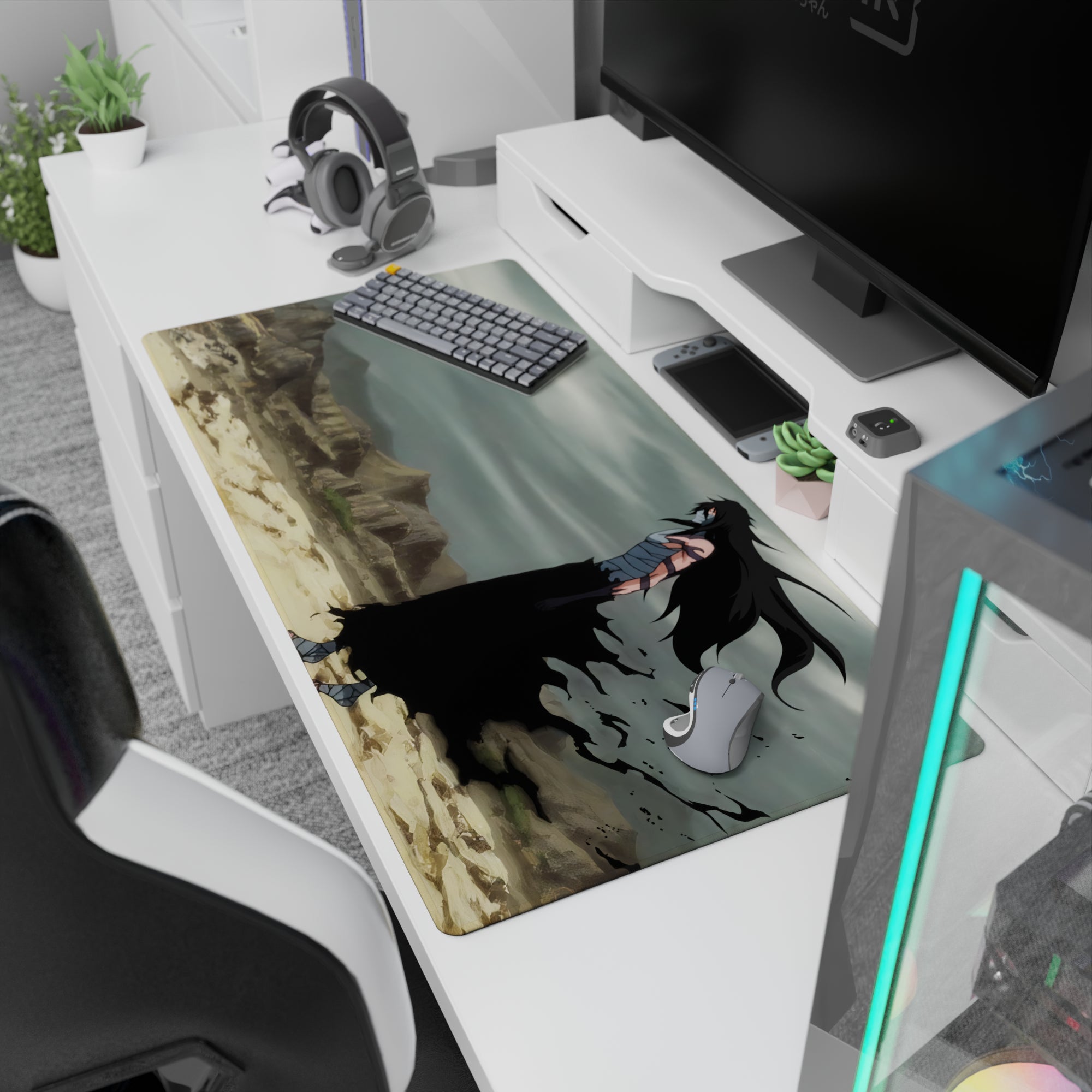 Silence before the storm. This anime mouse pad features Ichigo Kurosaki in his full Hollow form from Bleach, standing alone in a dead, windswept wasteland. The clouds churn, his black reiatsu shreds the air, and his red eyes burn like warning lights. Desolate, dark, and deadly beautiful. It’s not just a character—it’s a transformation captured mid-threat. For setups that thrive on edge and intensity.
