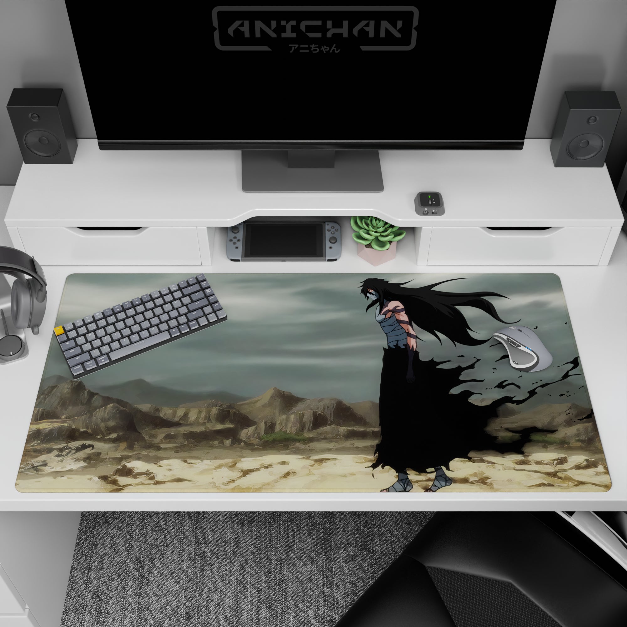 Ichigo Kurosaki in Hollow form from Bleach on a 32x12 inch anime mouse pad, set in a desolate, windswept wasteland.