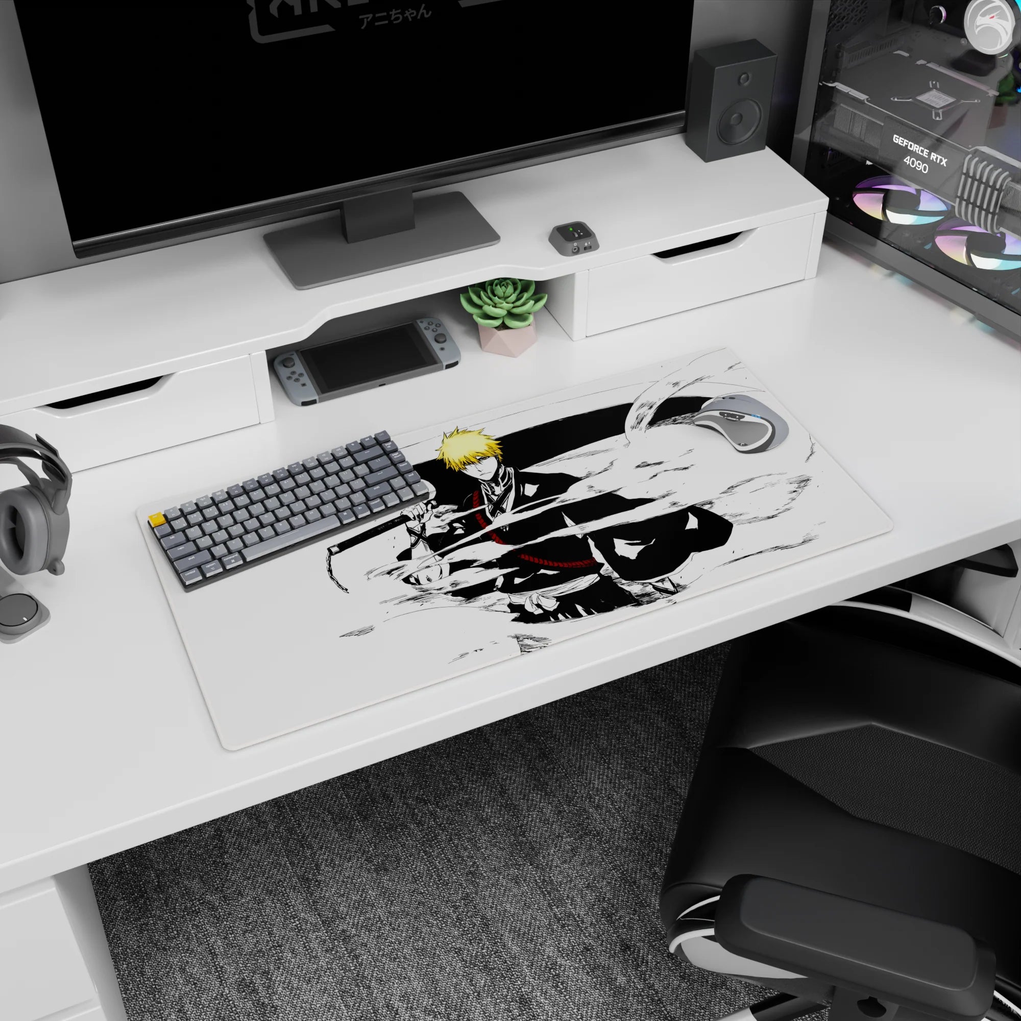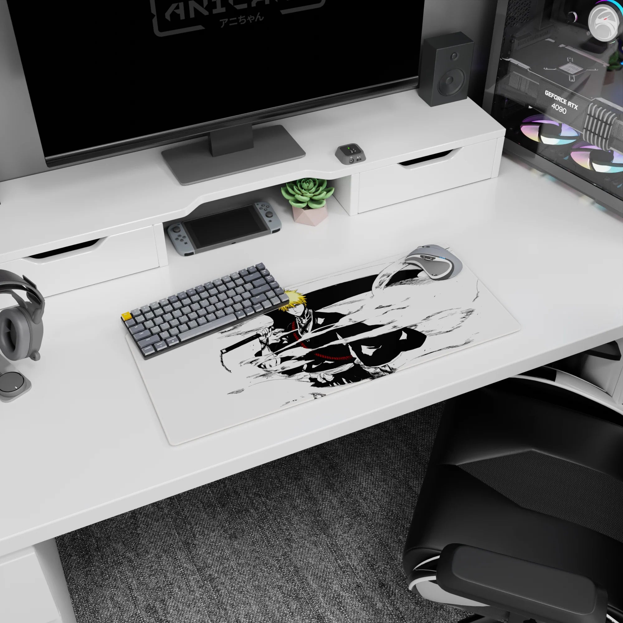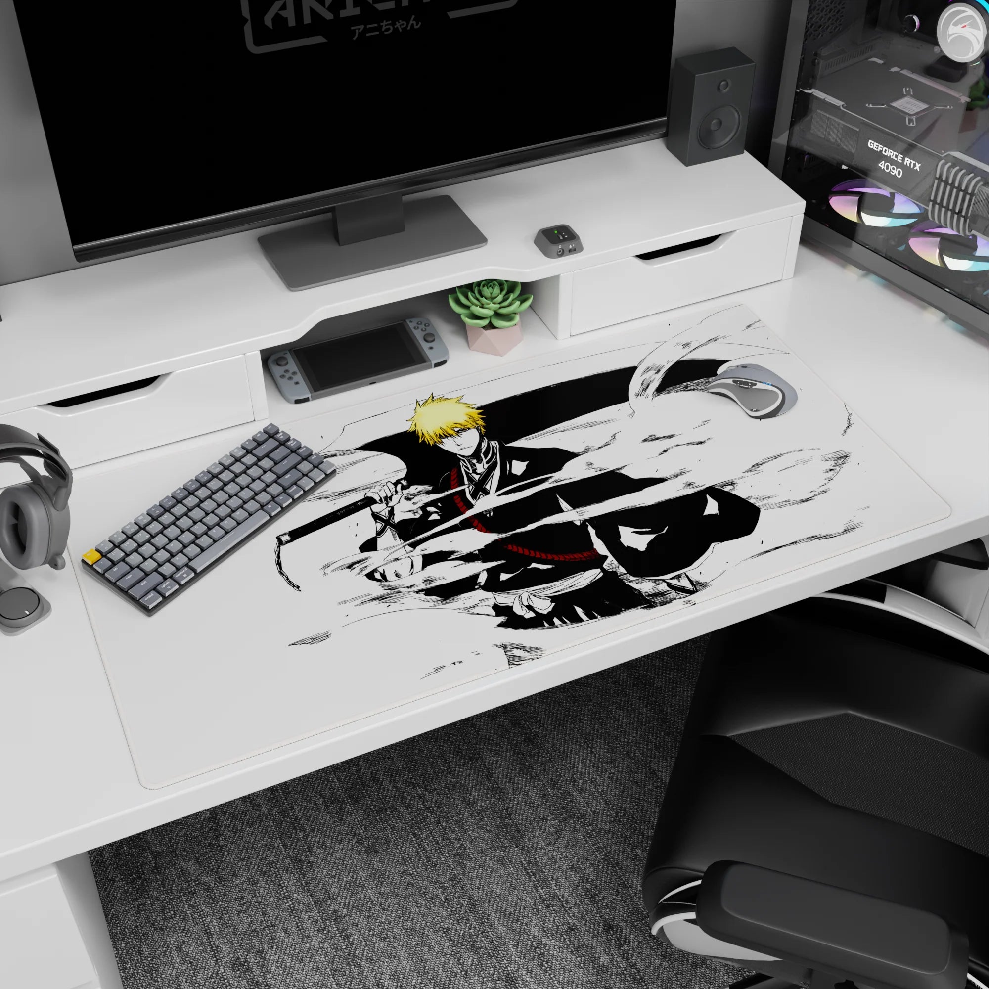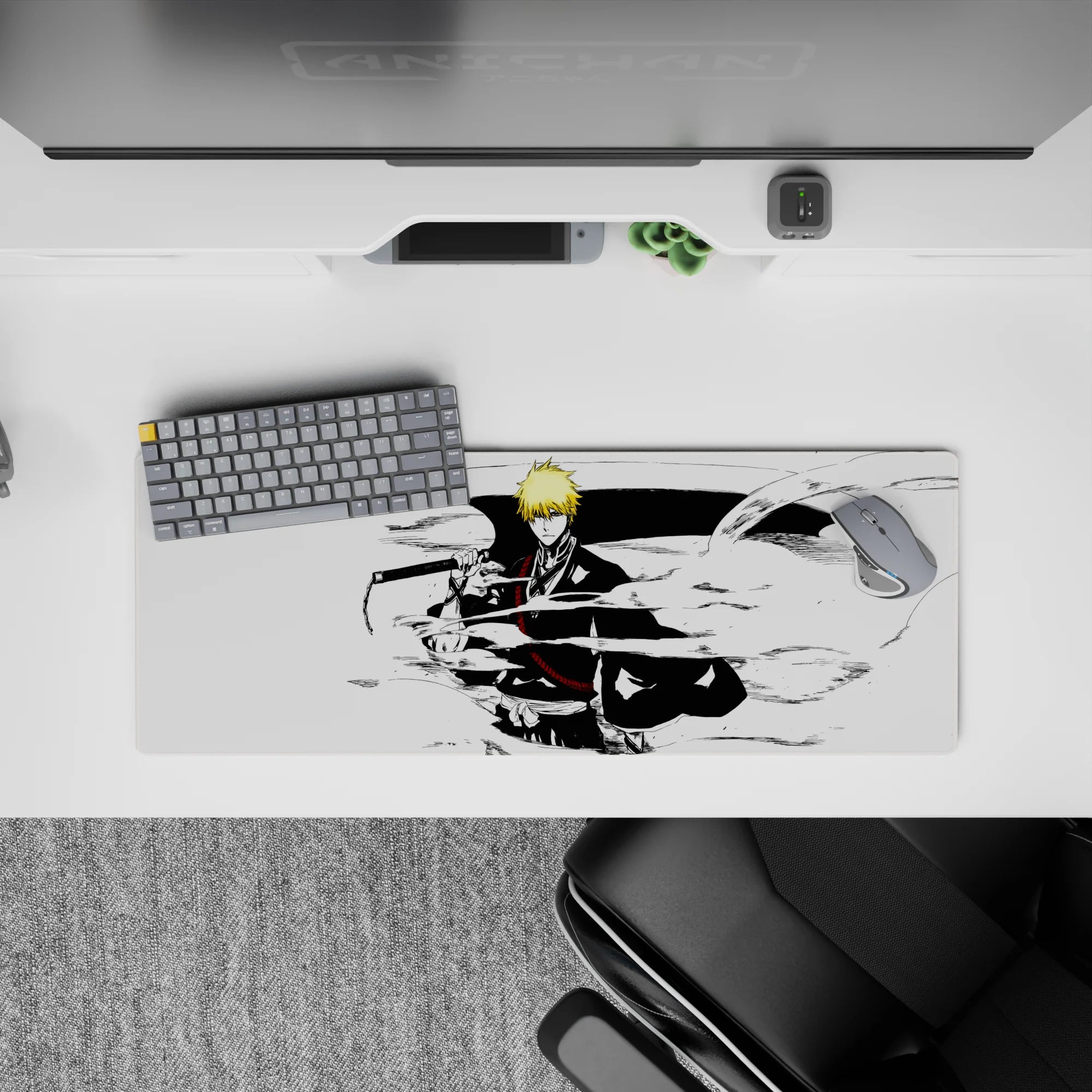 Immerse yourself in classic manga style with this anime mouse pad, featuring Ichigo Kurosaki in a striking black-and-white composition. Crisp lines, dynamic energy, and raw intensity make this Bleach-inspired design a must-have for fans who love bold, artistic simplicity.
