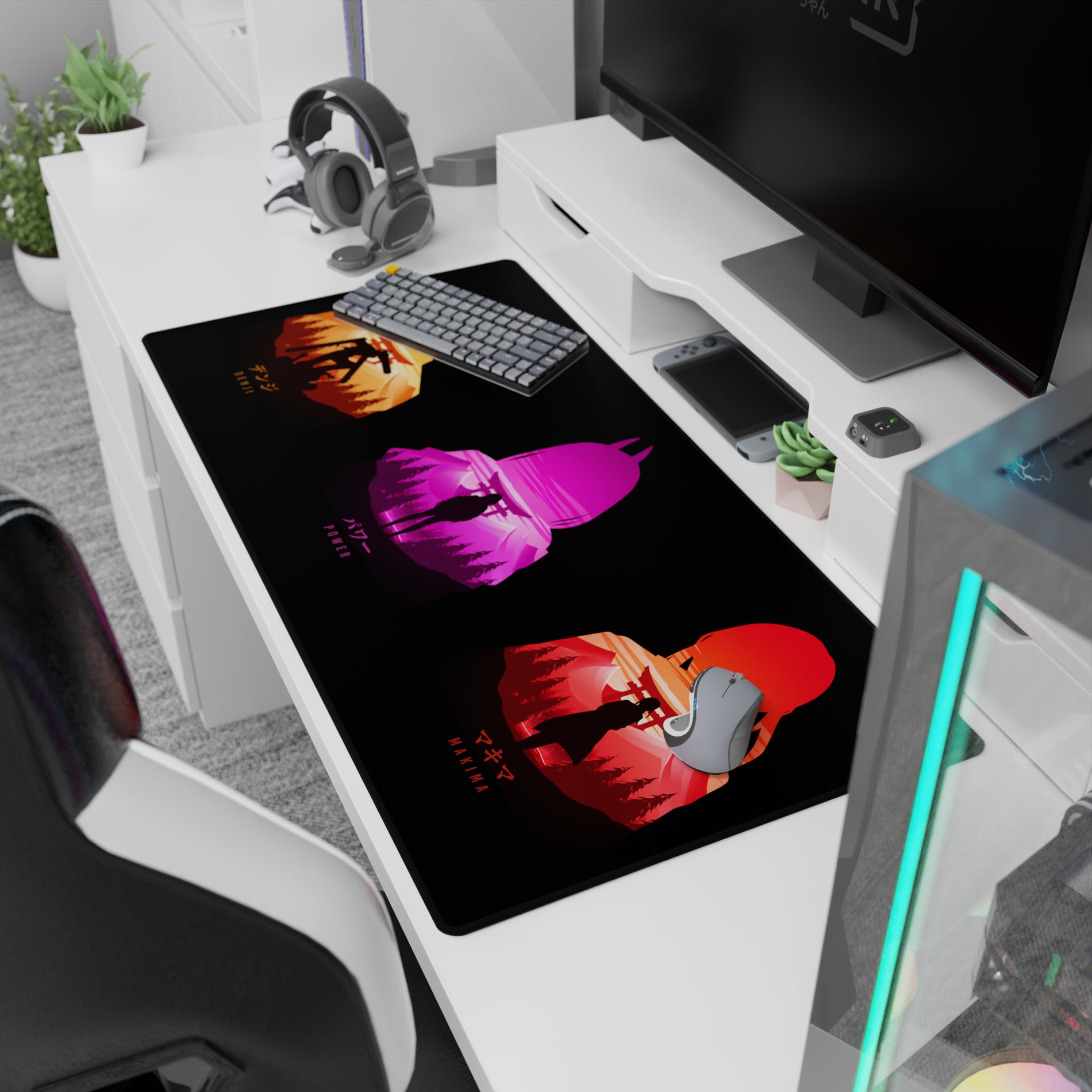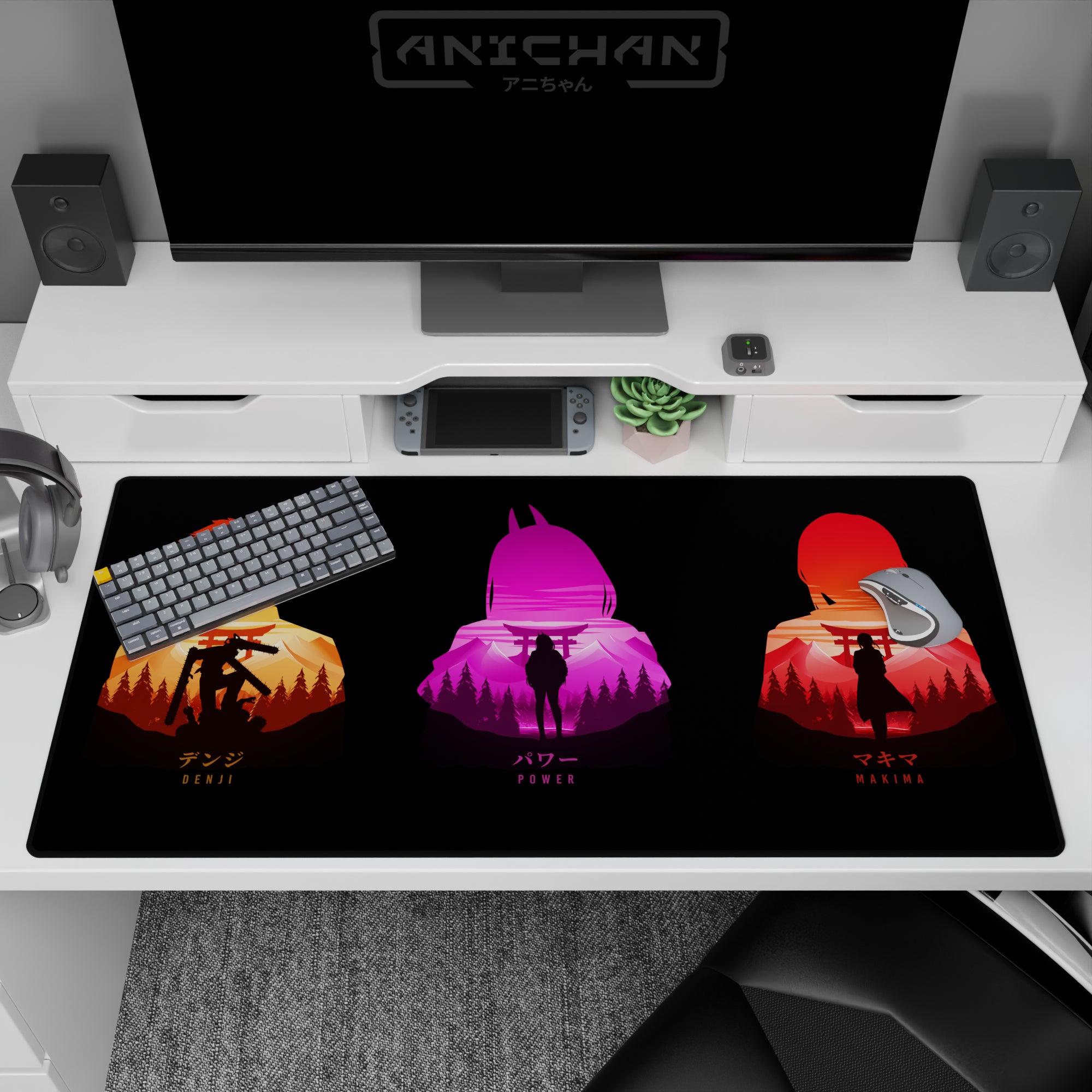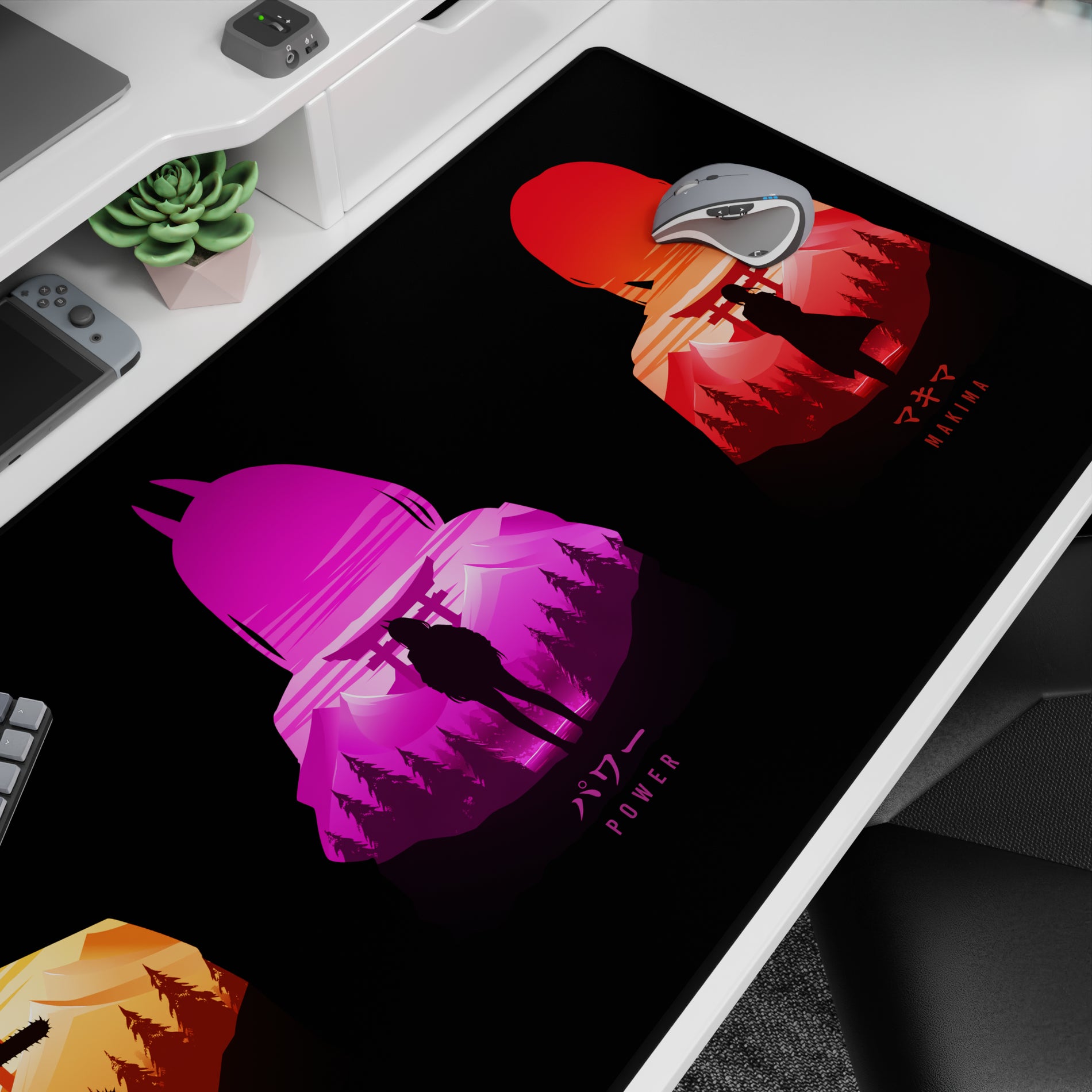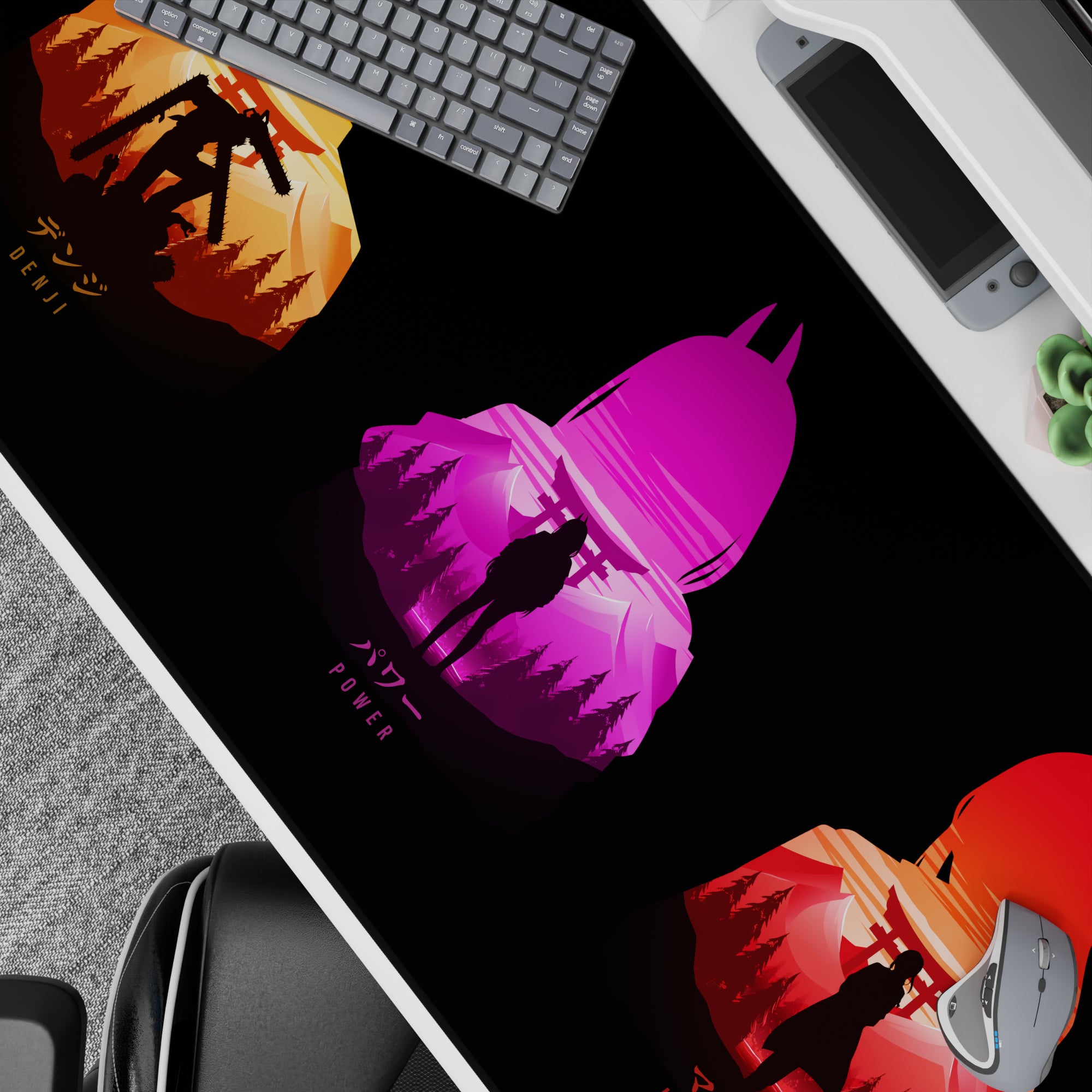 Discover a stunning anime mouse pad blending bold silhouettes and vibrant colors against a Japanese forest backdrop. Featuring Denji, Power, and Makima, this design captures the essence of stylish chaos with torii gates and chainsaws. Transform your desk with this unmissable accessory.