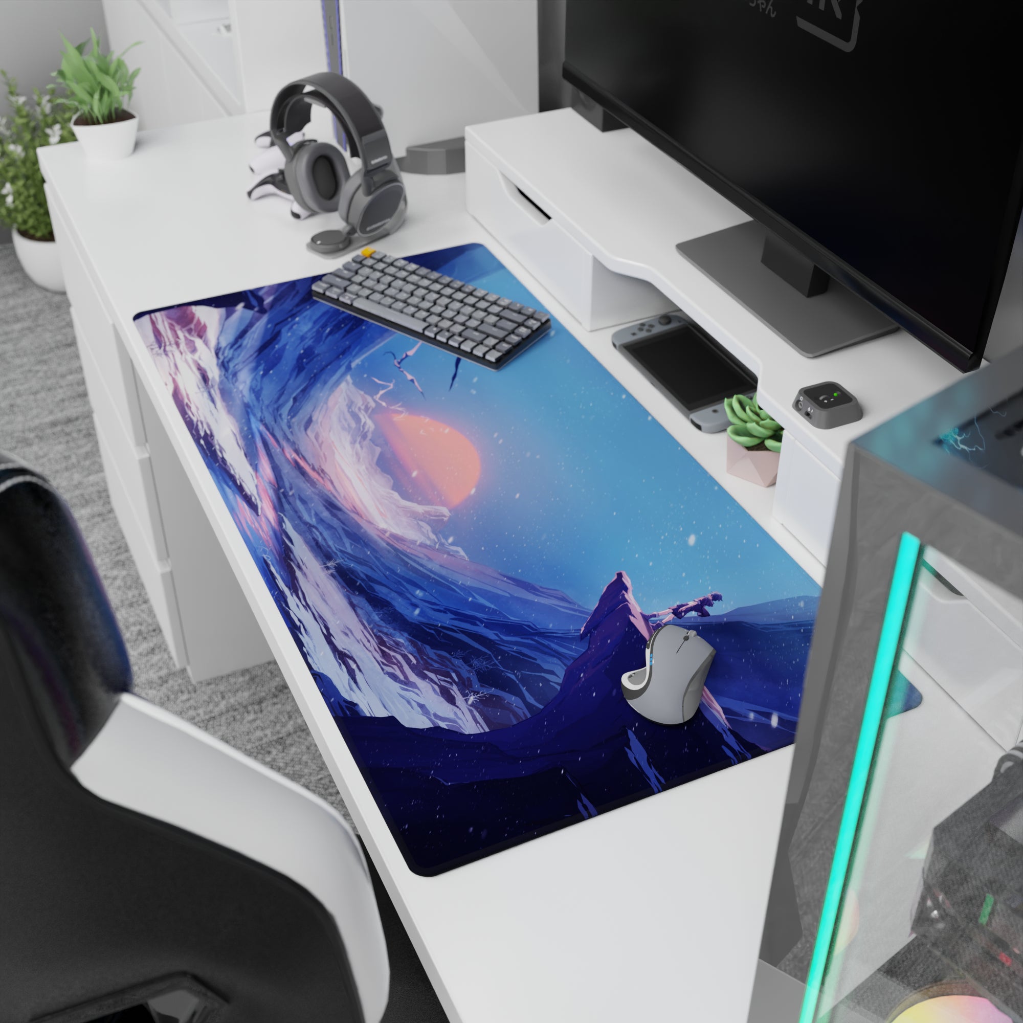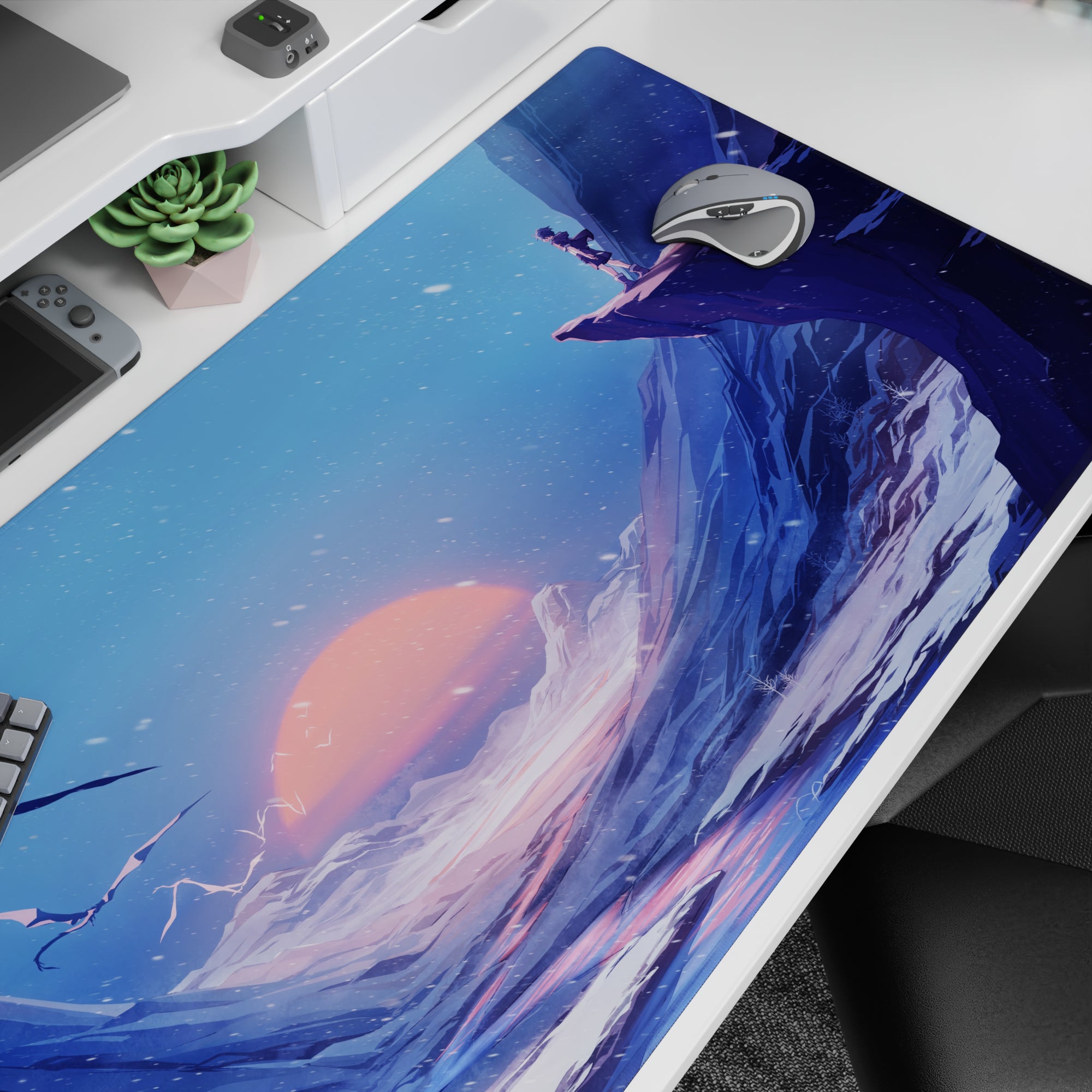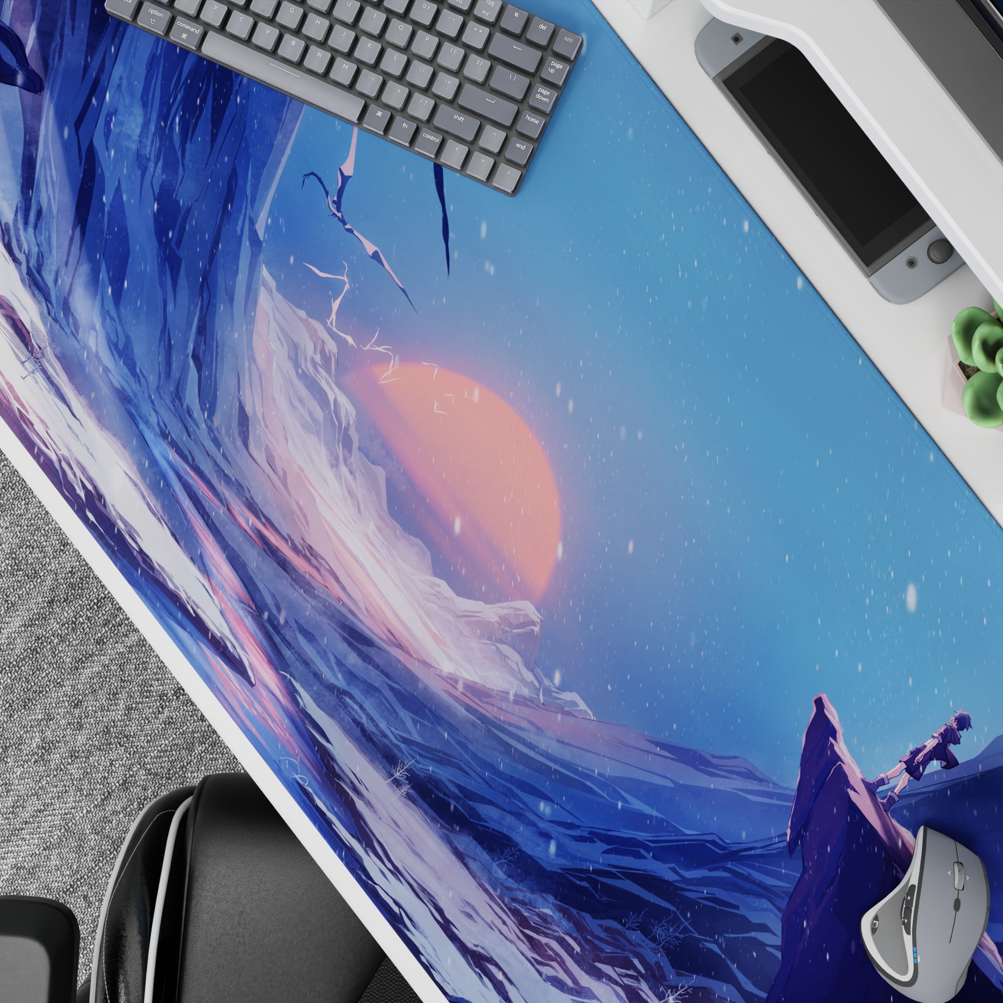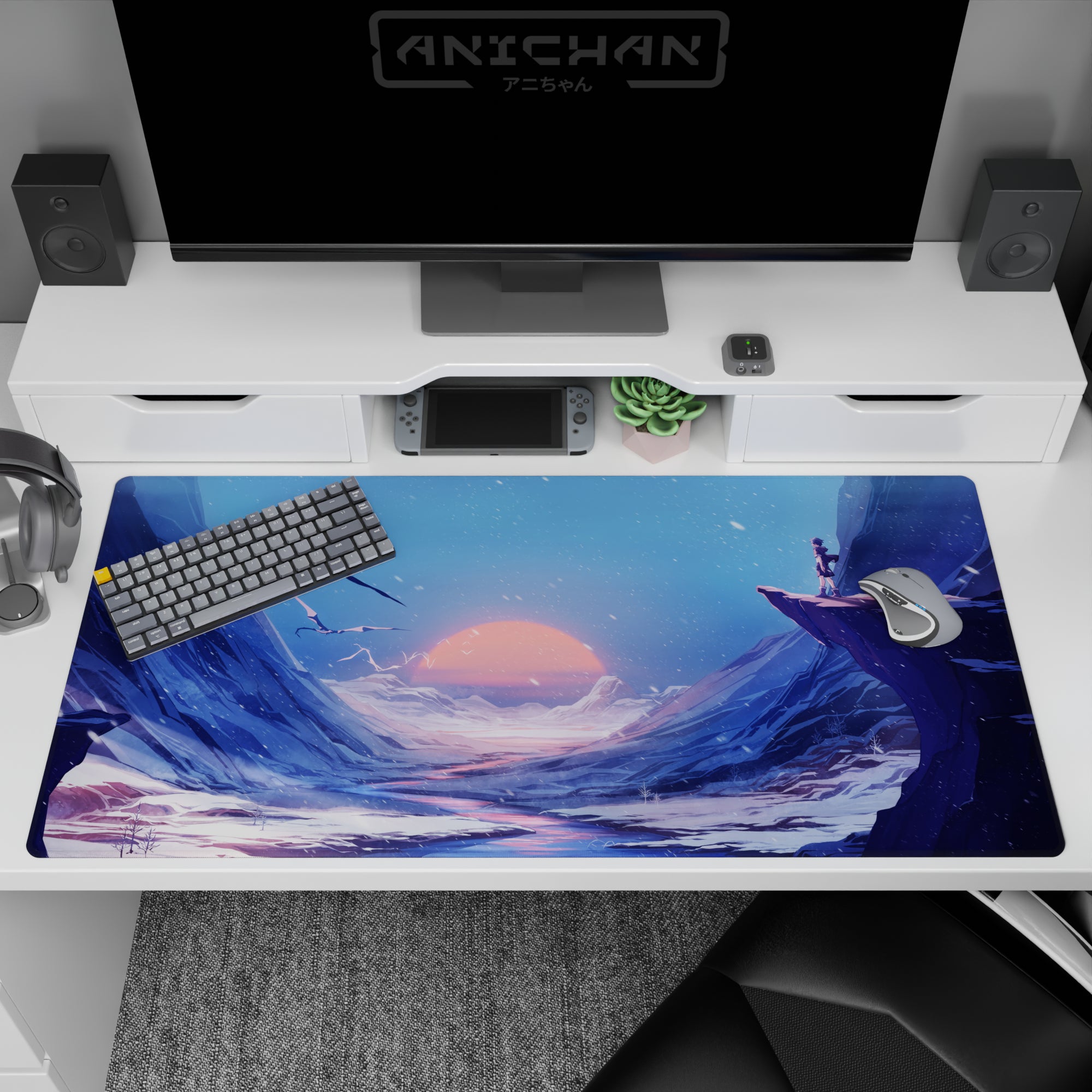Anime mouse pad with a lone adventurer on a jagged cliff under deep blue and icy purple skies, birds in flight, and a coral sun over a glowing river. Calm, cinematic desk vibe with clean composition, snowy texture, and quiet brave mood.