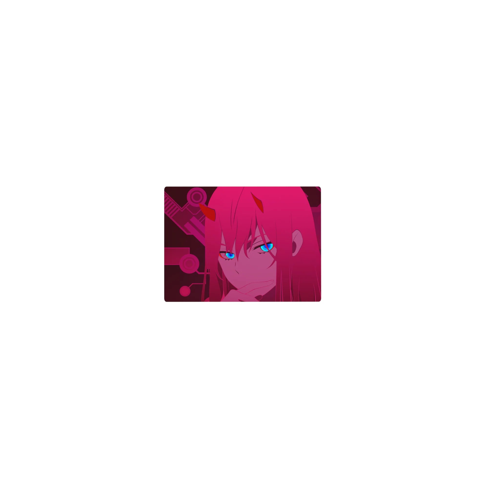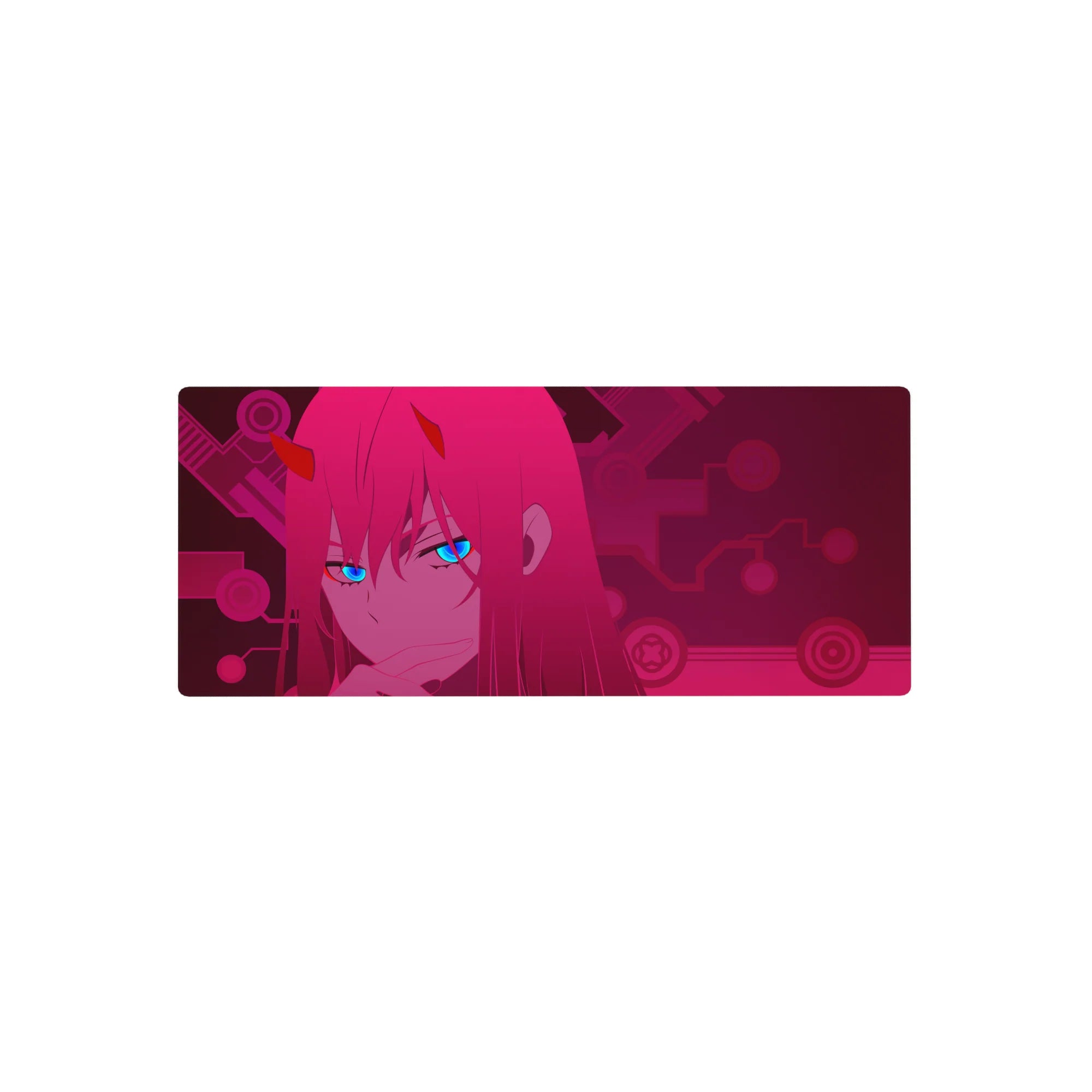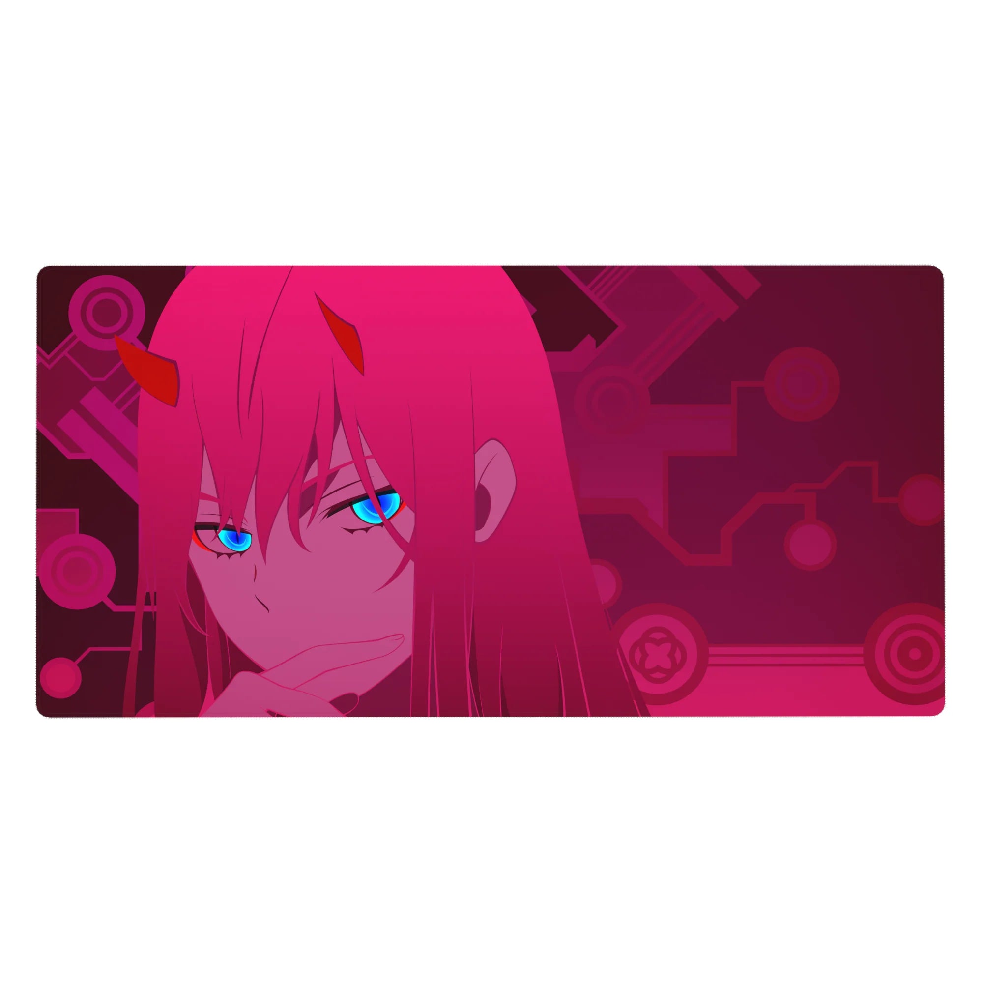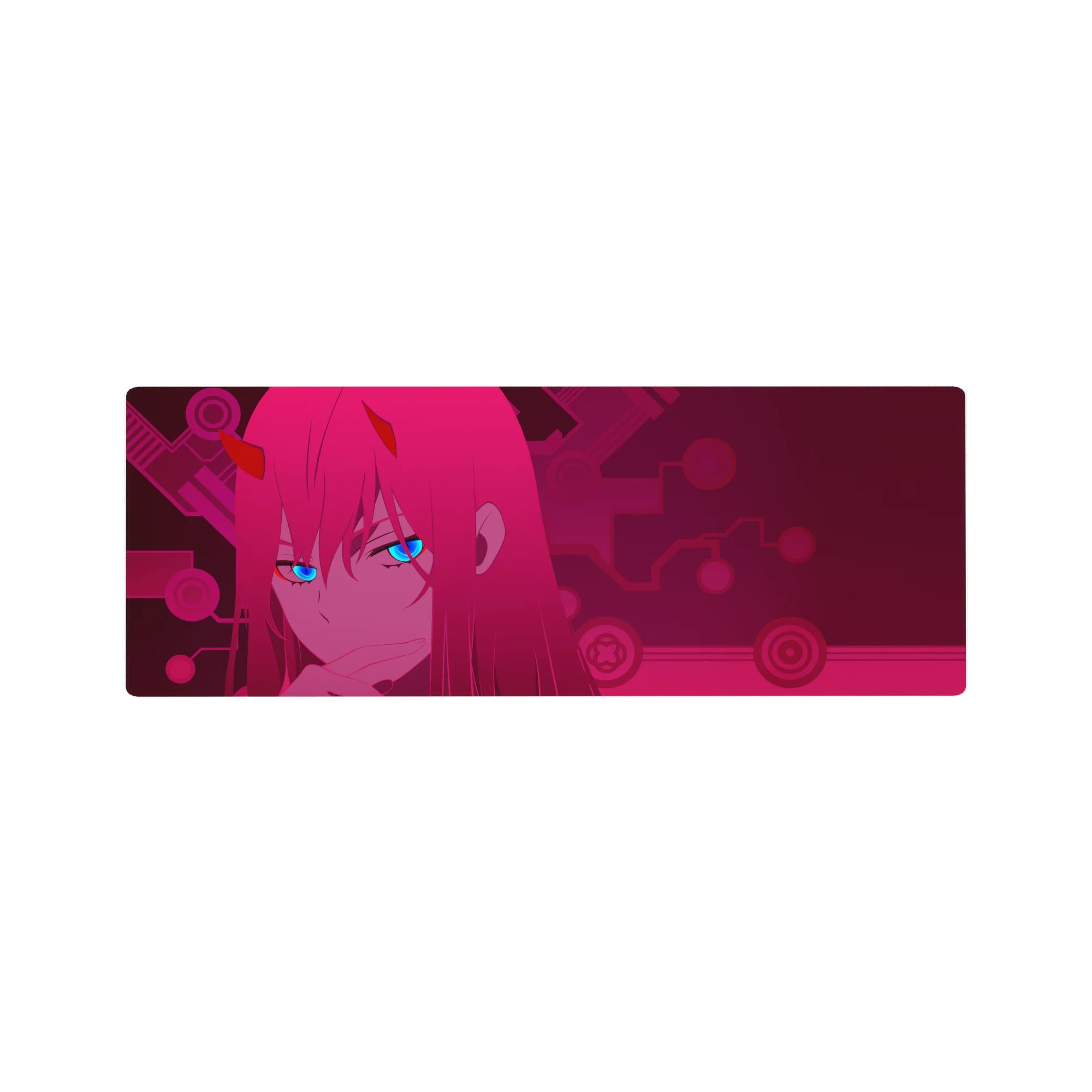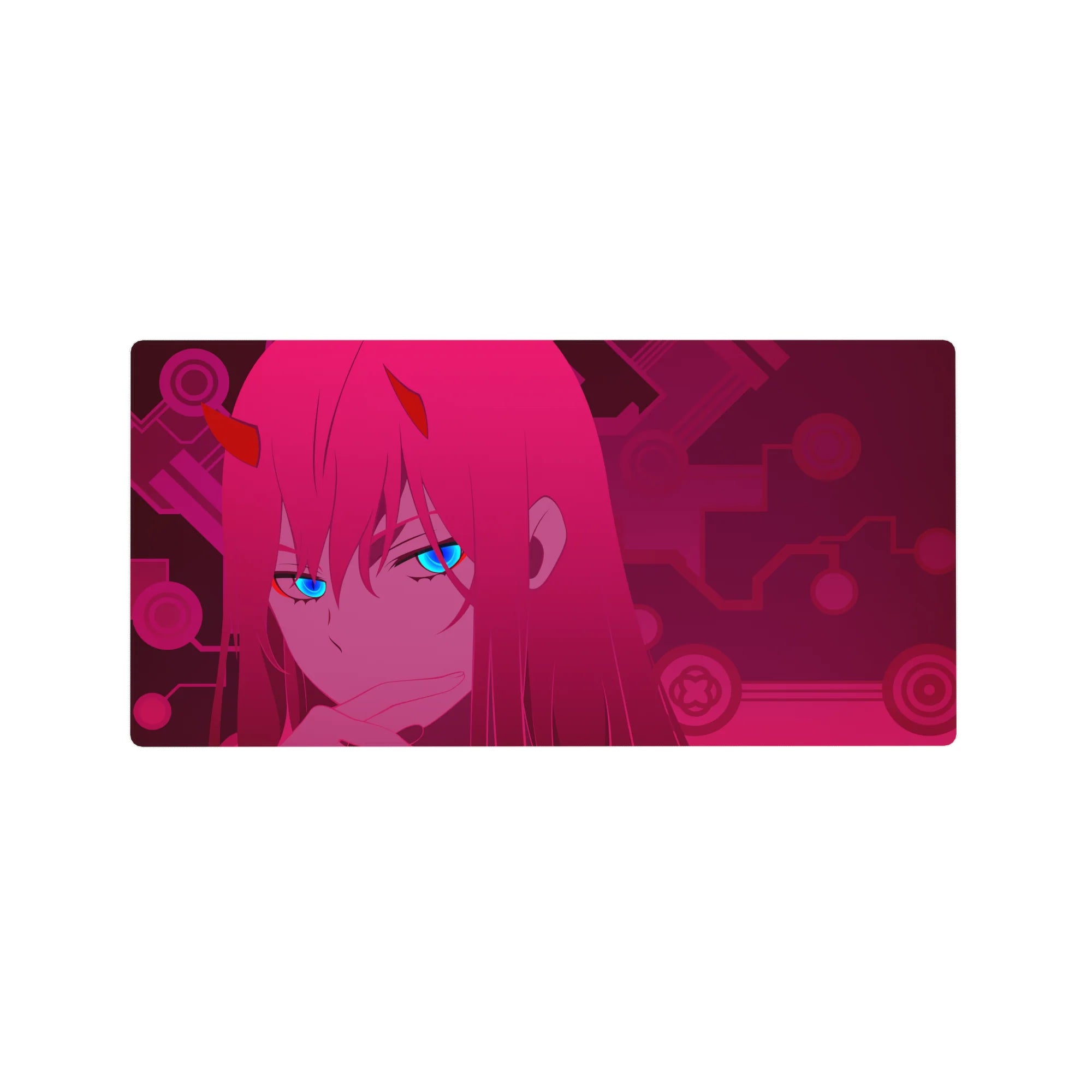 Add a cyberpunk touch to your setup with this Zero Two anime mouse pad. Her electric blue gaze pierces through a dark magenta circuit world, blending futuristic charm and anime flair into one bold design.