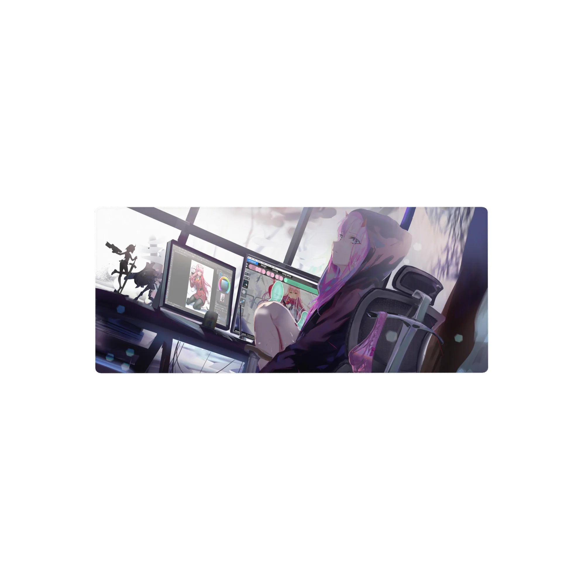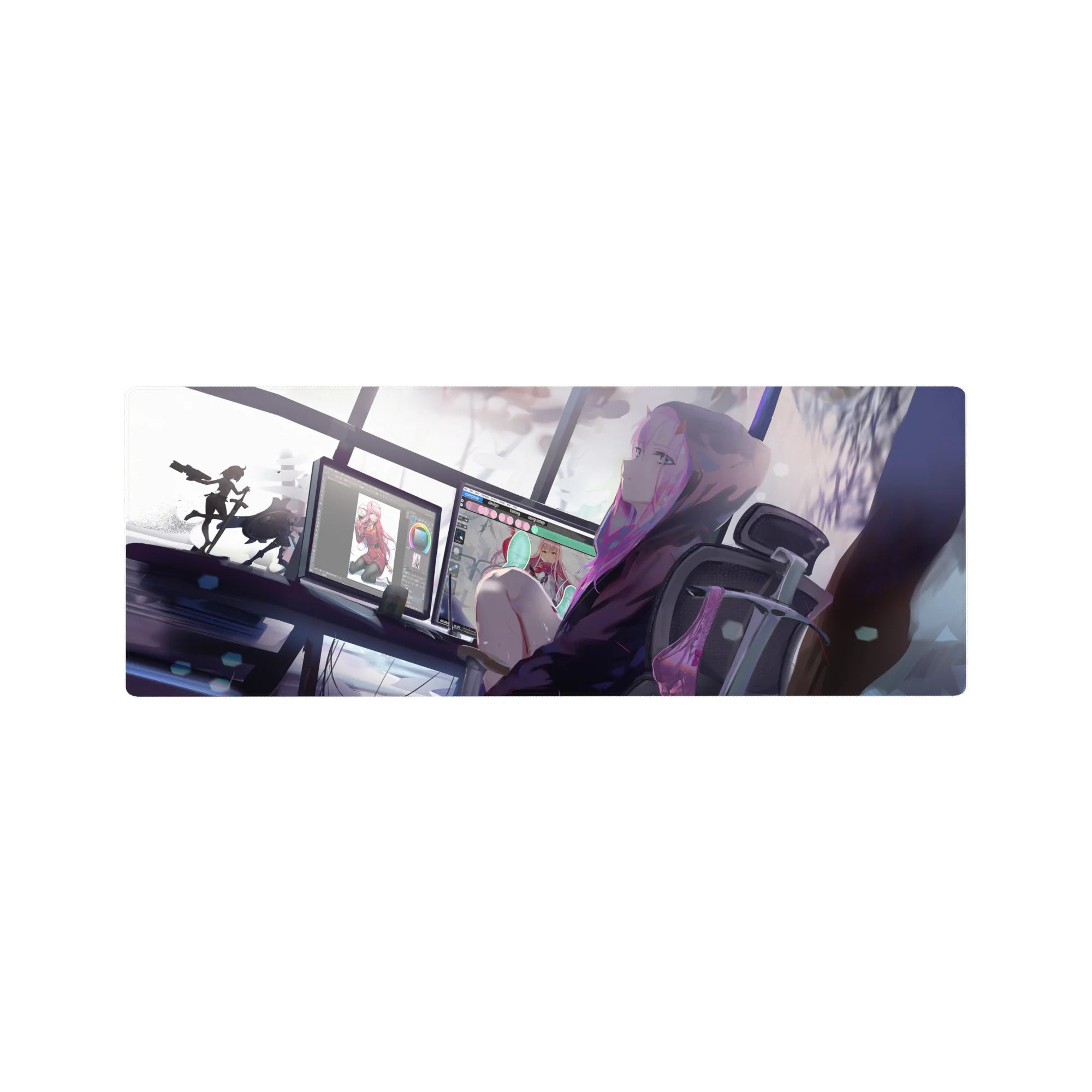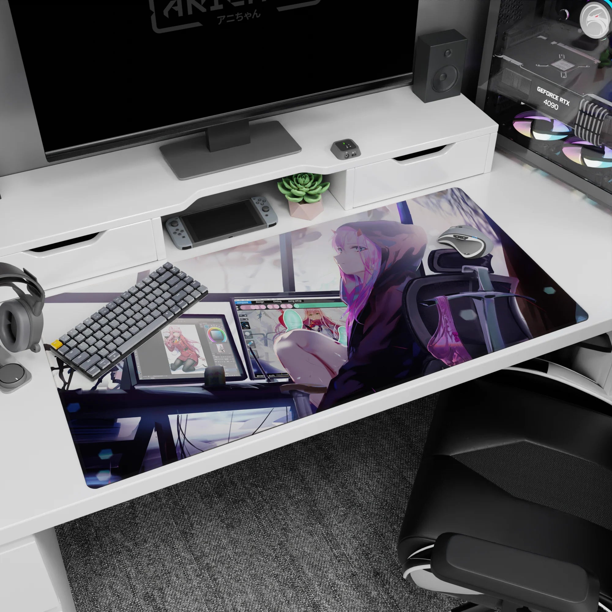 Immerse yourself in the world of Zero Two with this stunning desk mat design. Perfect for Darling in the Franxx fans, it features a mesmerizing fusion of digital artistry and her serene expression. Bring both creativity and style to your setup with this unique piece.