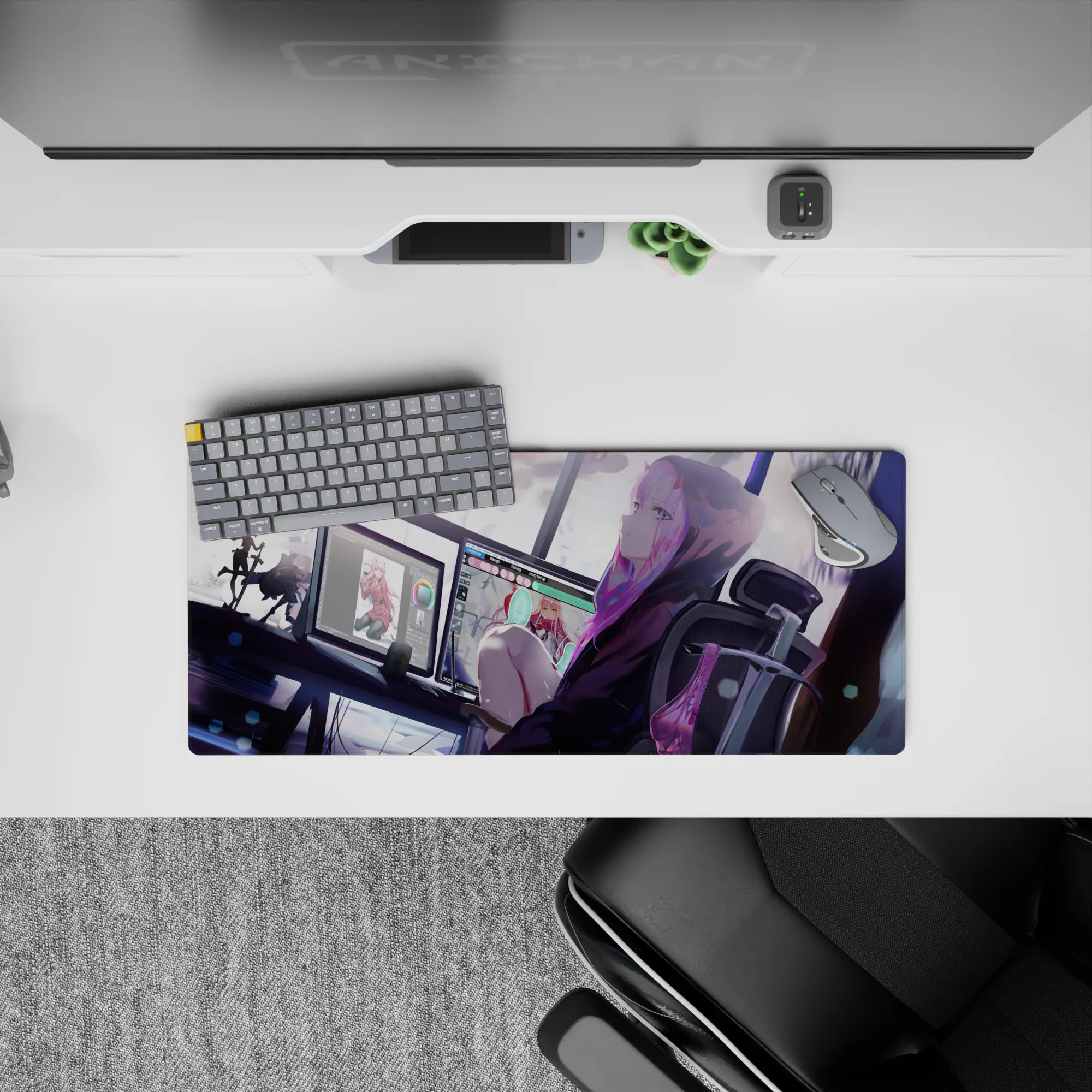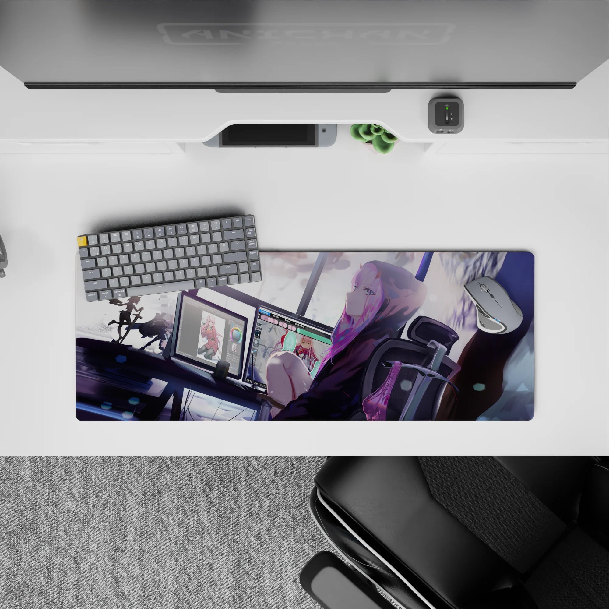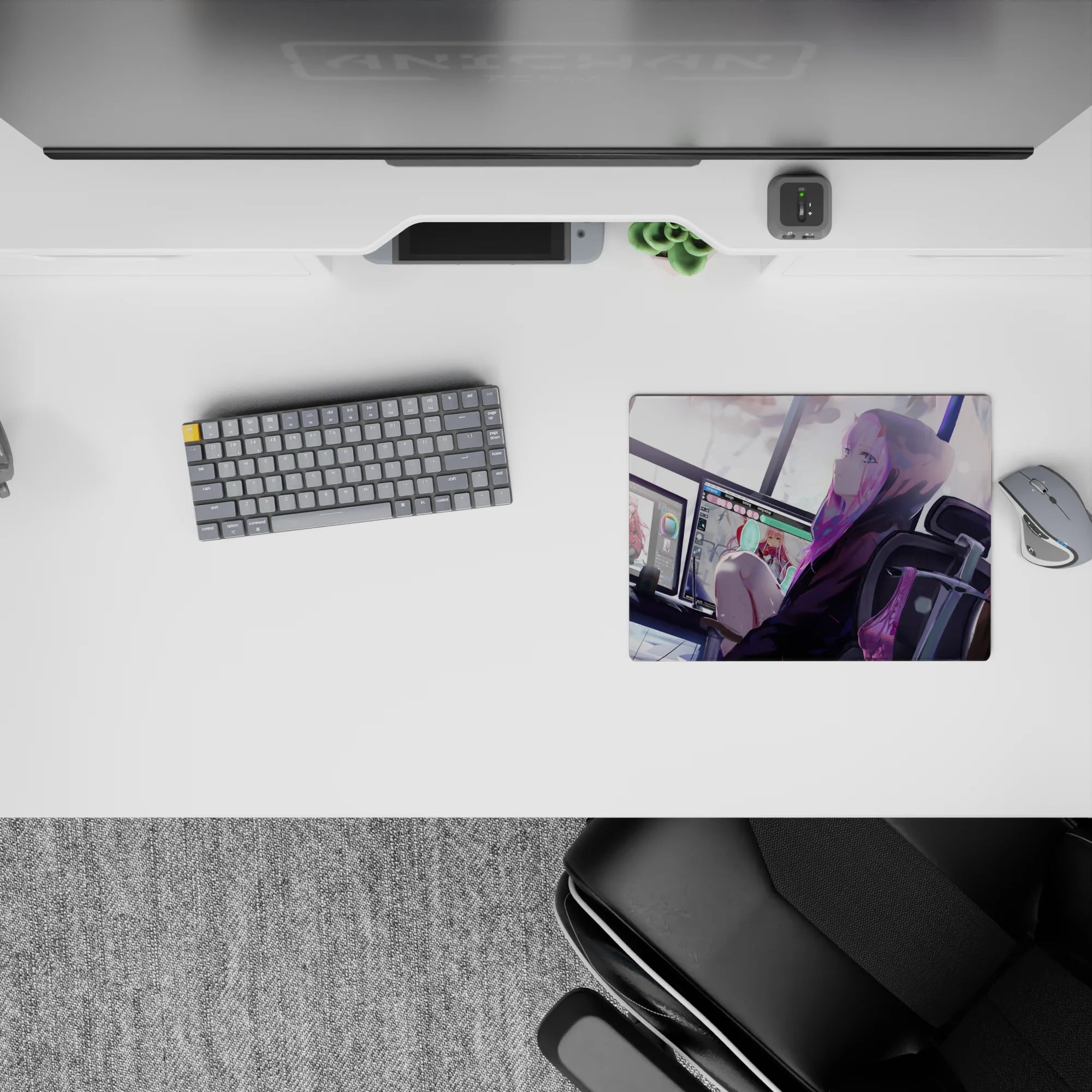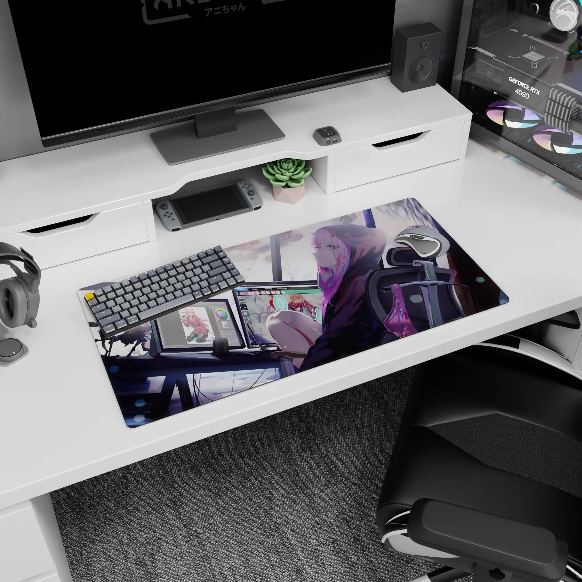 Immerse yourself in the world of Zero Two with this stunning desk mat design. Perfect for Darling in the Franxx fans, it features a mesmerizing fusion of digital artistry and her serene expression. Bring both creativity and style to your setup with this unique piece.