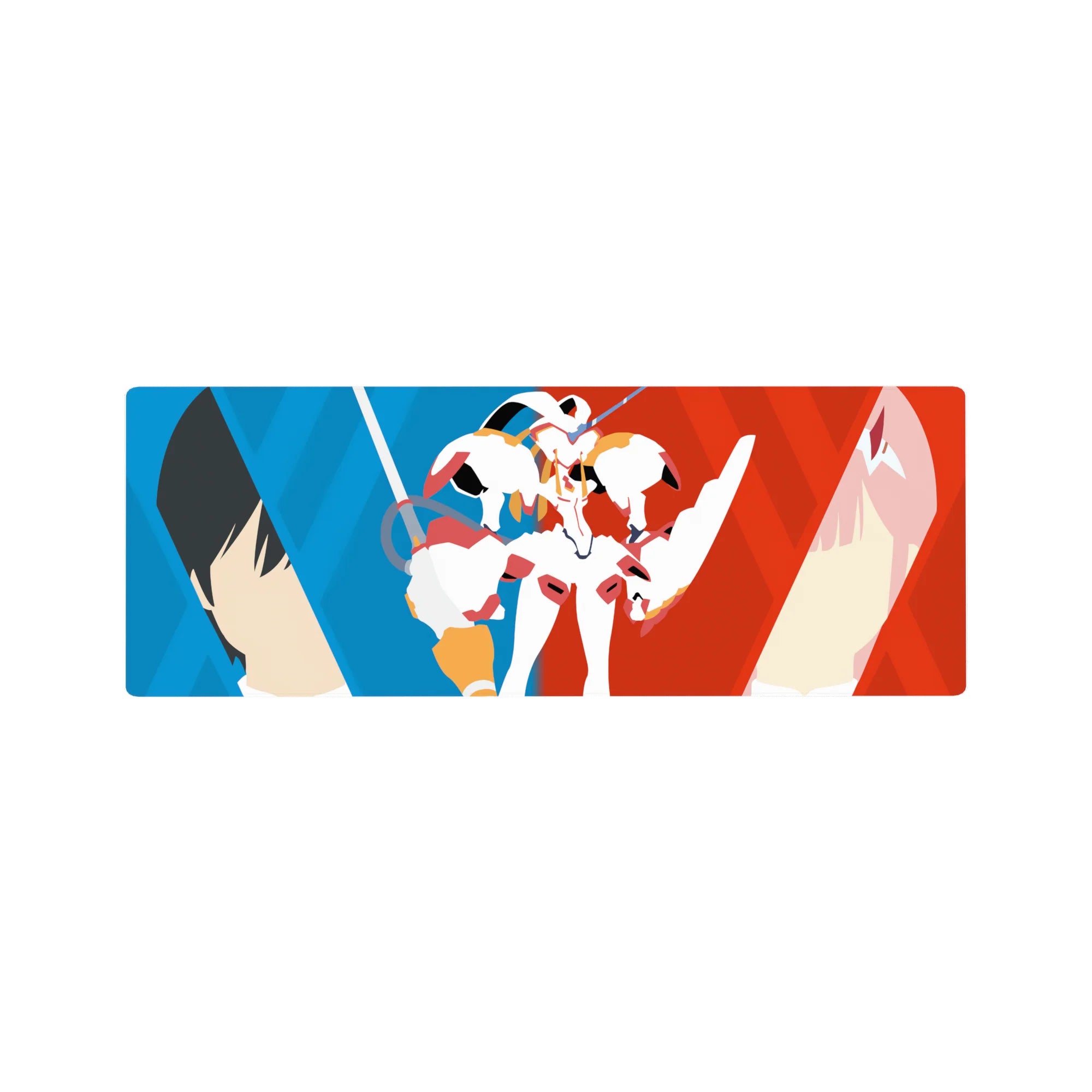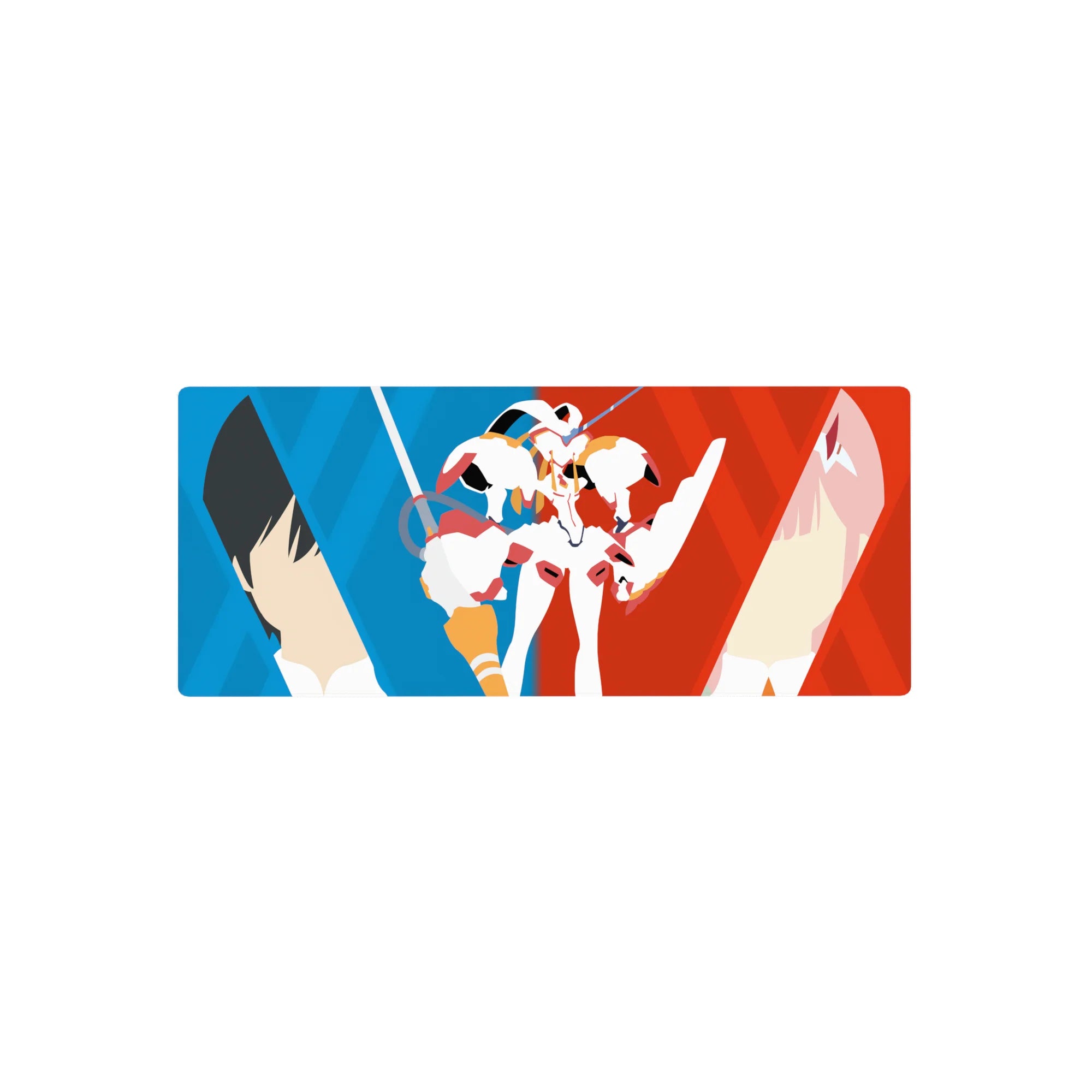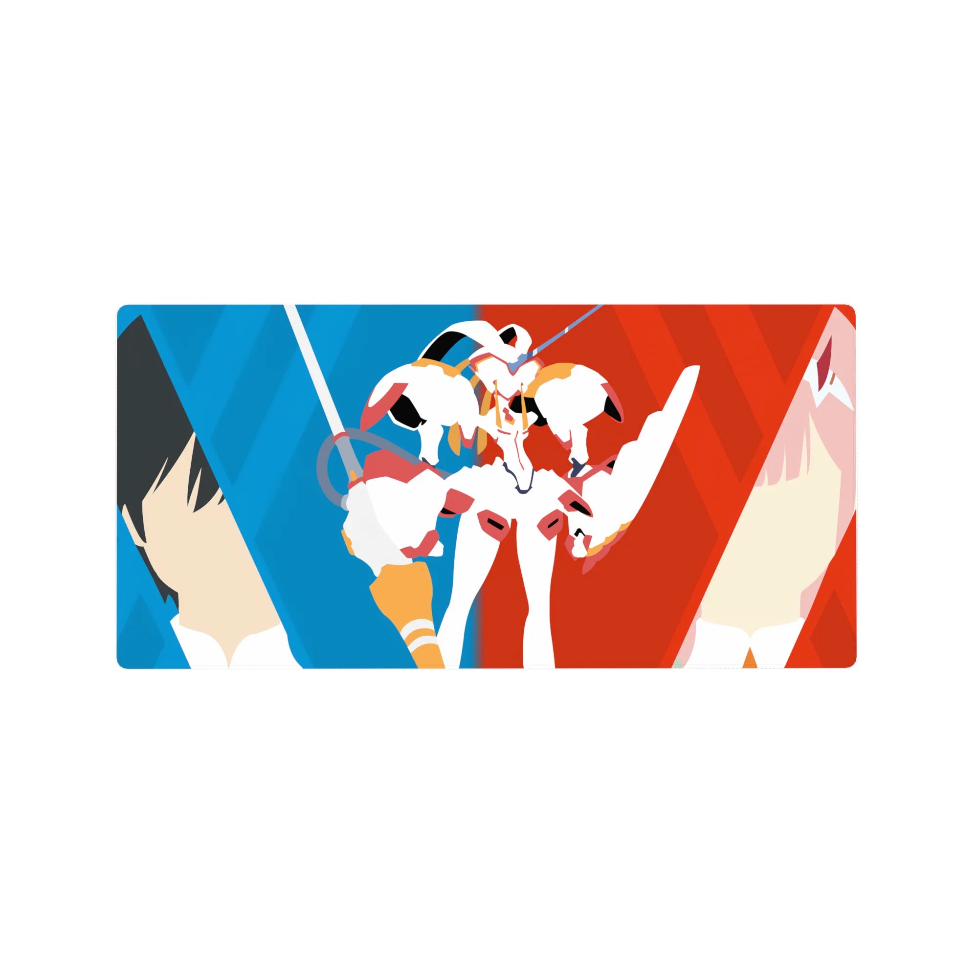This anime mouse pad features Hiro, Zero Two, and Strelizia from Darling in the Franxx in a minimalist vector art style. The bold red and blue split design highlights their bond and destiny, making it a modern anime essential.