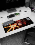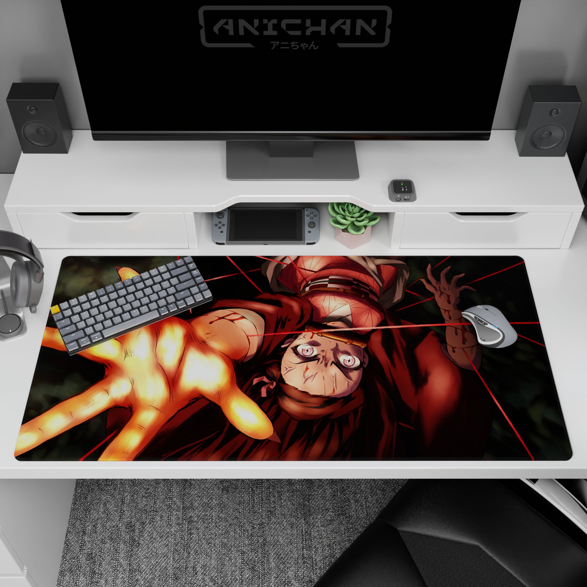Nezuko shines fiercely in this dynamic anime mouse pad, her intense gaze and vivid colors forming a striking contrast that captivates instantly. A mix of firelight and shadow creates a dramatic scene. Perfect for fans seeking bold and unique designs to enhance their gaming setup.