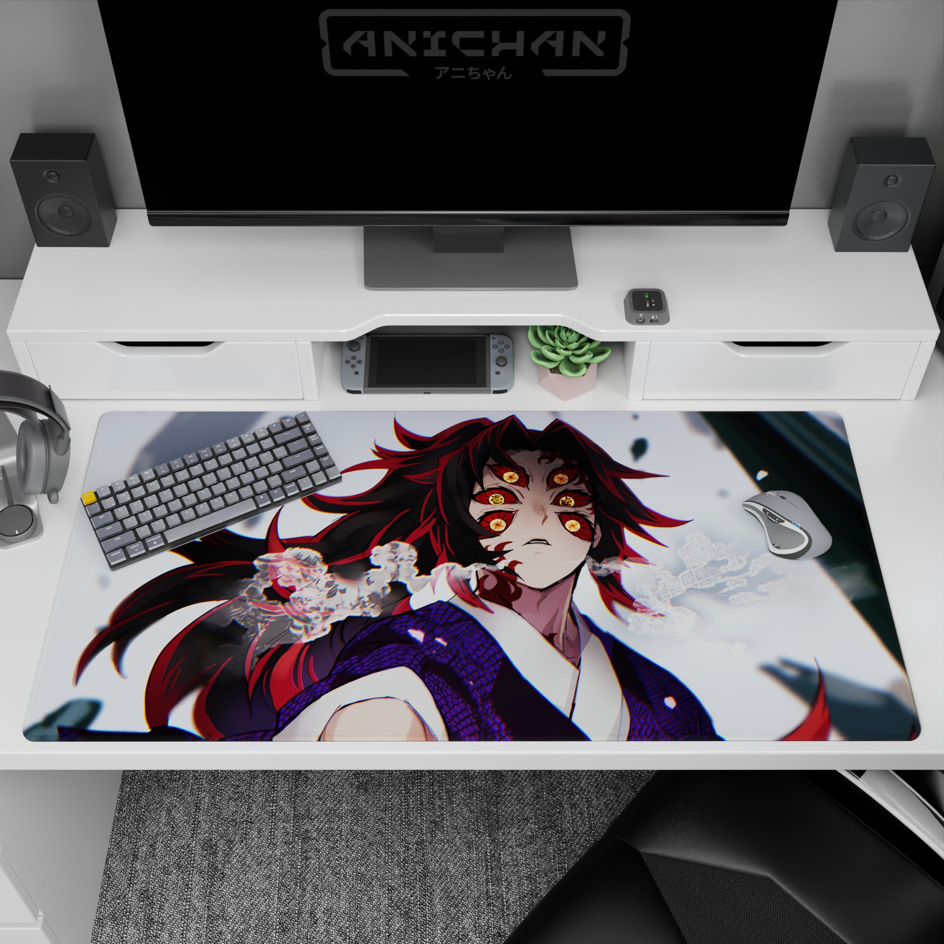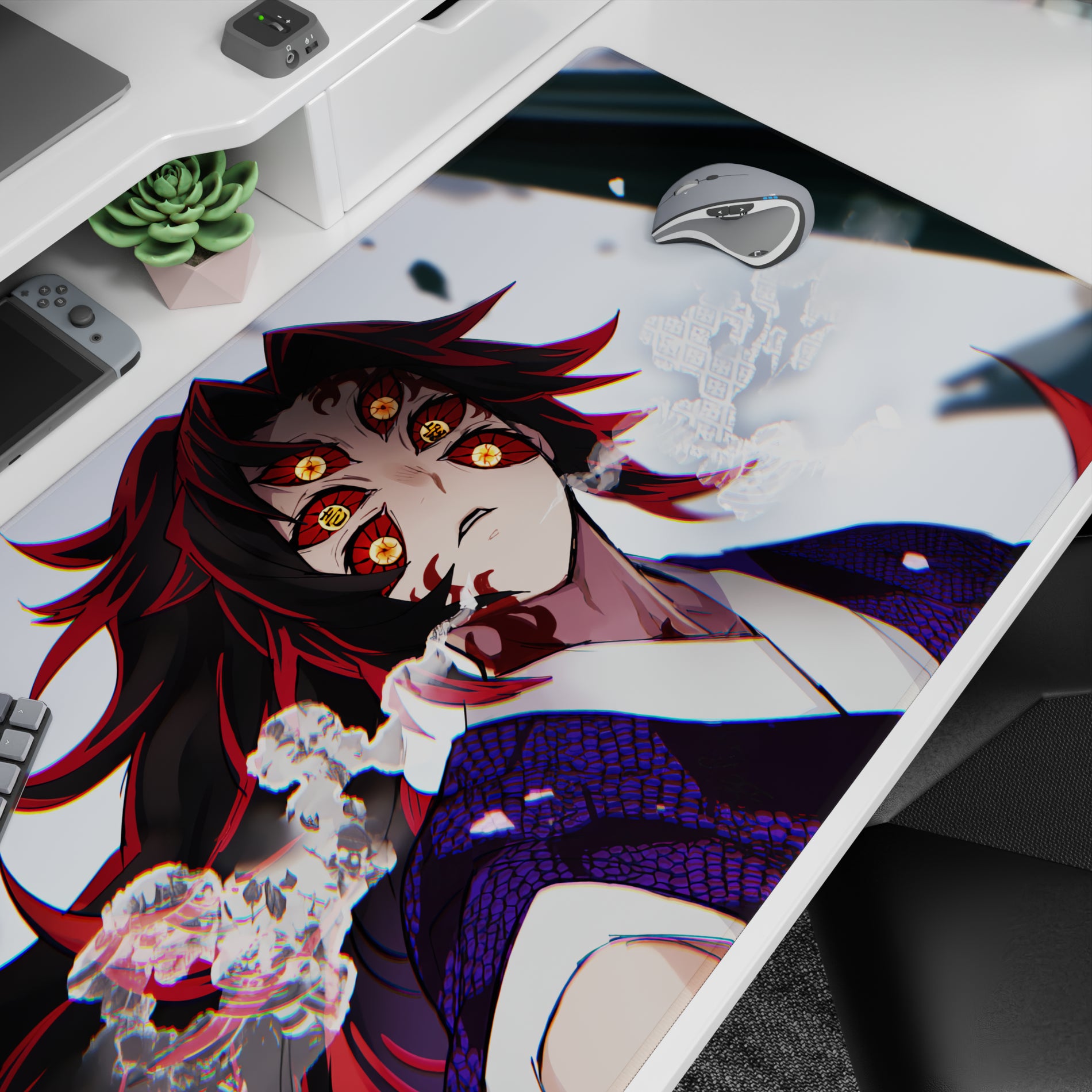 Immerse yourself in the mystique of Kokushibo with this anime mouse pad, showcasing exquisite detail from Demon Slayer. Six amber eyes captivate, amidst swirling reds and blacks. Perfect for fans seeking a touch of dark elegance on their desk, it's a unique Demon Slayer mouse pad experience.