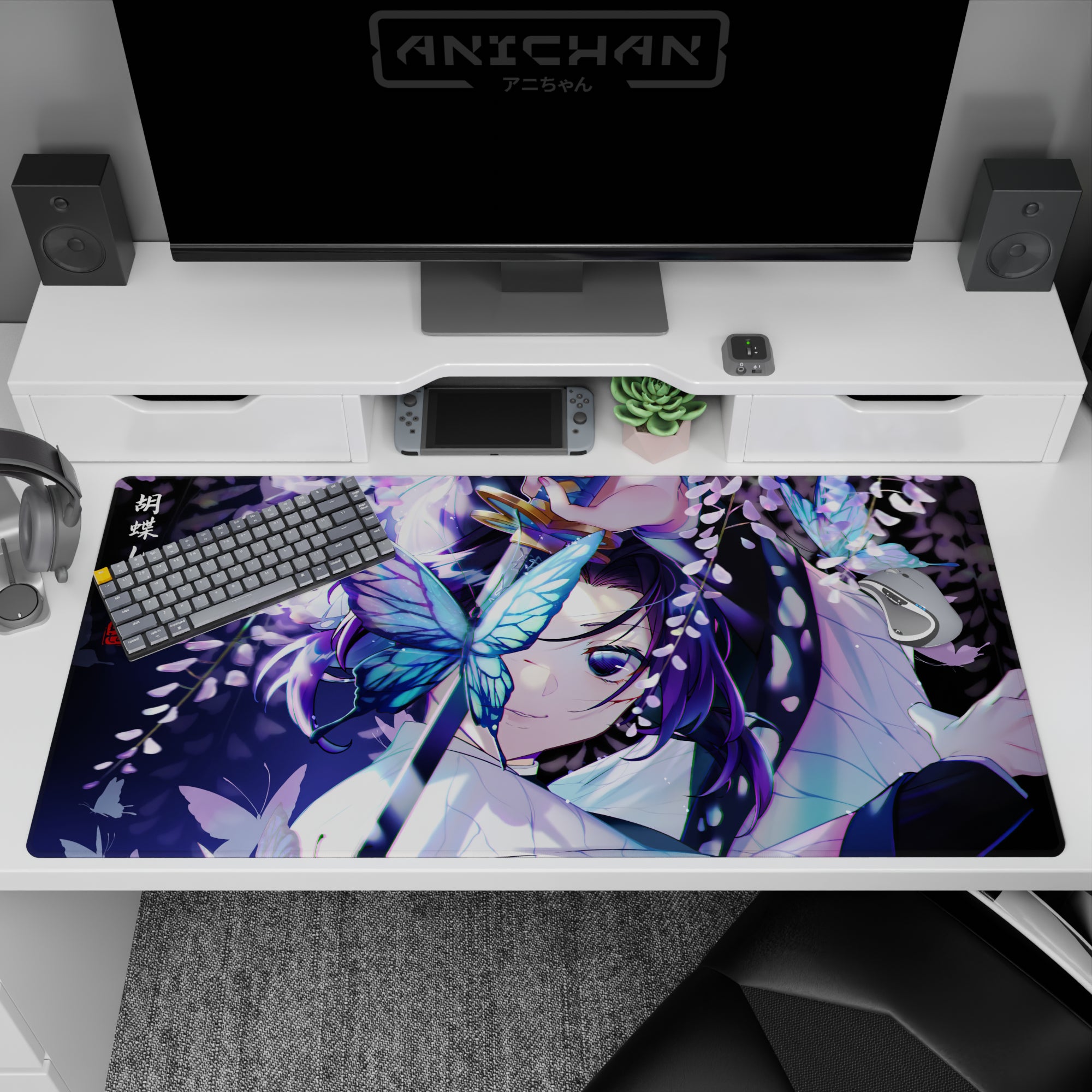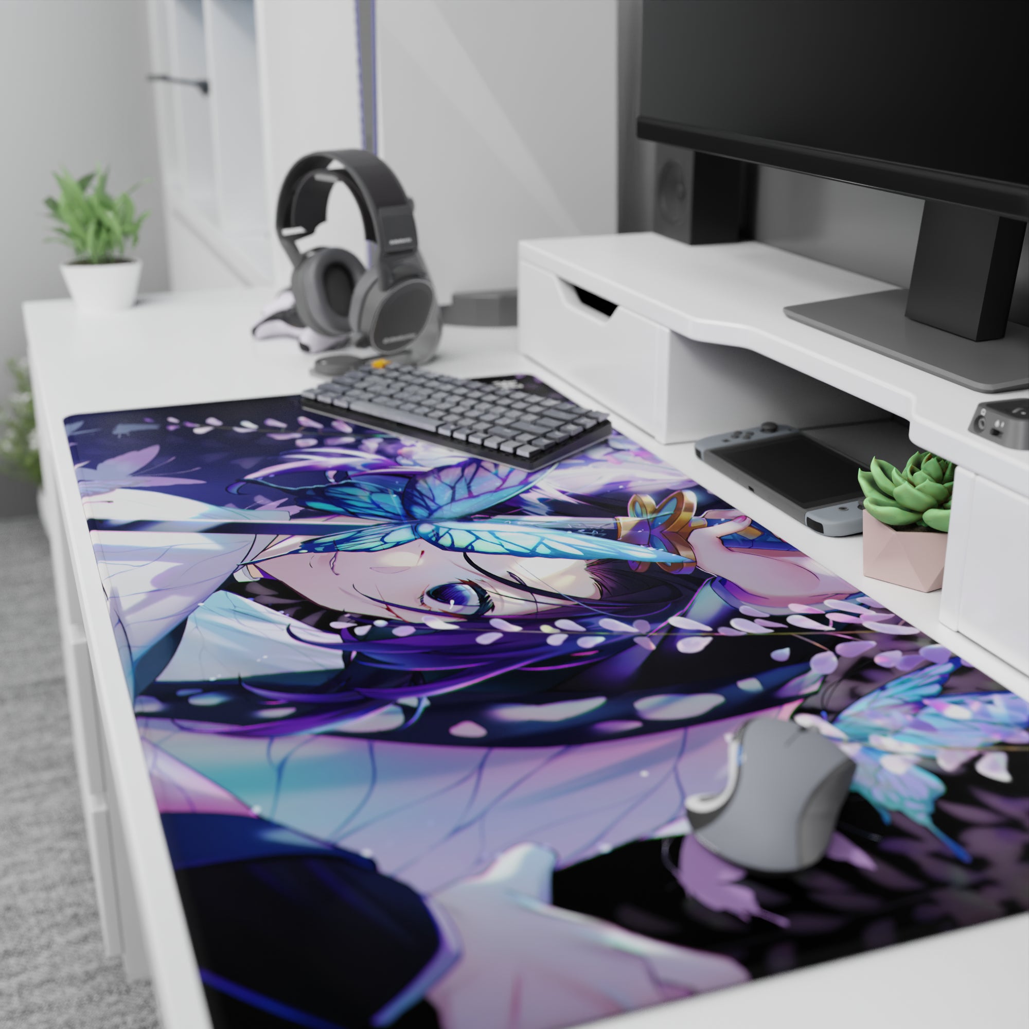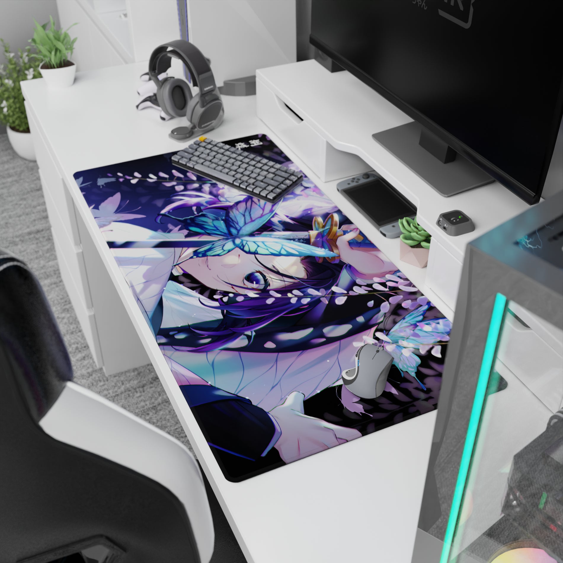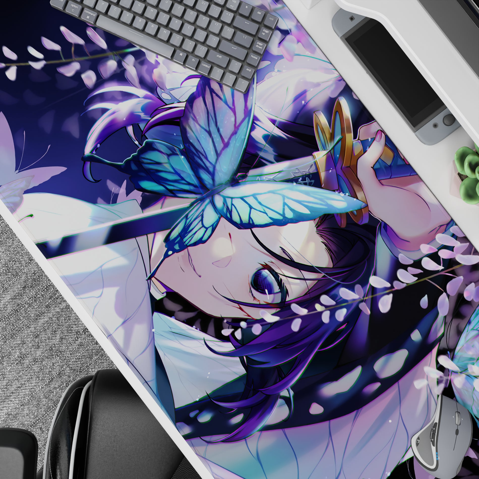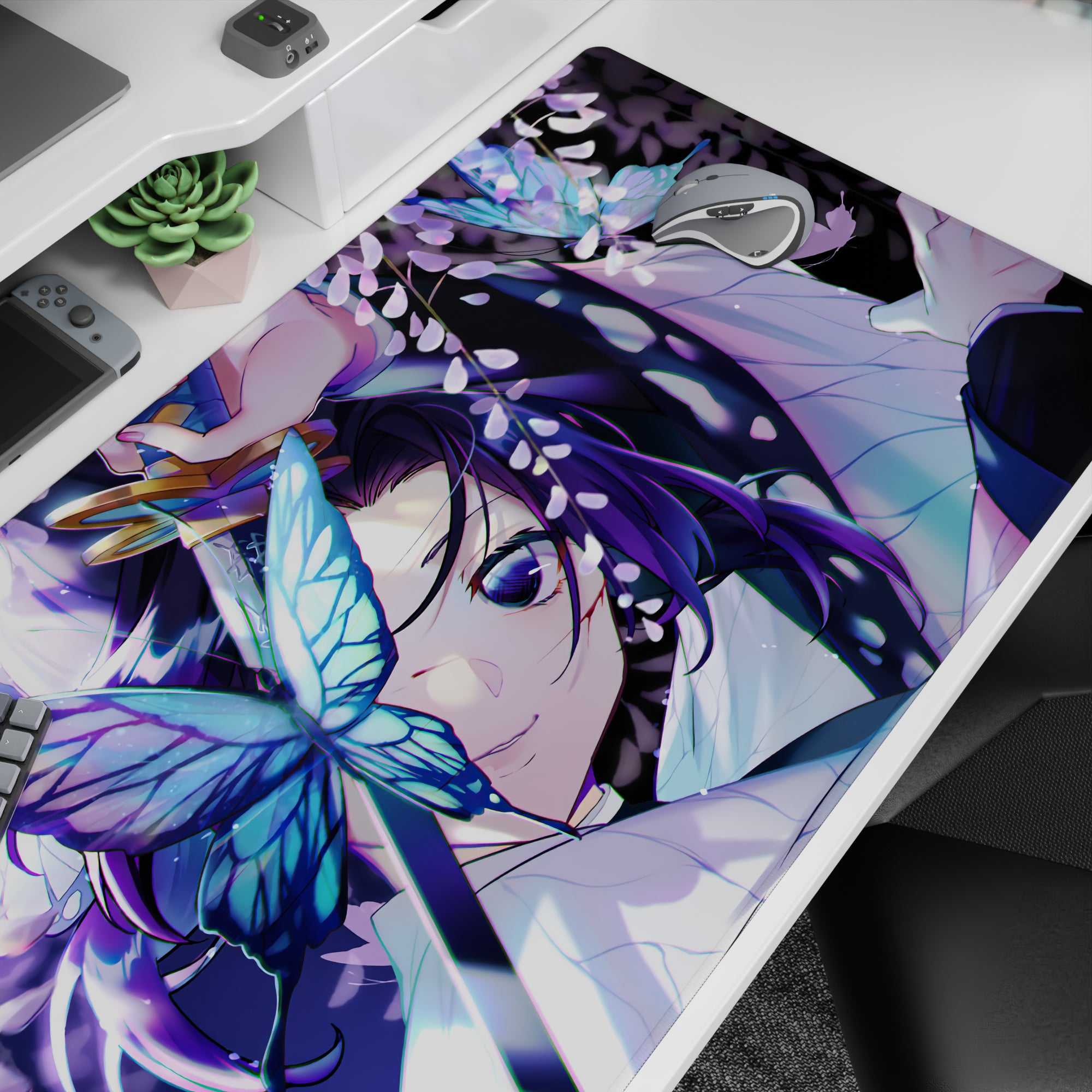 Immerse yourself in the enchanting world of Demon Slayer with this anime mouse pad featuring Shinobu Kocho amidst glowing butterflies and soft wisteria. The serene blend of purples, blues, and whites creates a tranquil yet subtly dangerous aura, making your workspace feel like a dream.