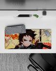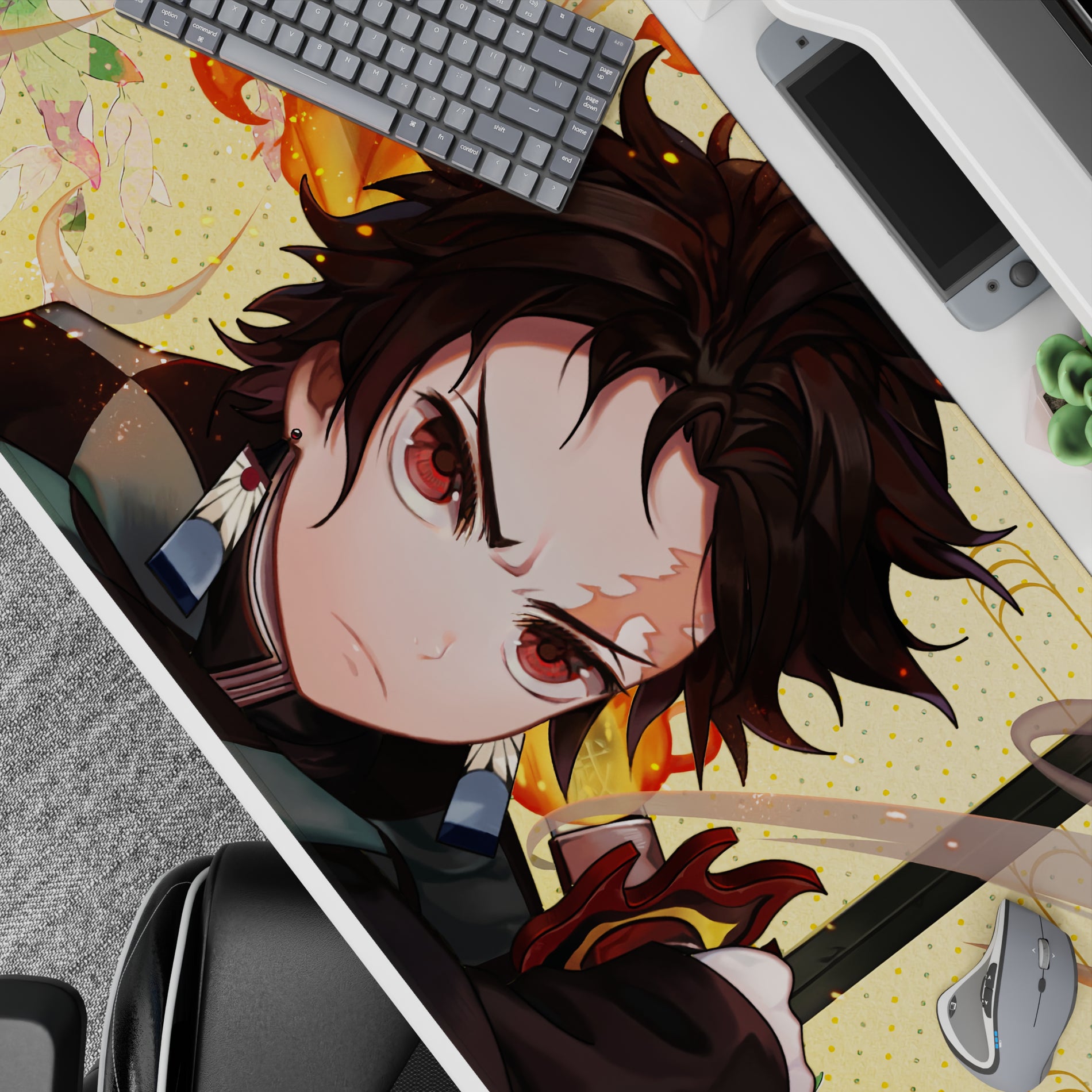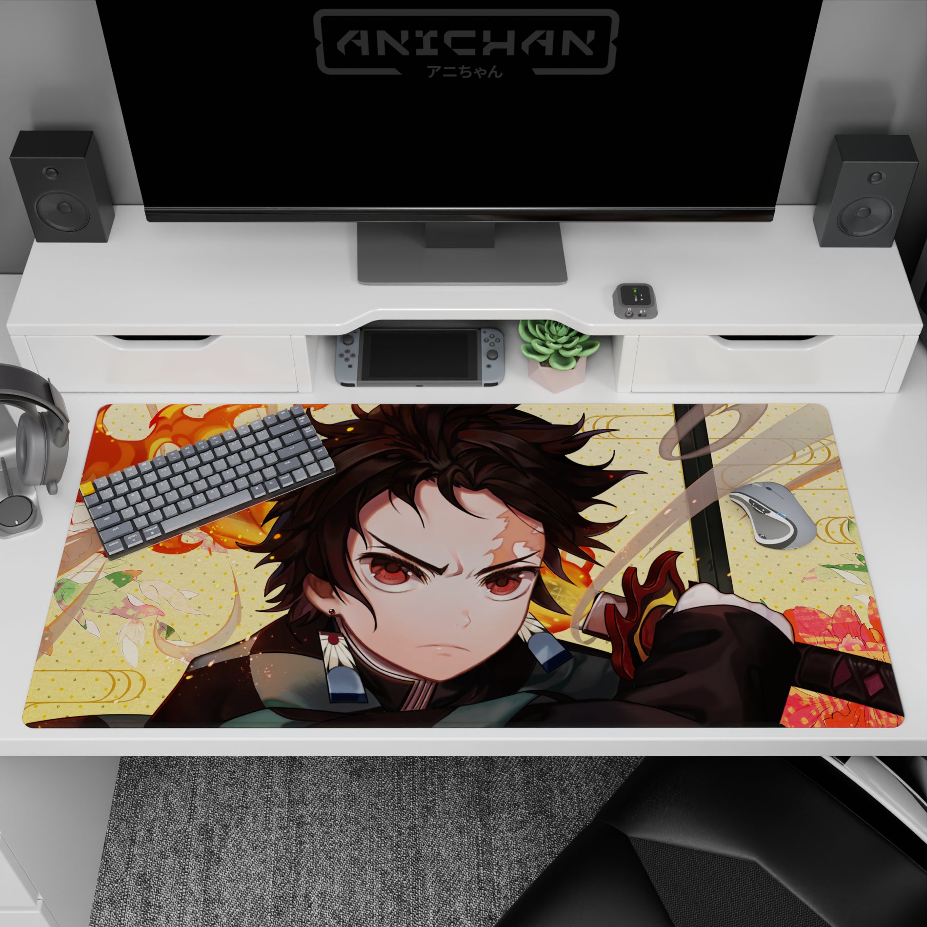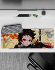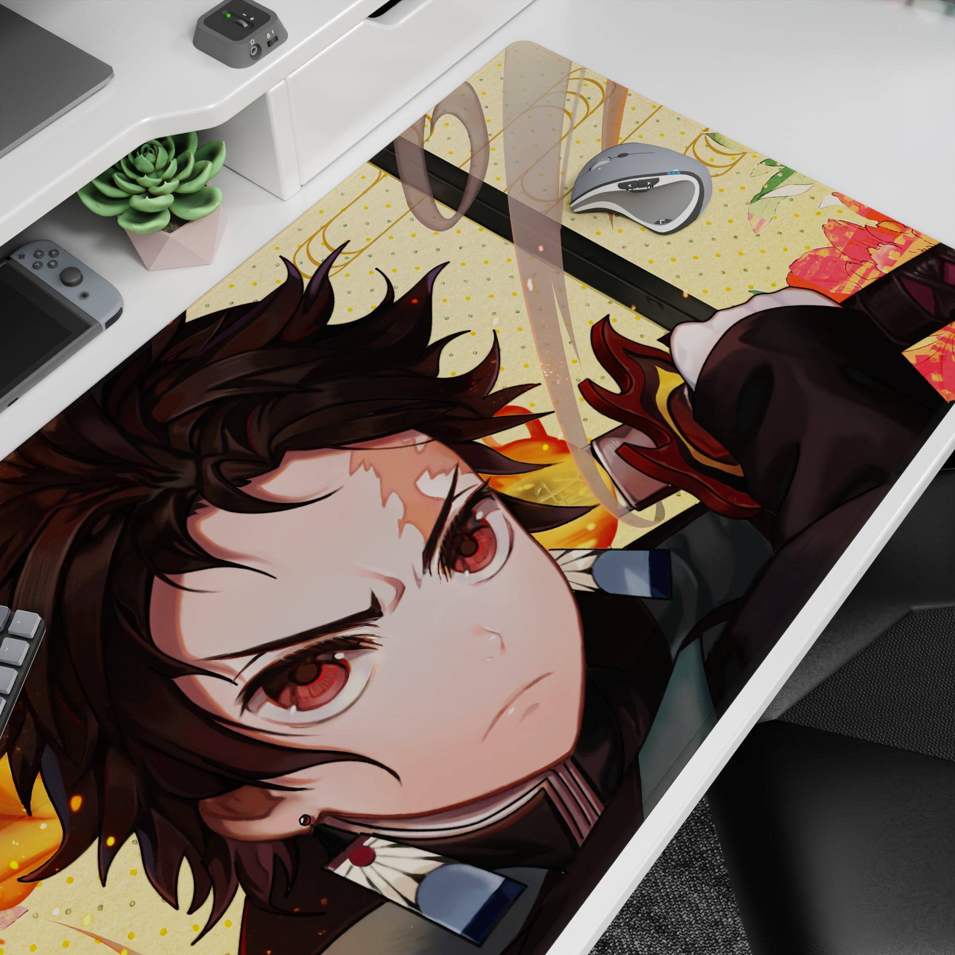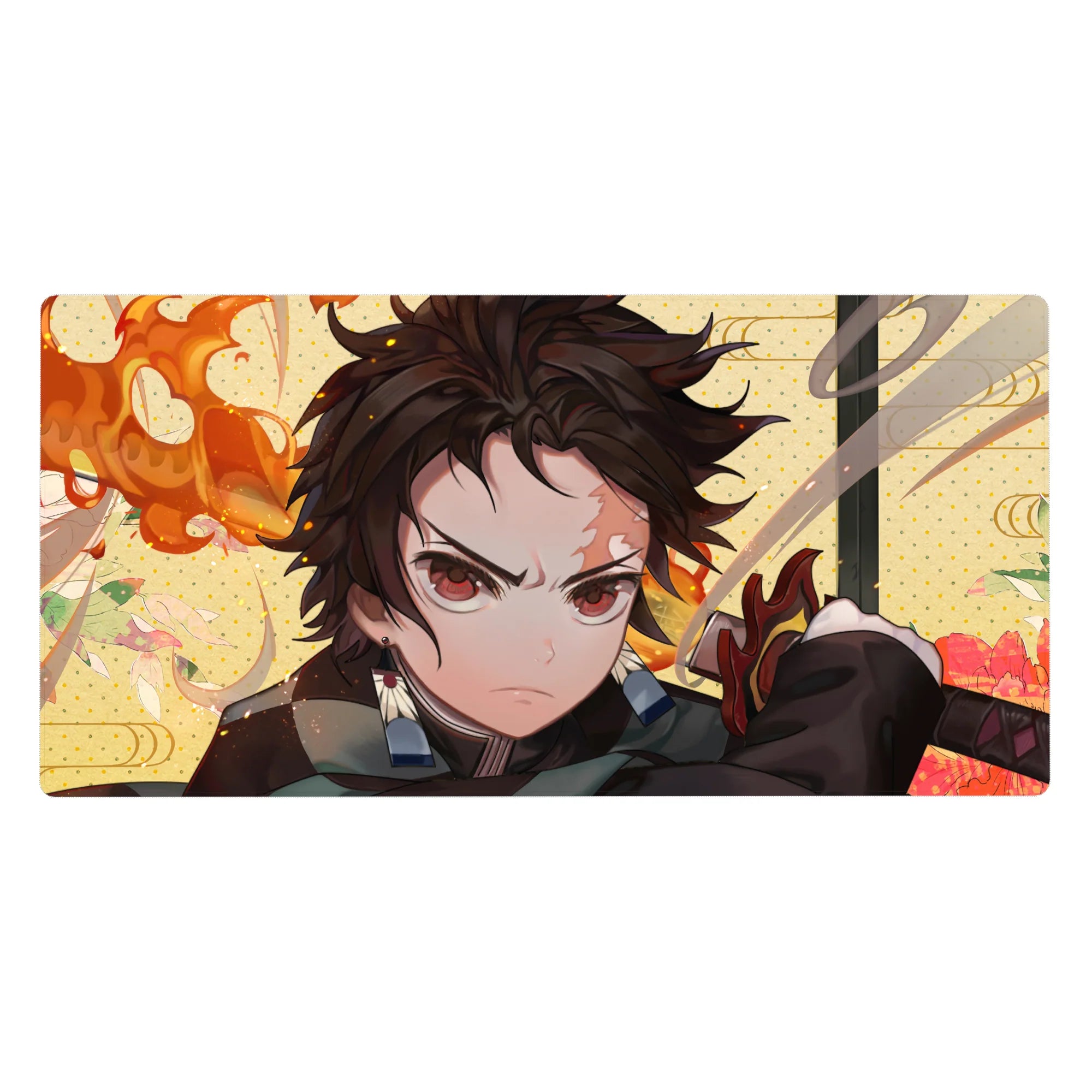 Anime mouse pad featuring Tanjiro with traditional Japanese patterns and vibrant flames. Experience the artistry of a Demon Slayer anime desk pad that combines elegance with intensity. The backdrop's soft yellows and golds complement the striking reds of his eyes and sword.