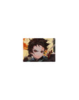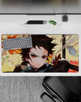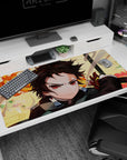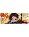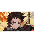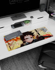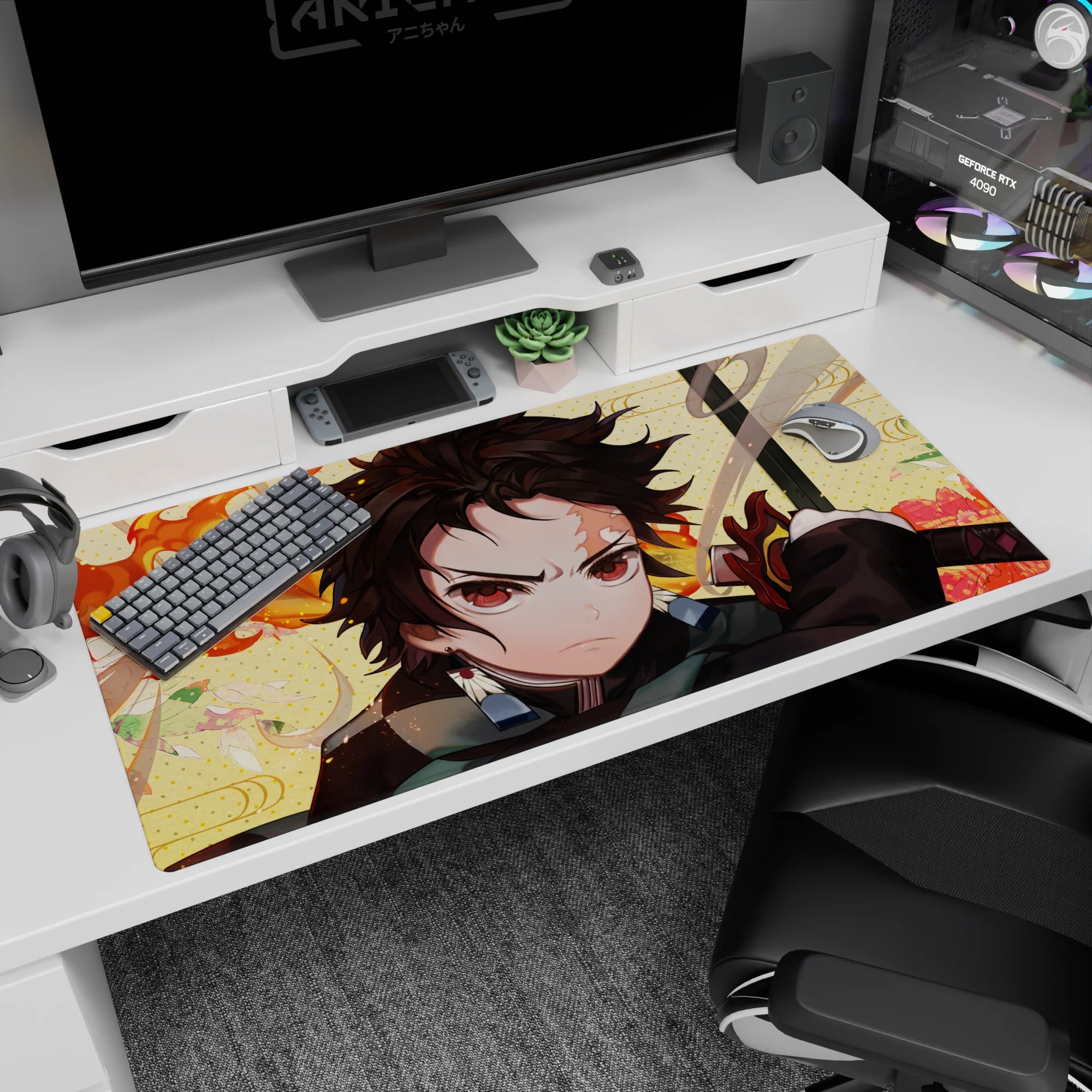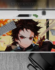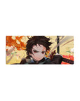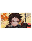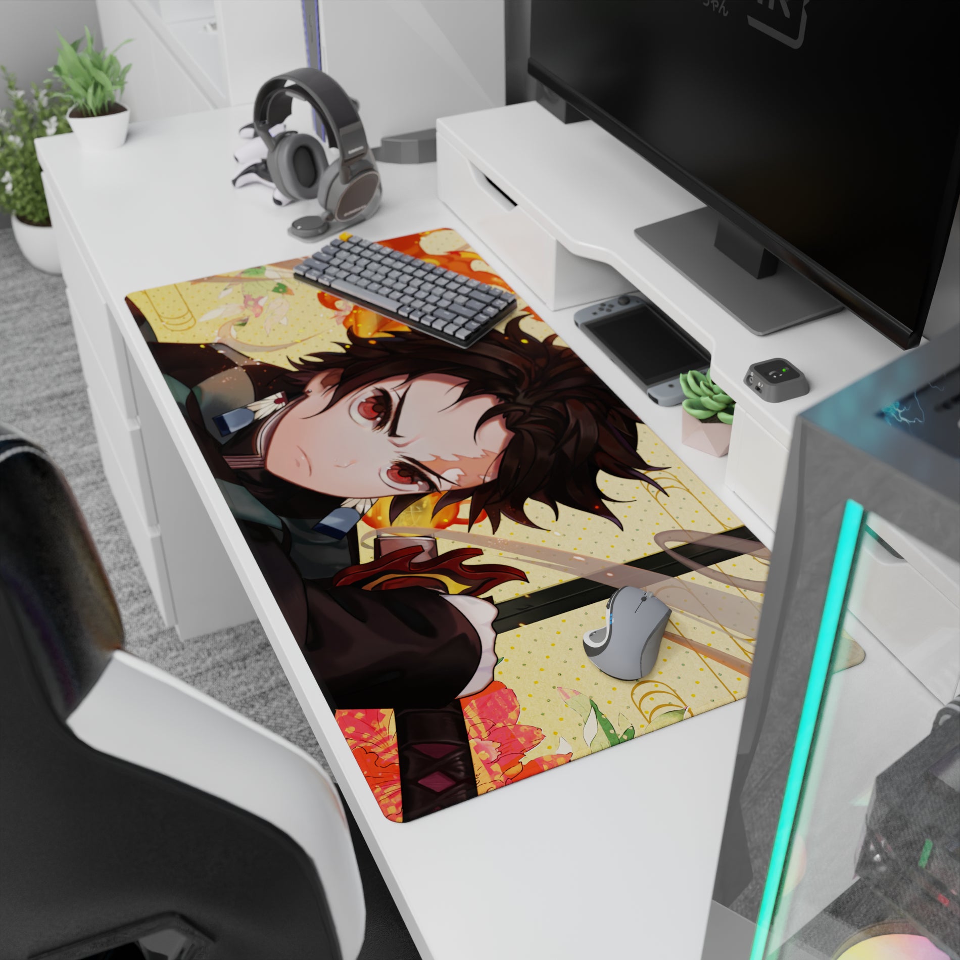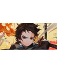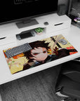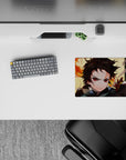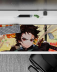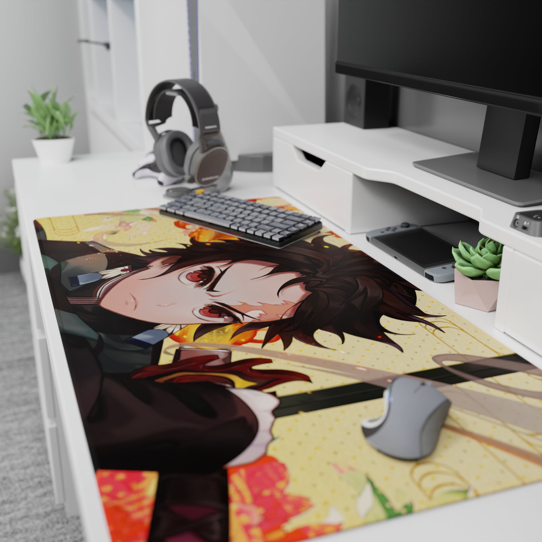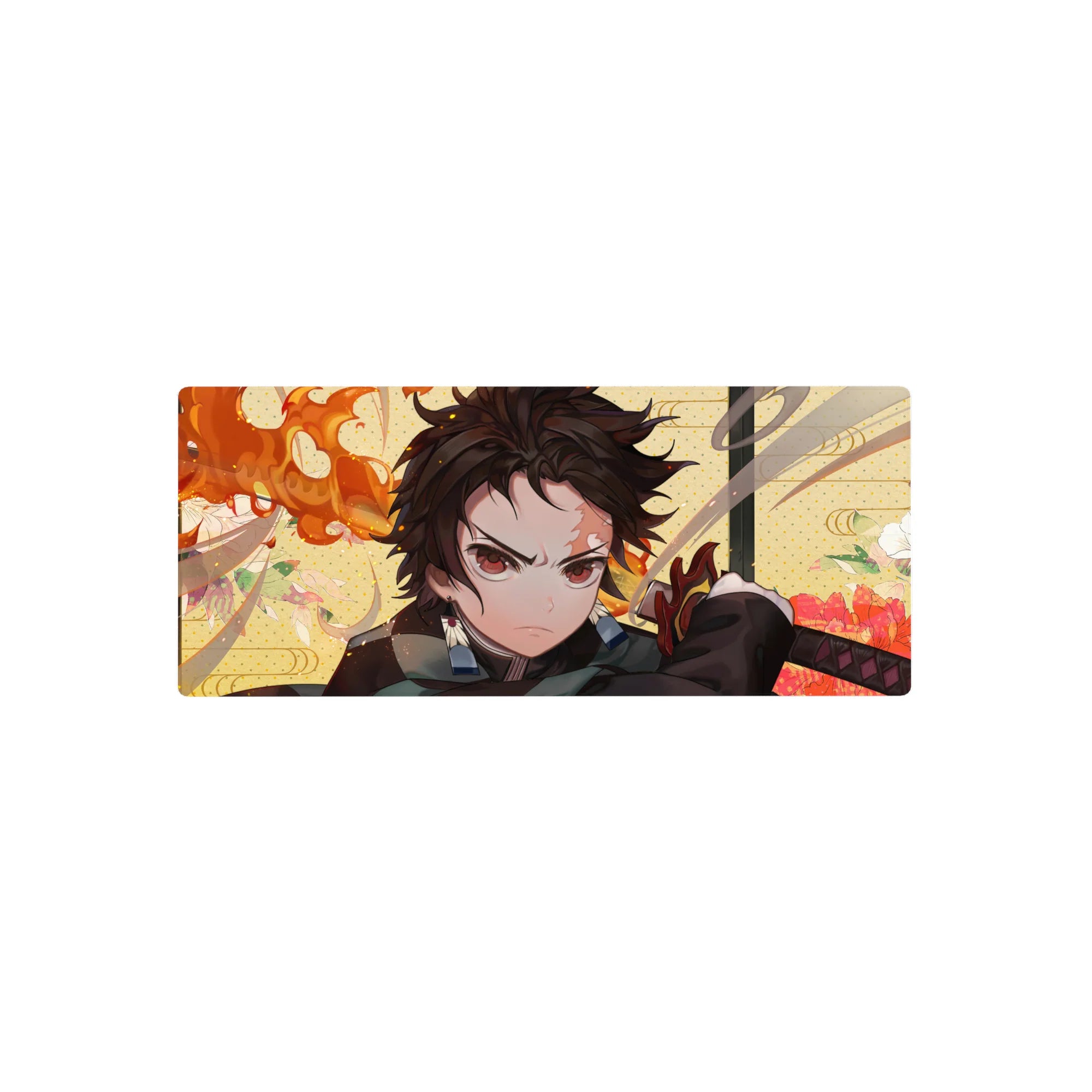 Anime mouse pad featuring Tanjiro with traditional Japanese patterns and vibrant flames. Experience the artistry of a Demon Slayer anime desk pad that combines elegance with intensity. The backdrop's soft yellows and golds complement the striking reds of his eyes and sword.