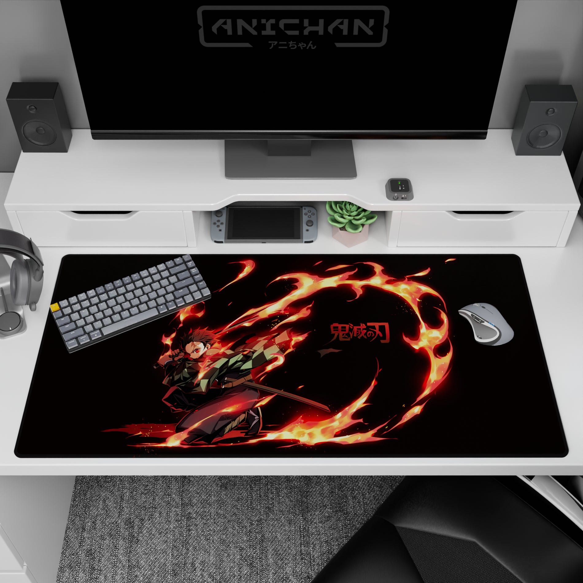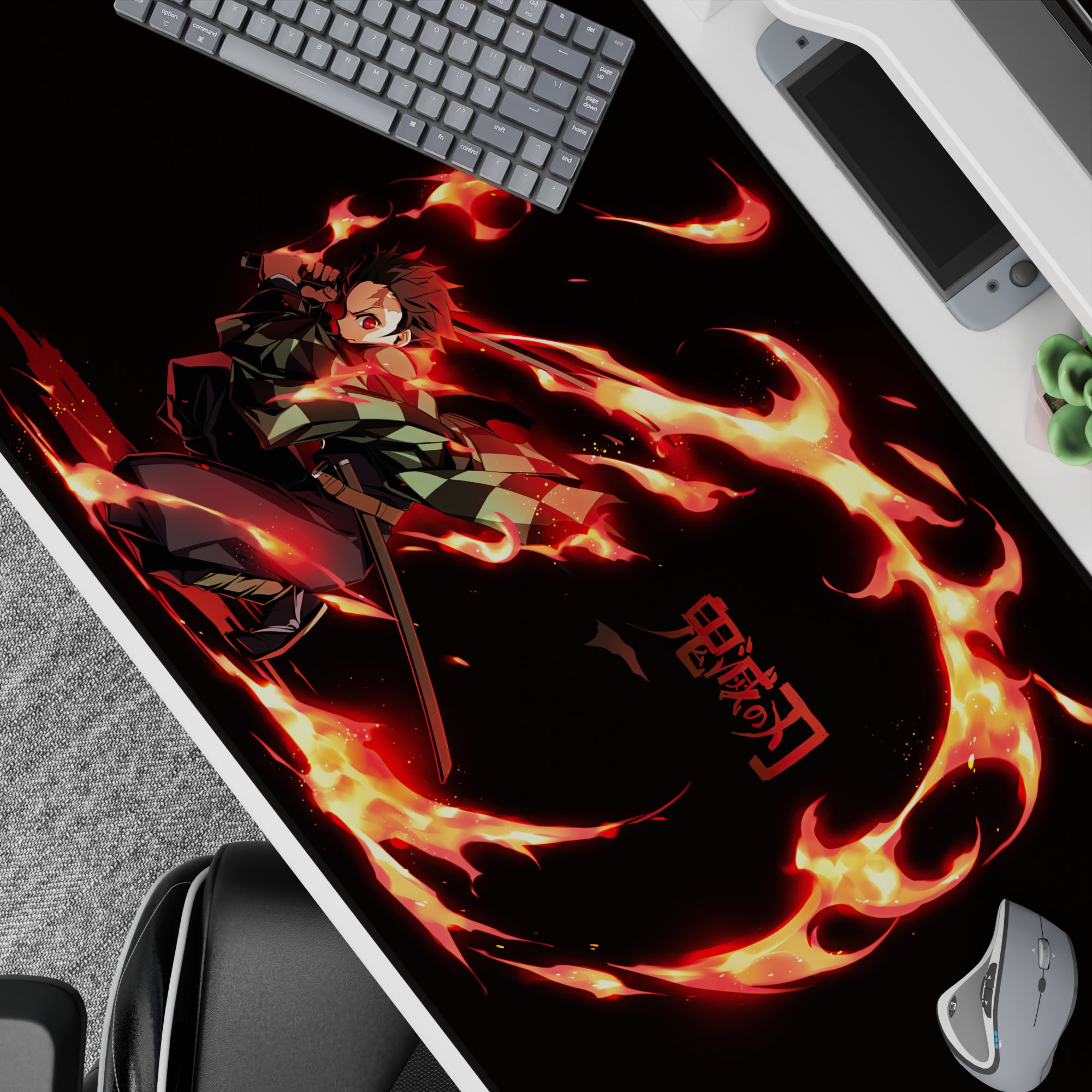 Experience the fiery essence of Tanjiro with our bold anime mouse pad. His dynamic presence is captured vividly; watch as reds and oranges leap from the deep black background, creating a striking contrast. This Demon Slayer anime desk pad is designed to make your workspace pop.