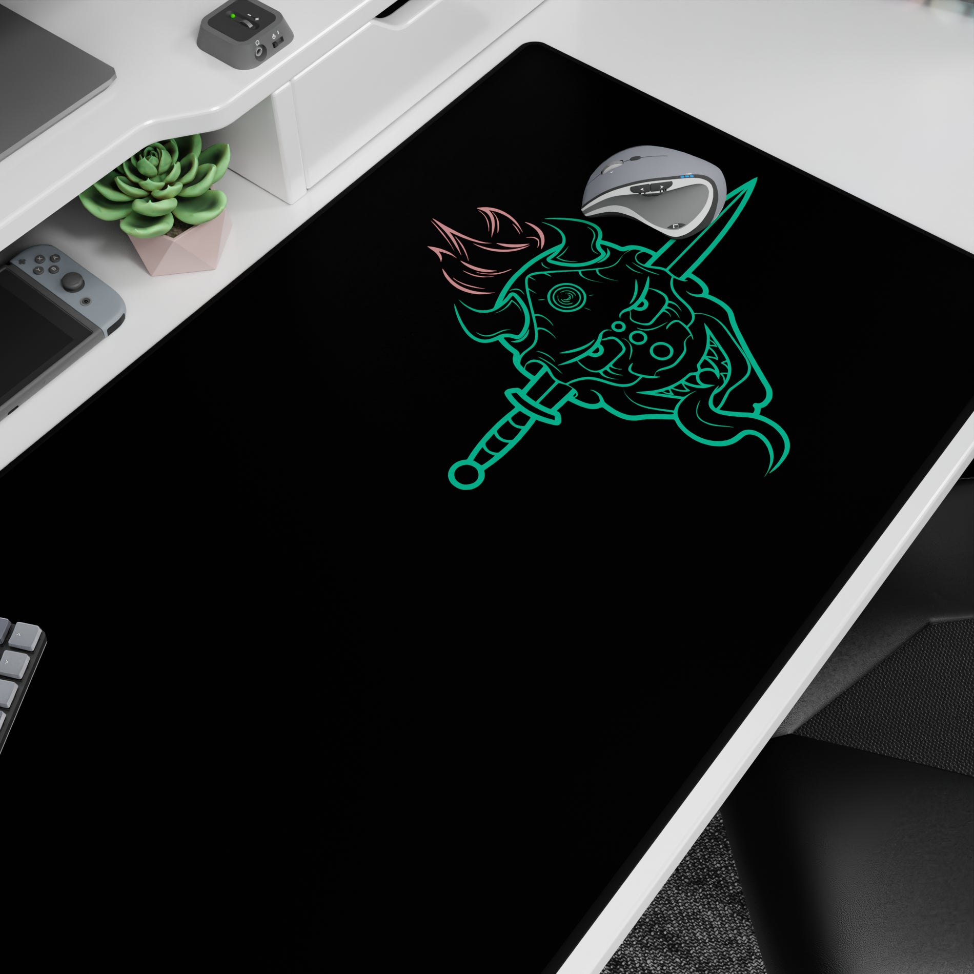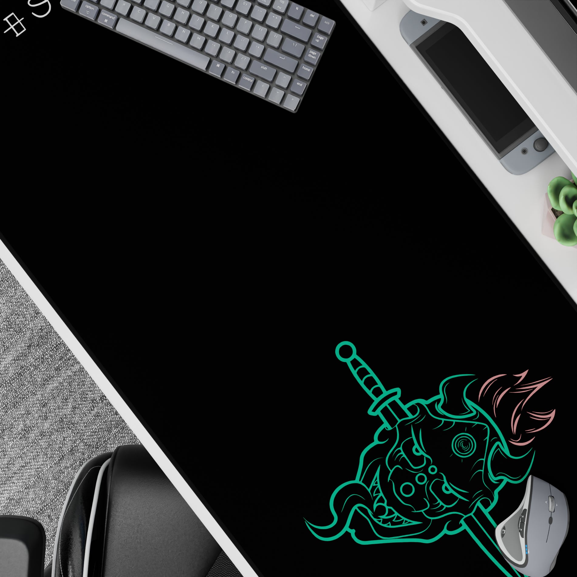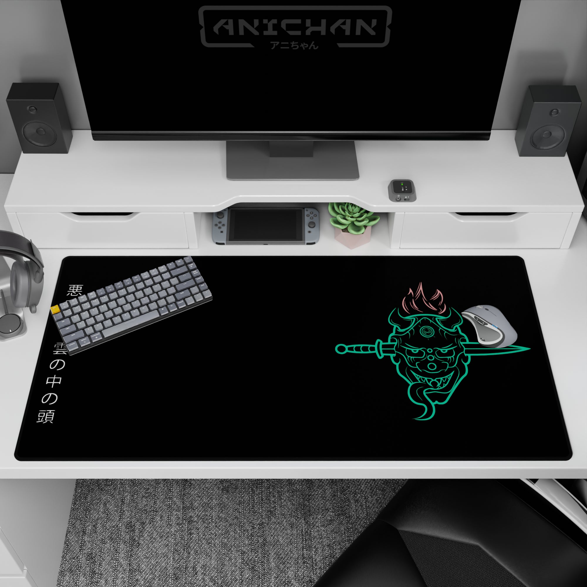 Bold designs meet neon intensity: our anime mouse pad features a glowing oni mask with twin blades. A stark black background highlights the teal outline, while fiery hair adds a touch of menace. Japanese kanji enhances the mystery. Perfect for fans of dark folklore and modern style.