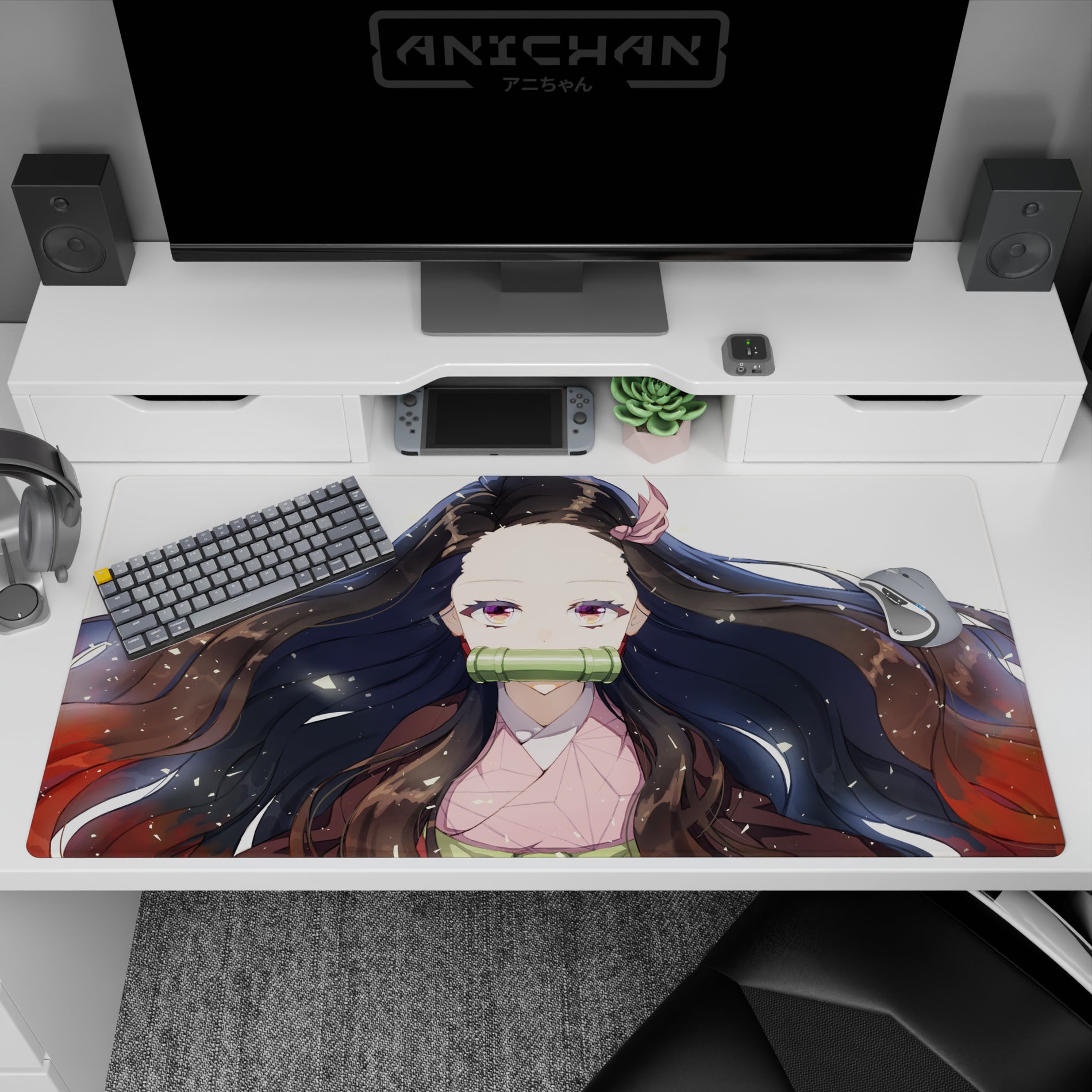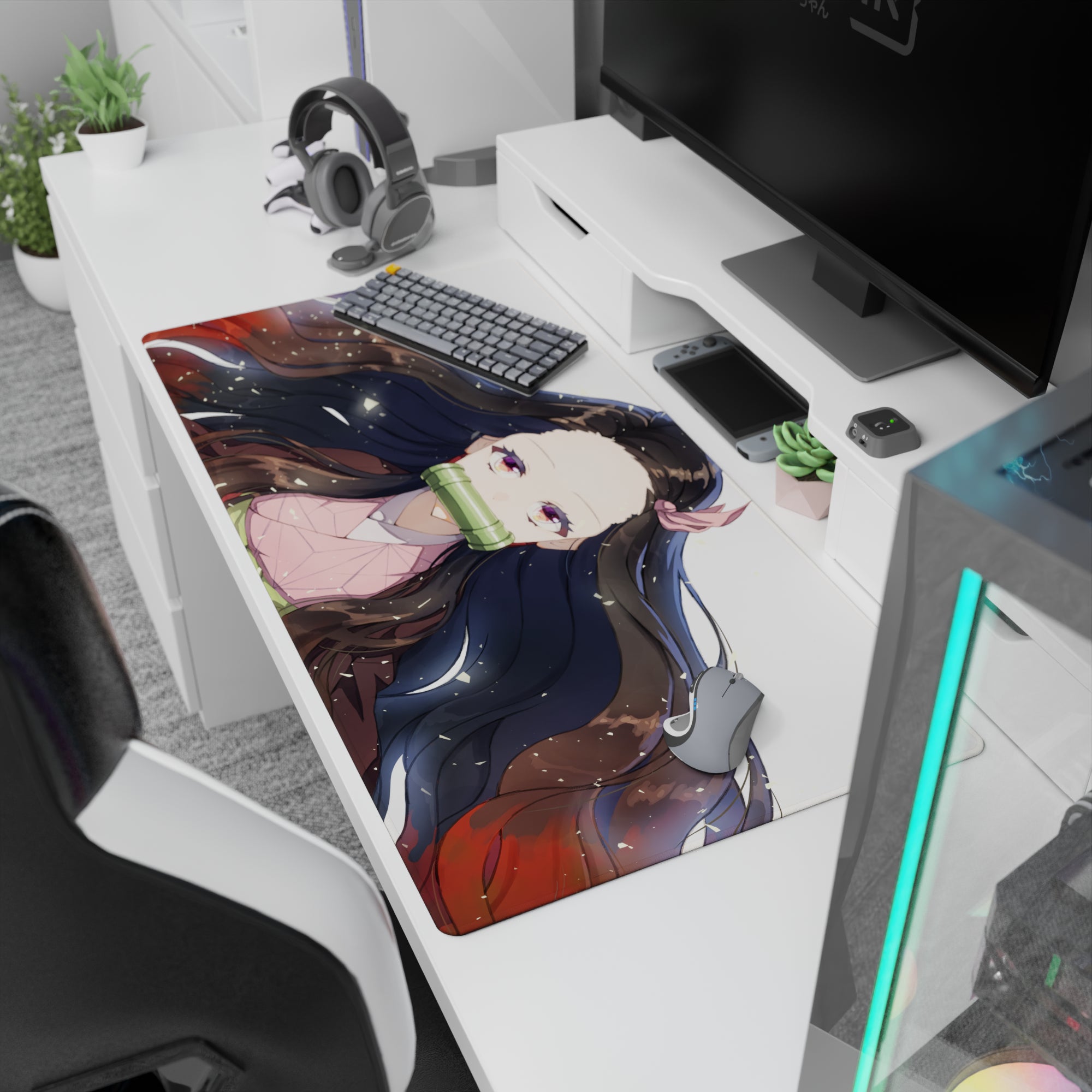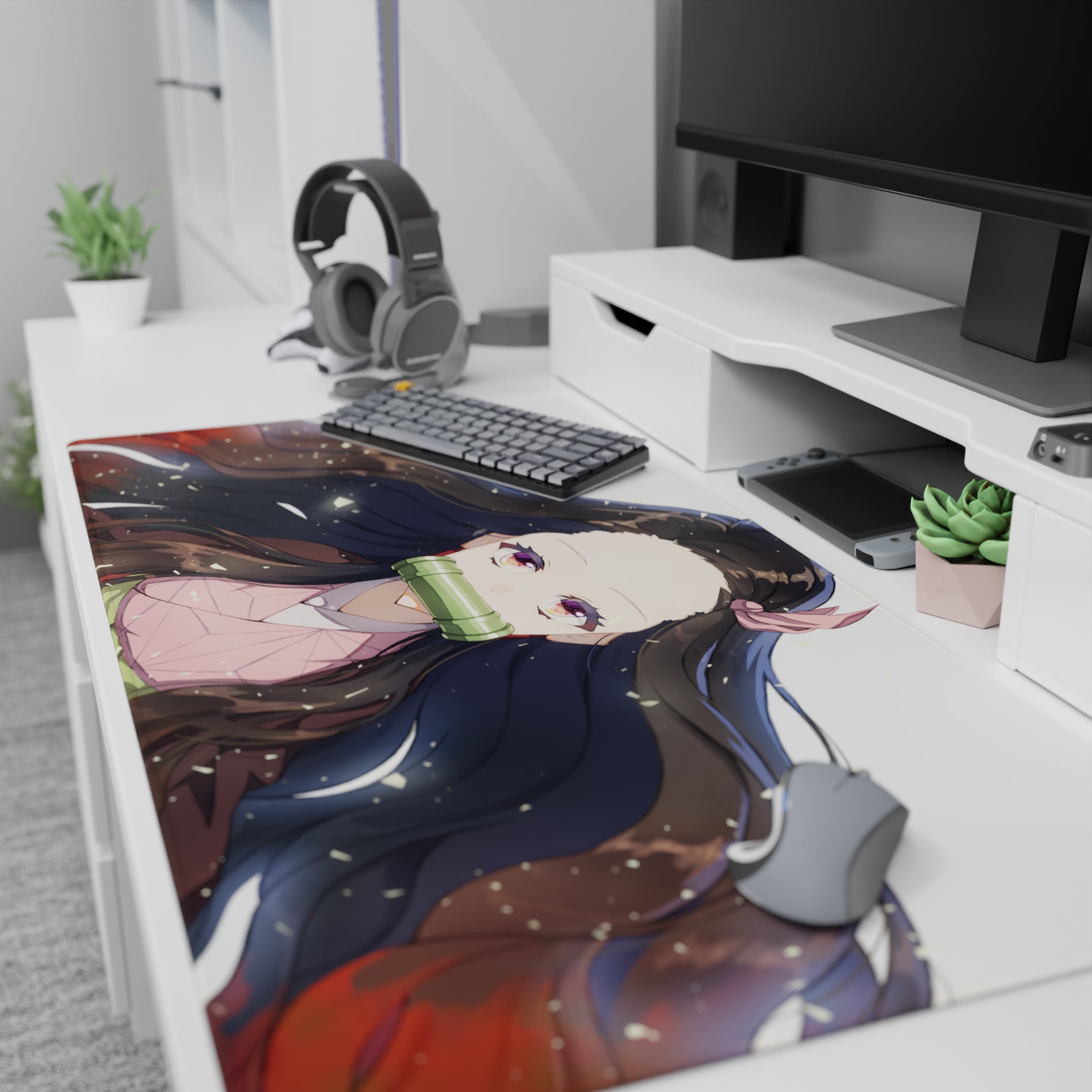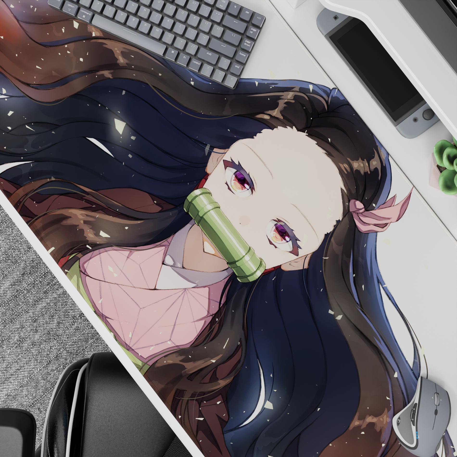 Experience the enchantment of Nezuko with this anime mouse pad. Her black hair flows with red tips, creating an eye-catching design. Gold flecks on a white background add elegance. Perfect for fans seeking a unique, captivating accessory. Ideal for enhancing your workspace with style.