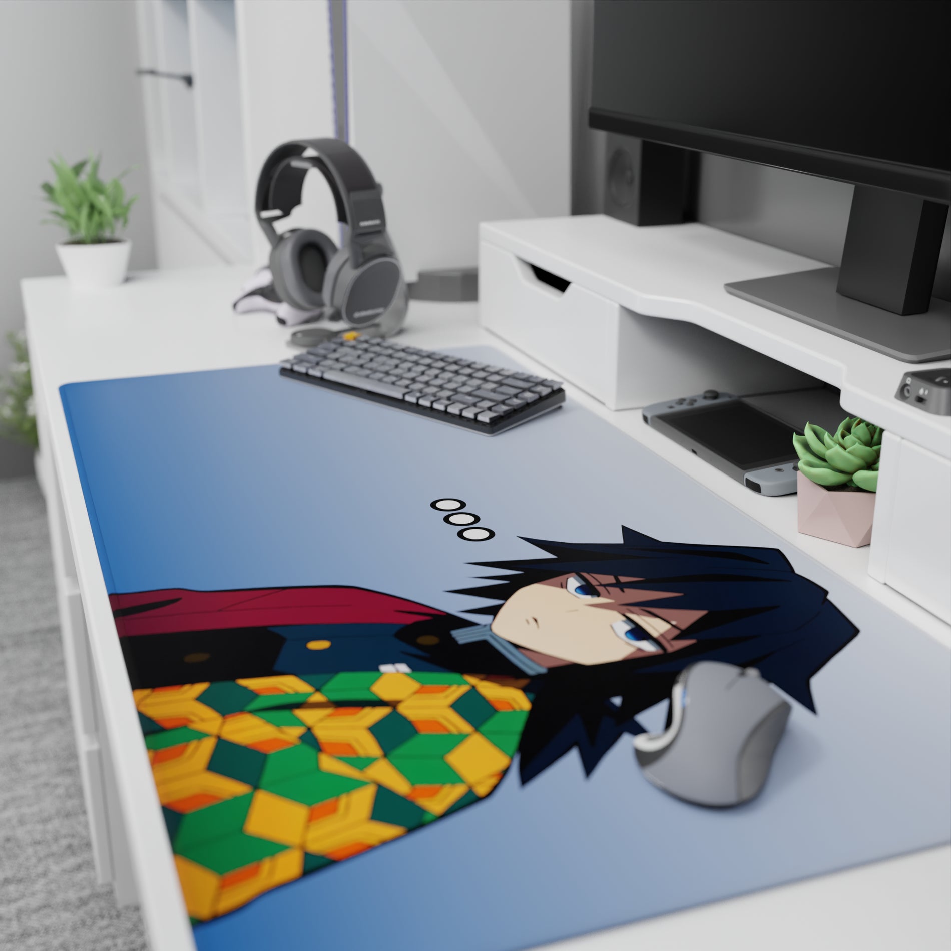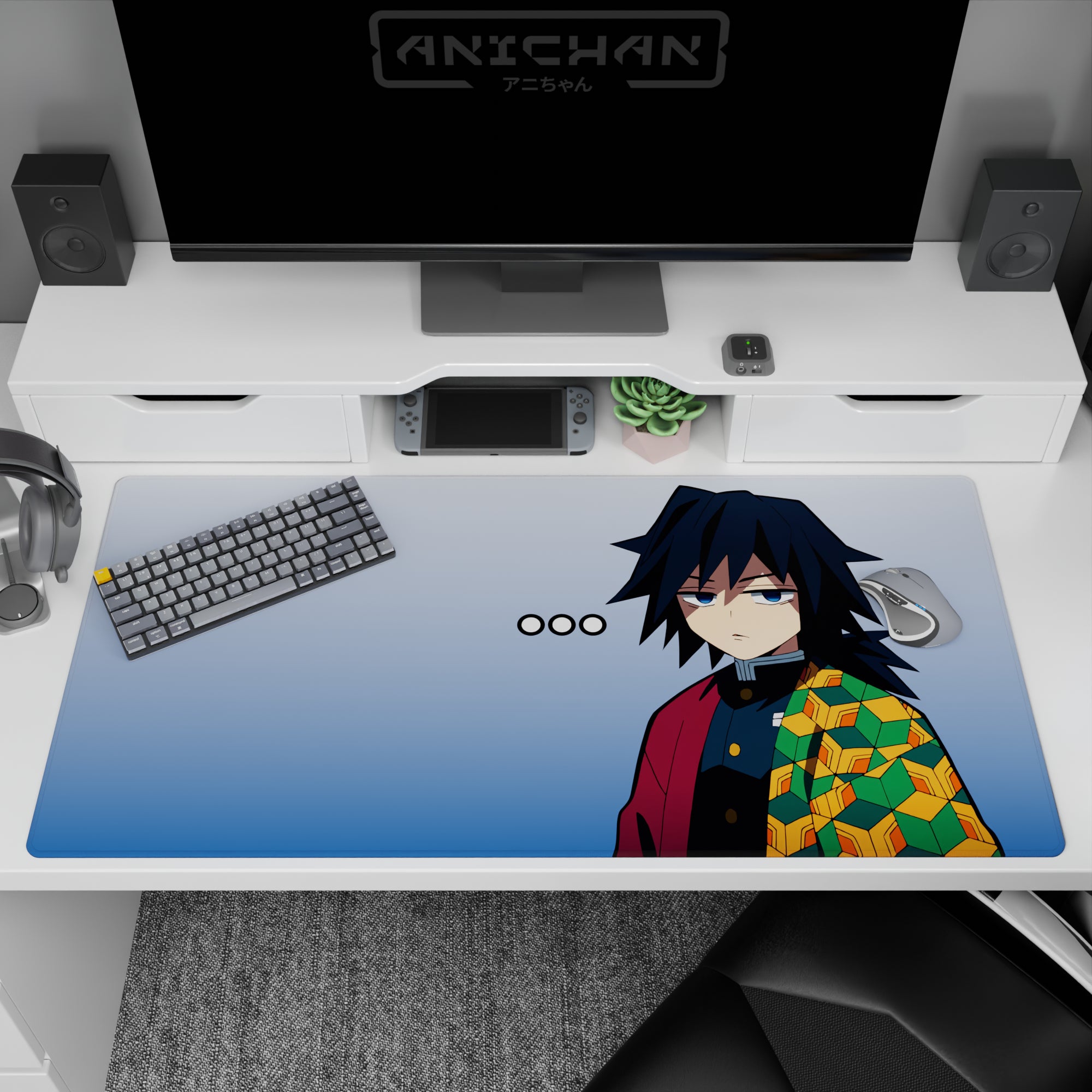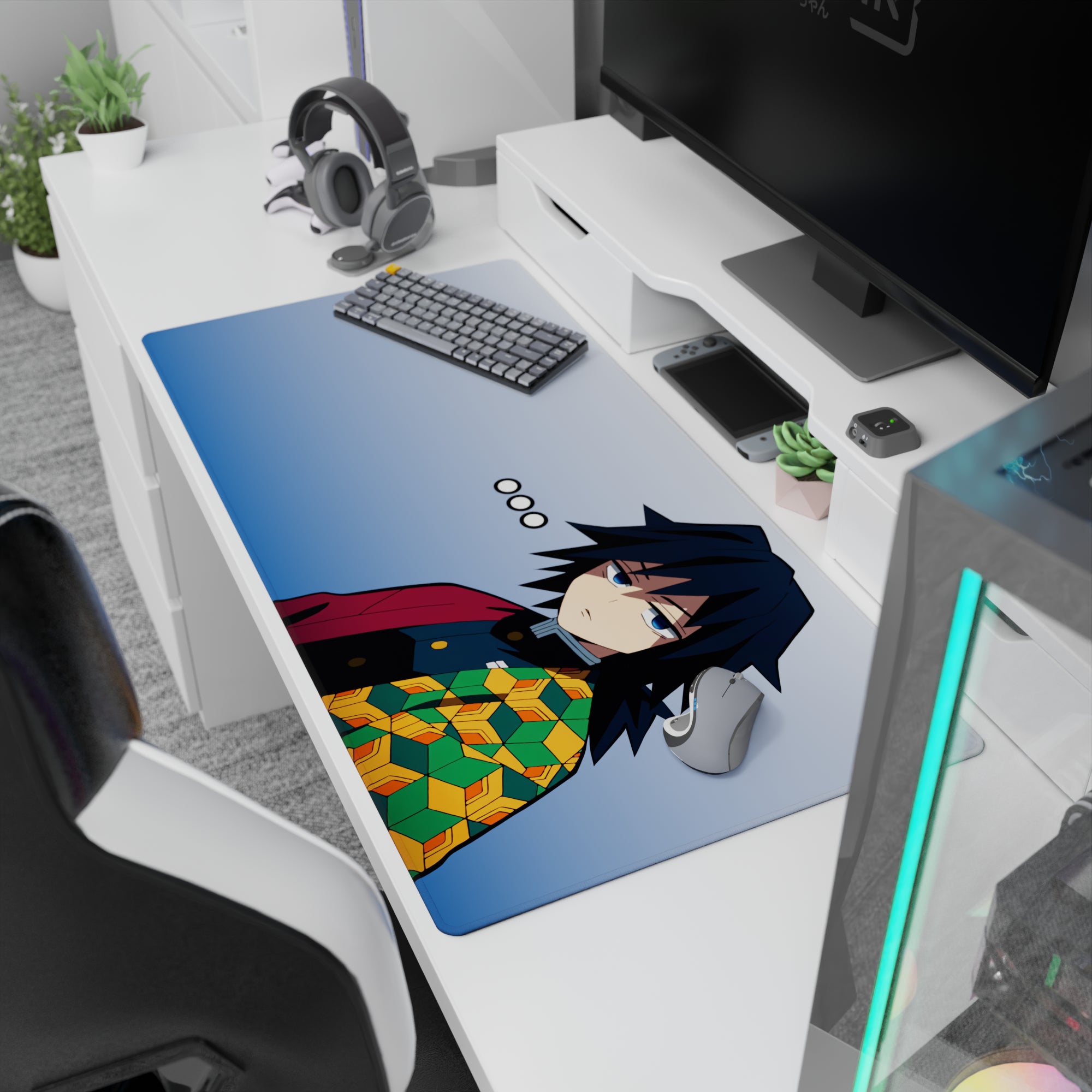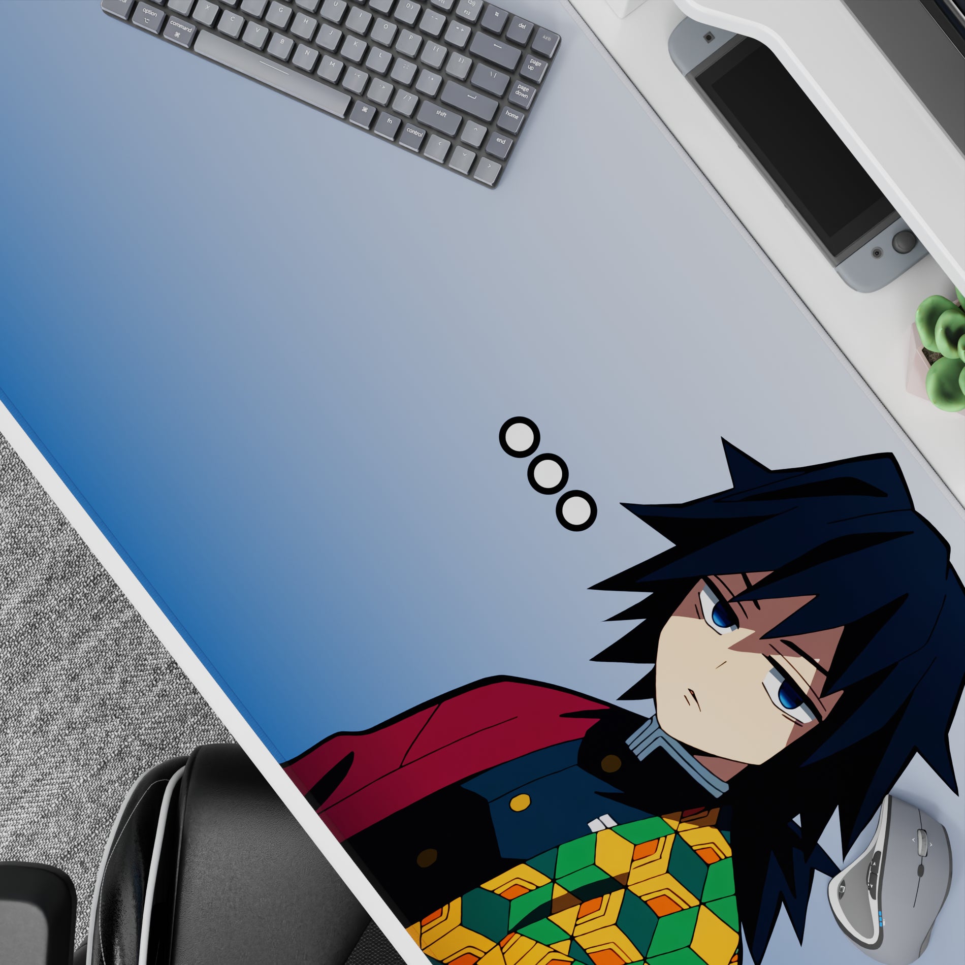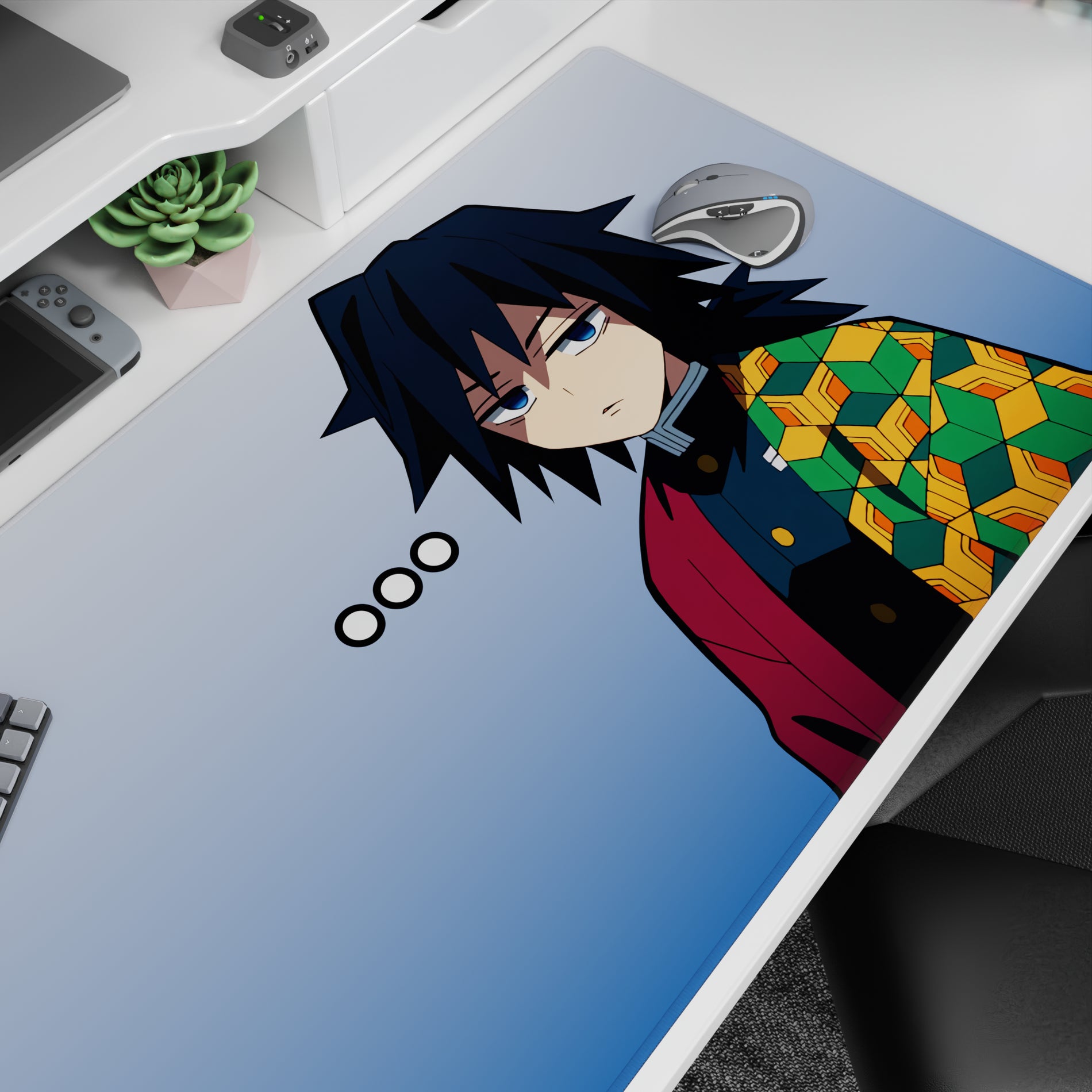 Anime mouse pad featuring Giyu Tomioka's essence adds a touch of mystery to your desk. The design is minimalist yet impactful, with a striking haori pattern against a gentle blue background. This desk pad embodies a calm, cool vibe, perfect for those who appreciate subtlety in style.