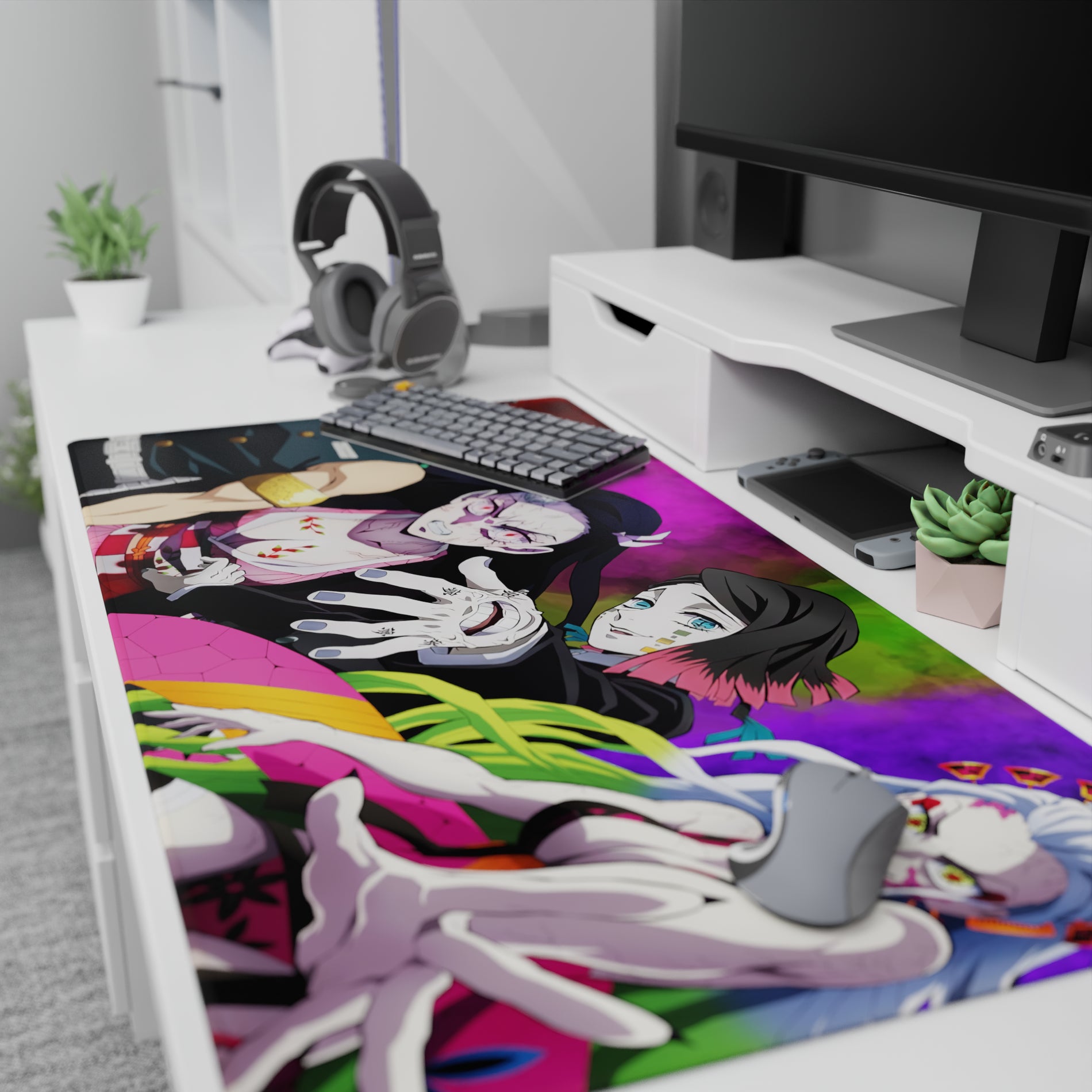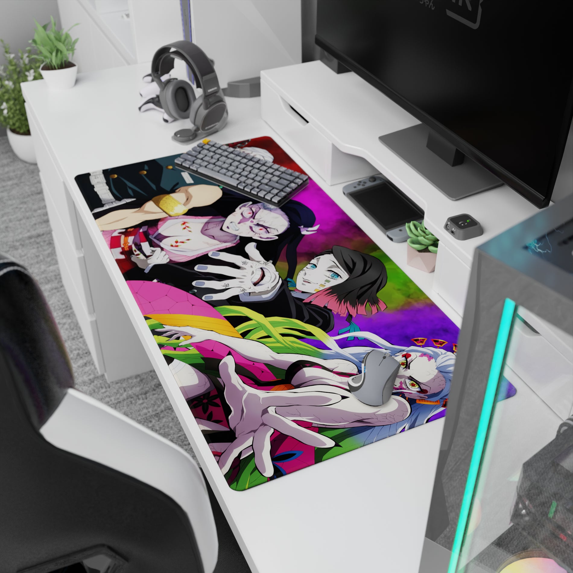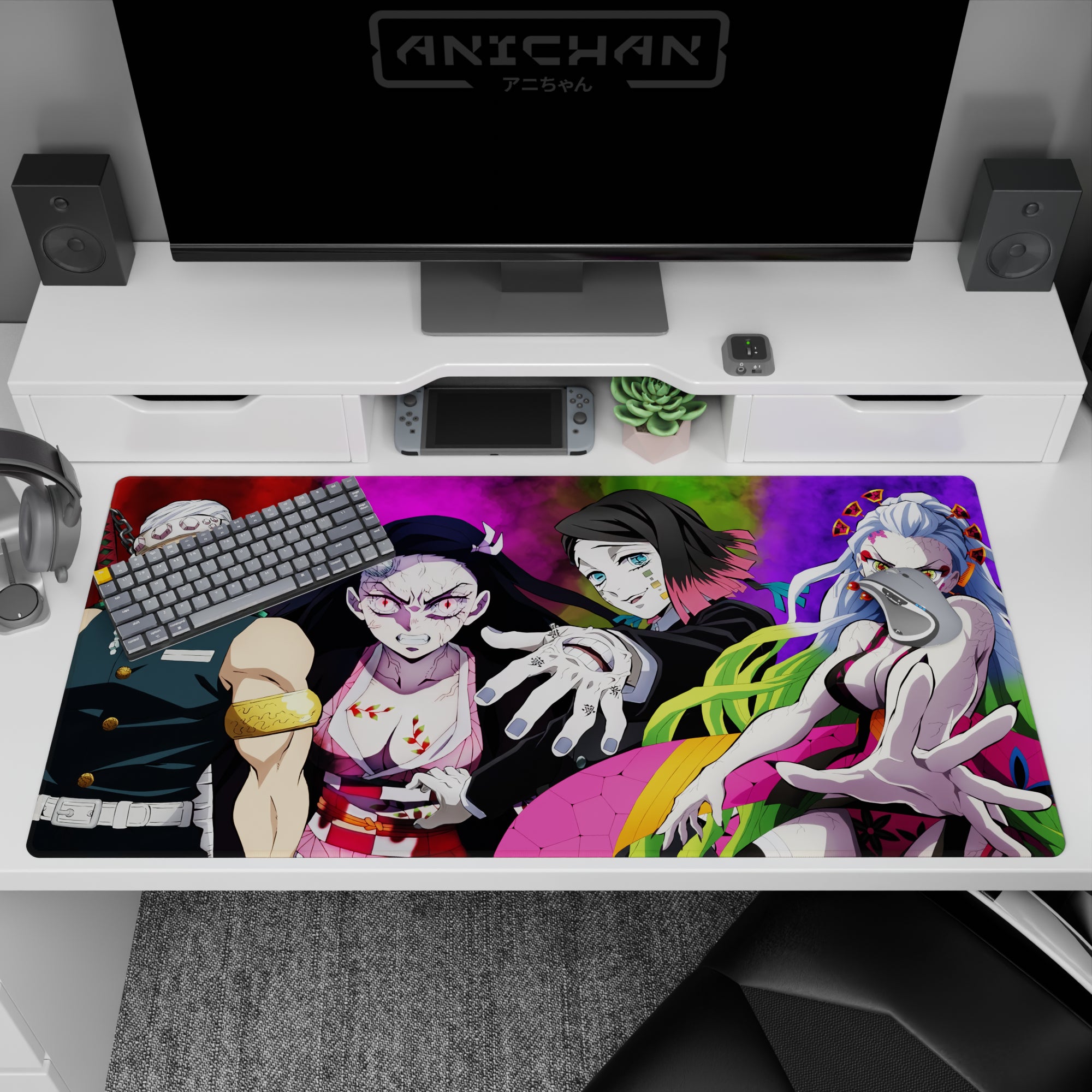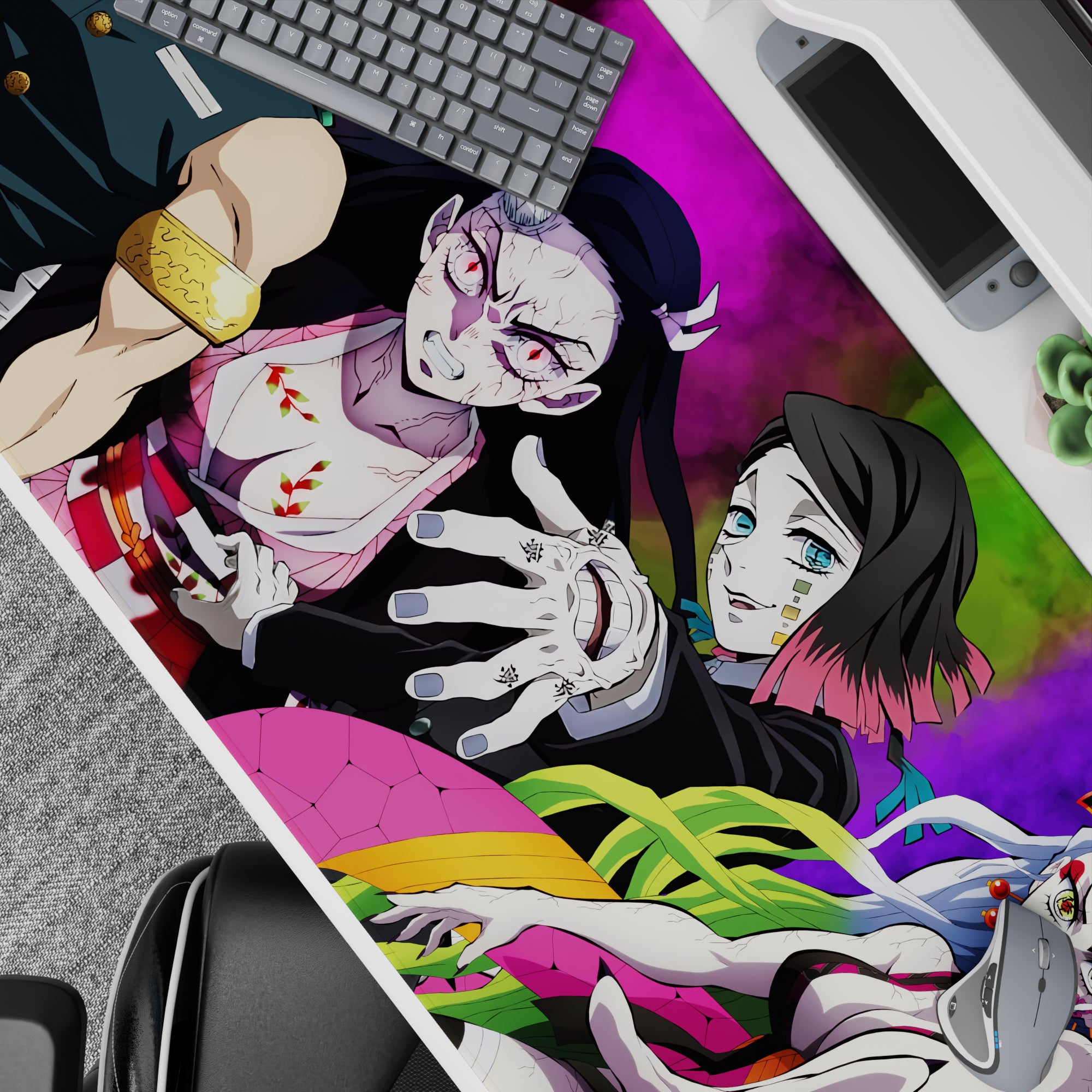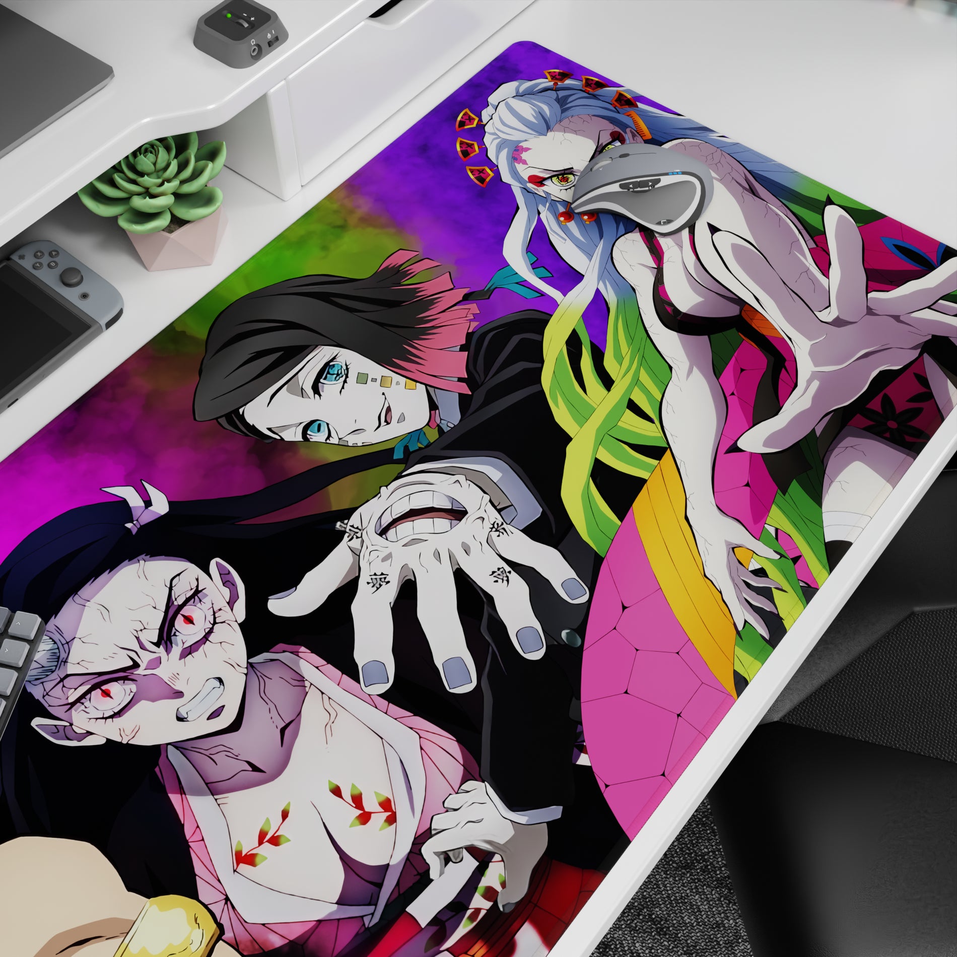 Dive into vibrant chaos with our anime mouse pad featuring Tengen Uzui, Nezuko, Gyutaro, and Daki. Explosive colors and dynamic design bring Demon Slayer action to your desk. Ideal for fans seeking bold style, eye-catching energy, and an epic setting for their workspace.