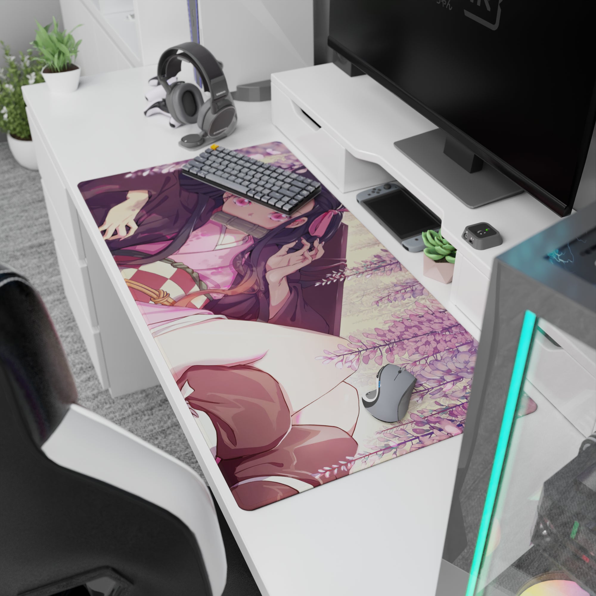 Nezuko lounges amid wisteria on this anime mouse pad, creating a soft, surreal scene. Blush-pink blooms reflect her gaze and kimono's folds. Golden light filters delicately. Cozy and whimsical, this Demon Slayer desk pad captures spring's magic in a single breath, tender and enchanting.