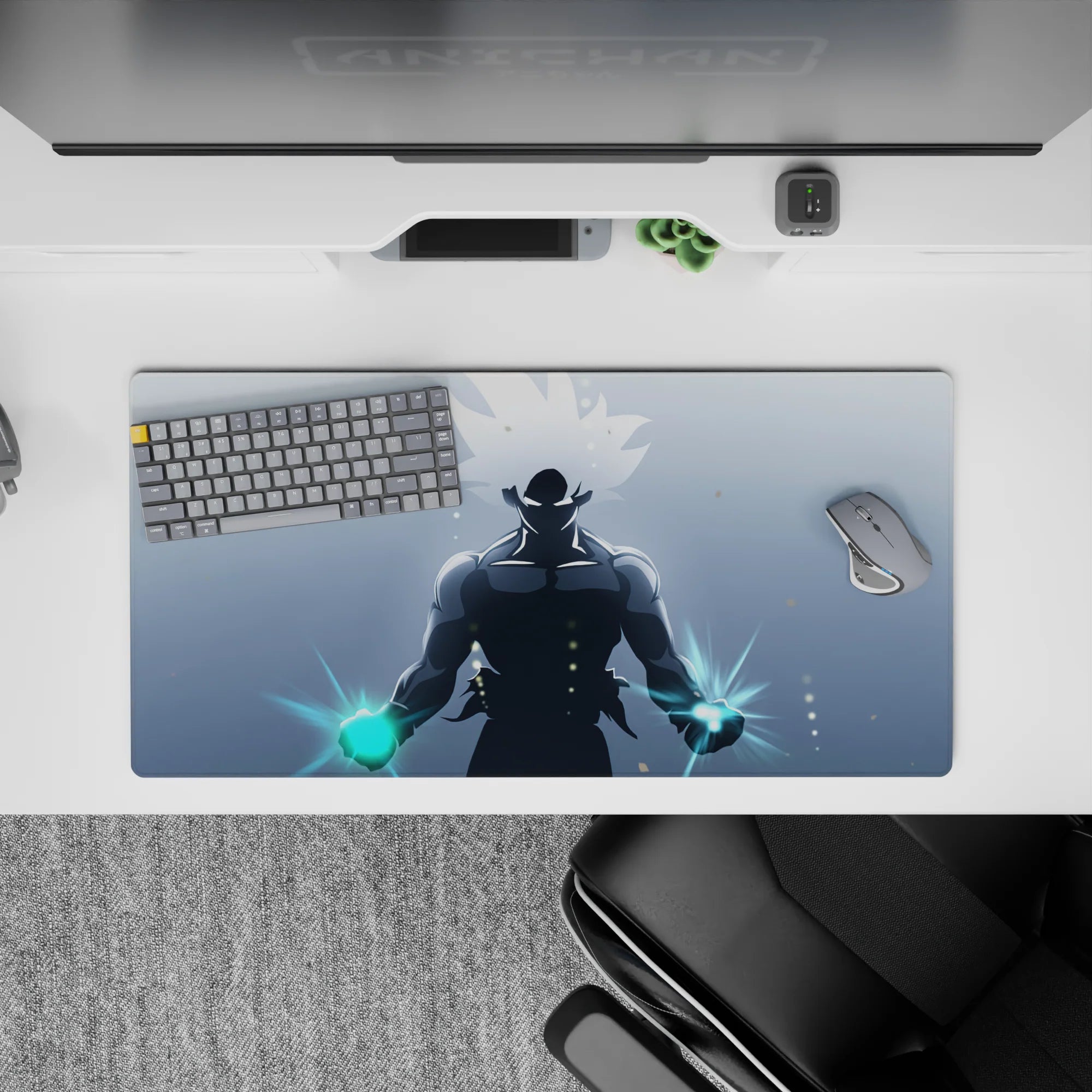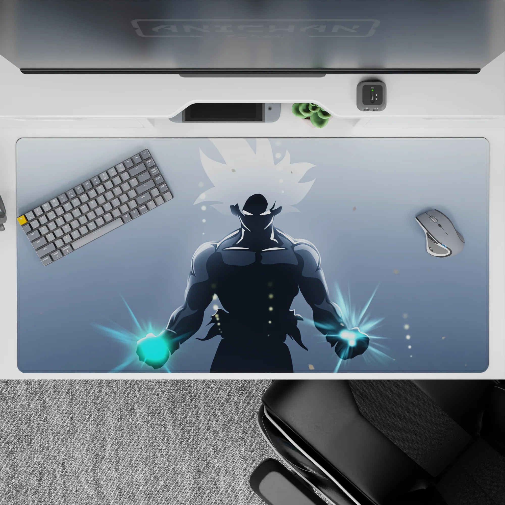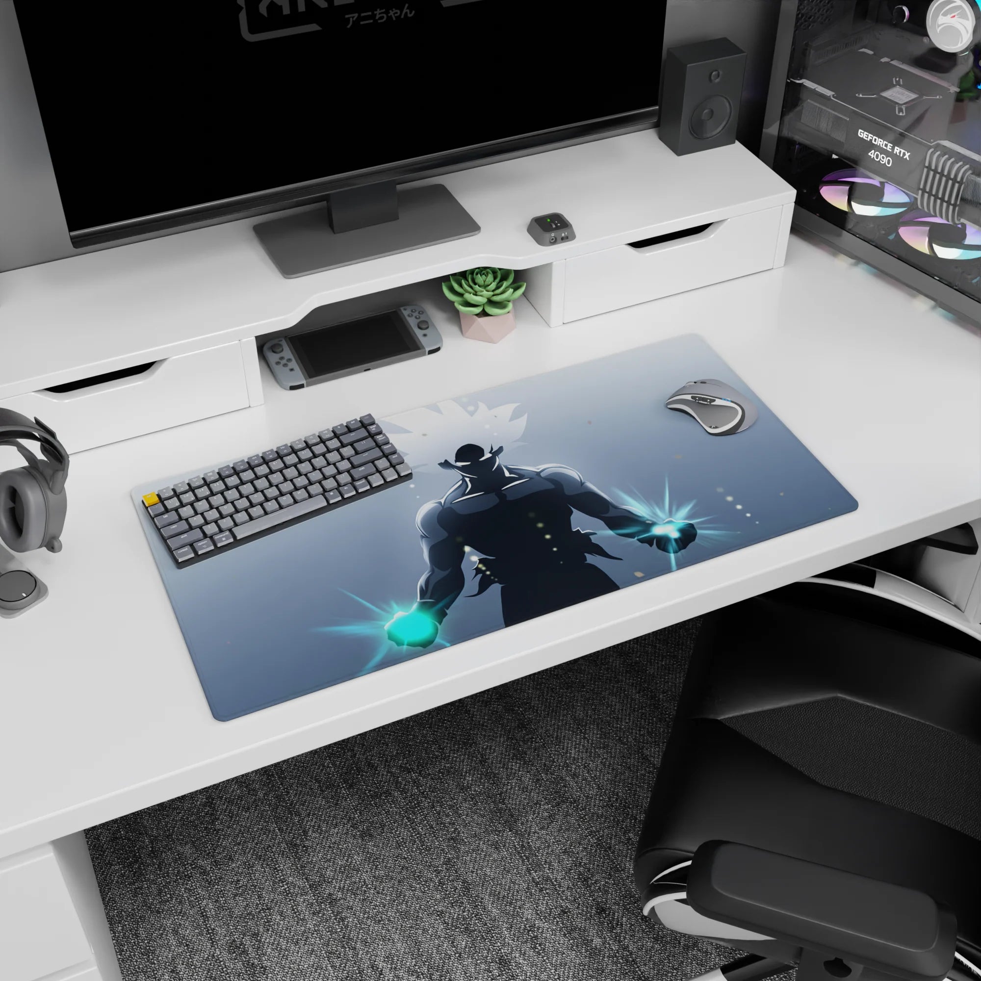 Feel the unmatched power of Ultra Instinct Goku with this glowing desk mat. The design captures Goku’s silhouette as he radiates energy, hands glowing with vibrant blue light. A perfect addition to any Dragon Ball fan’s workspace.