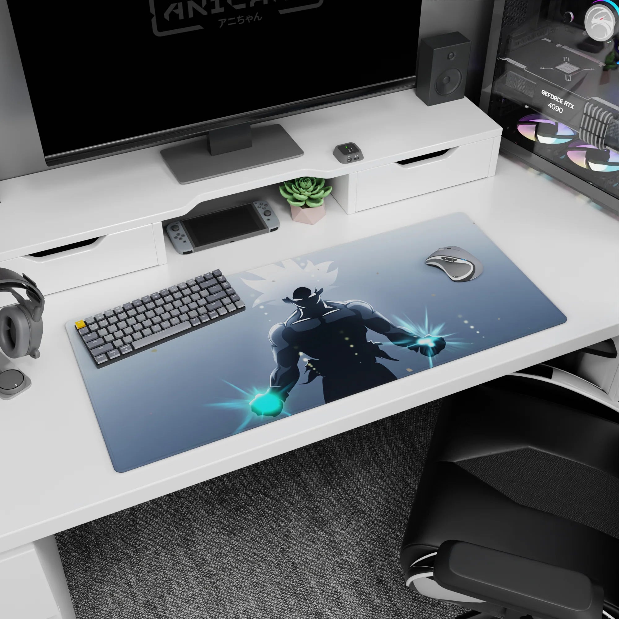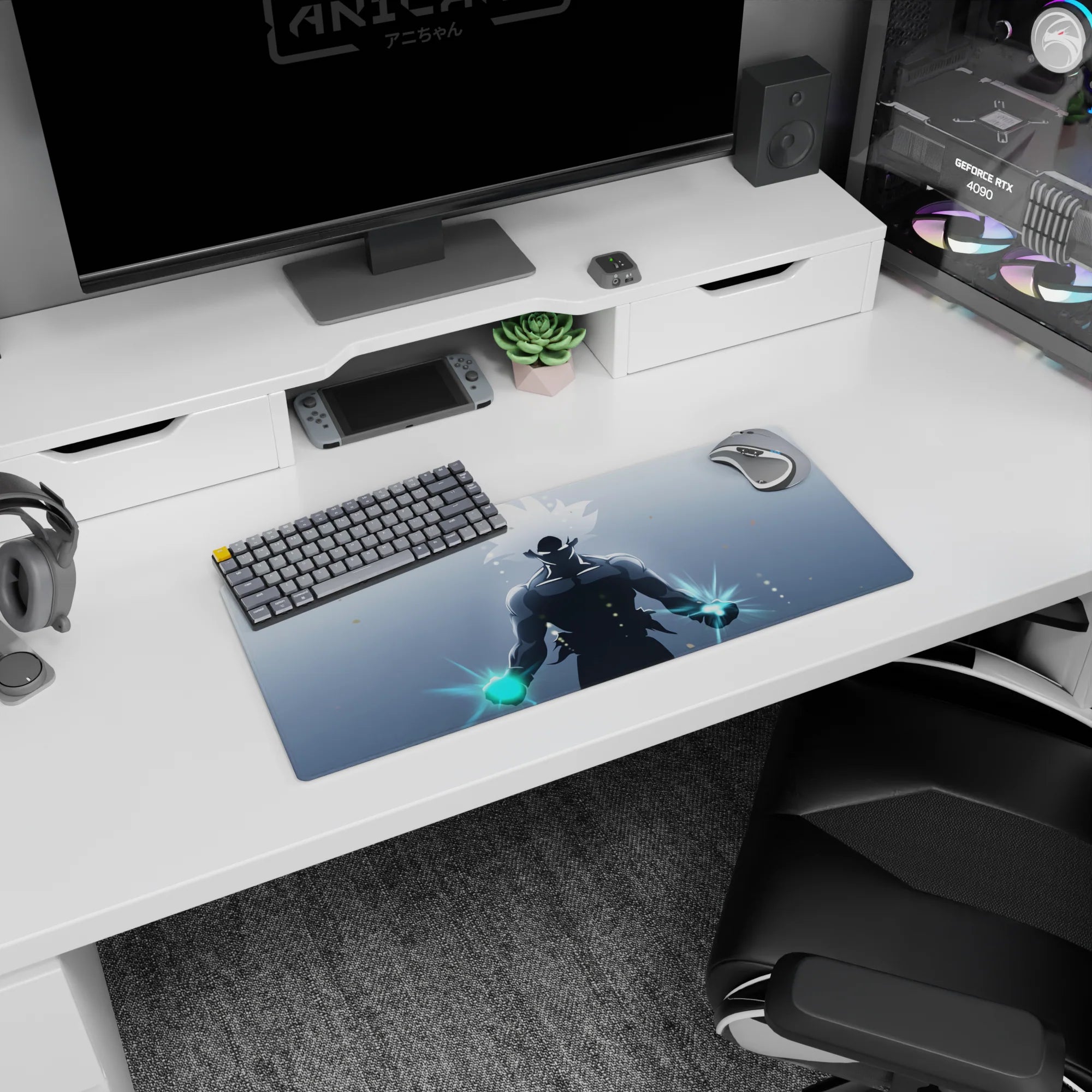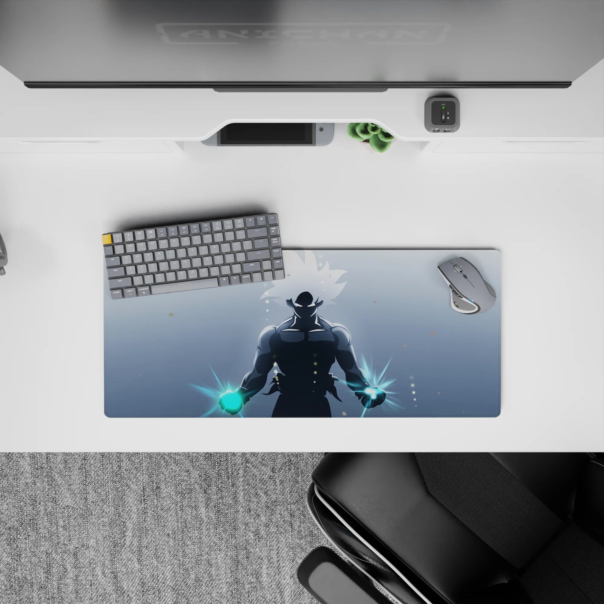 Feel the unmatched power of Ultra Instinct Goku with this glowing desk mat. The design captures Goku’s silhouette as he radiates energy, hands glowing with vibrant blue light. A perfect addition to any Dragon Ball fan’s workspace.