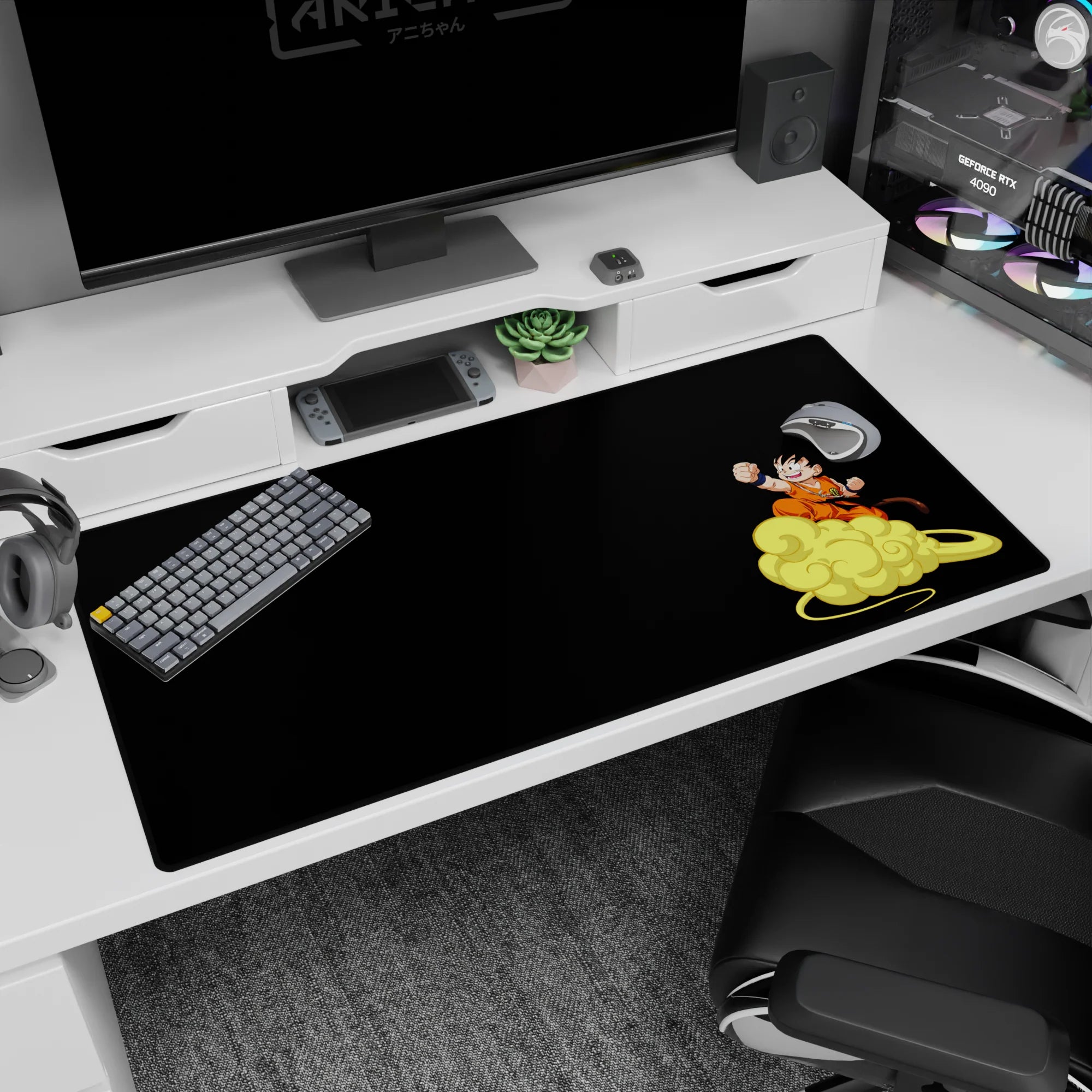 Join Kid Goku on a high-flying adventure with this minimalist design featuring Goku riding the Nimbus Cloud. Perfect for any Dragon Ball fan looking to brighten up their desk with nostalgia and excitement!