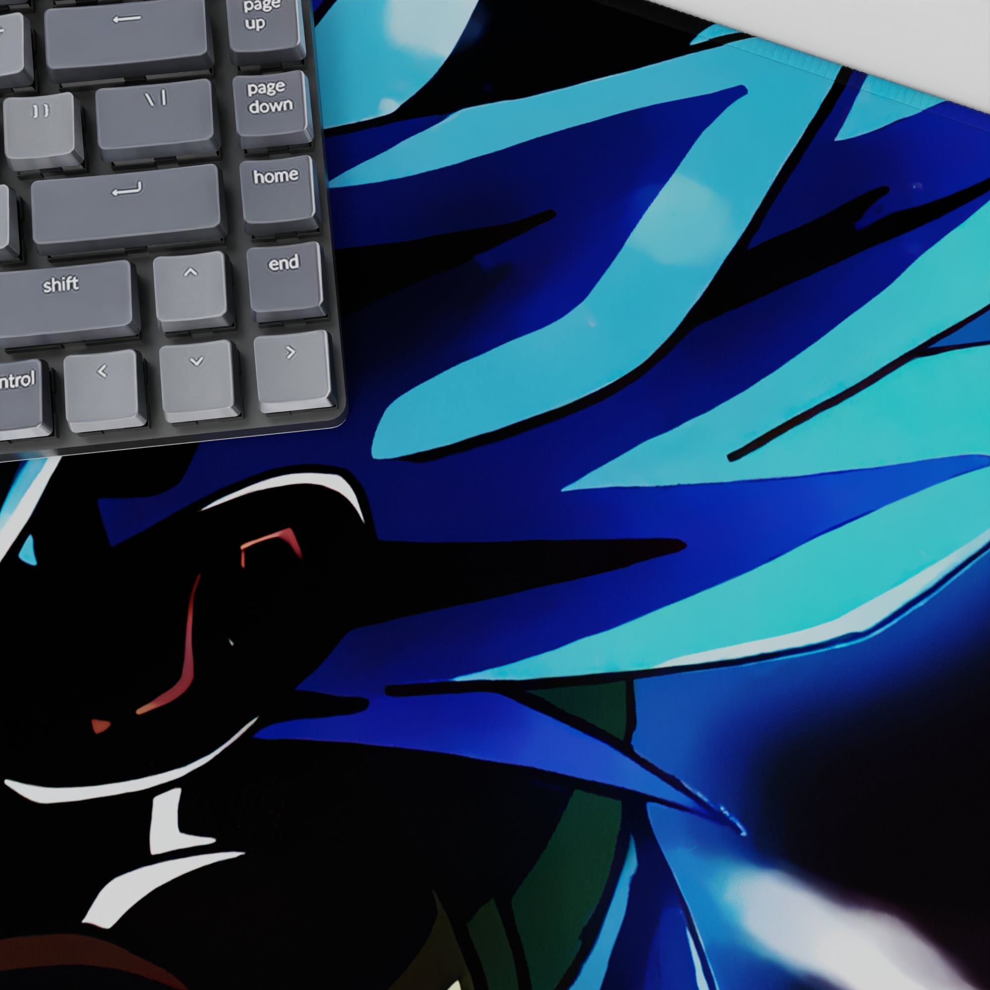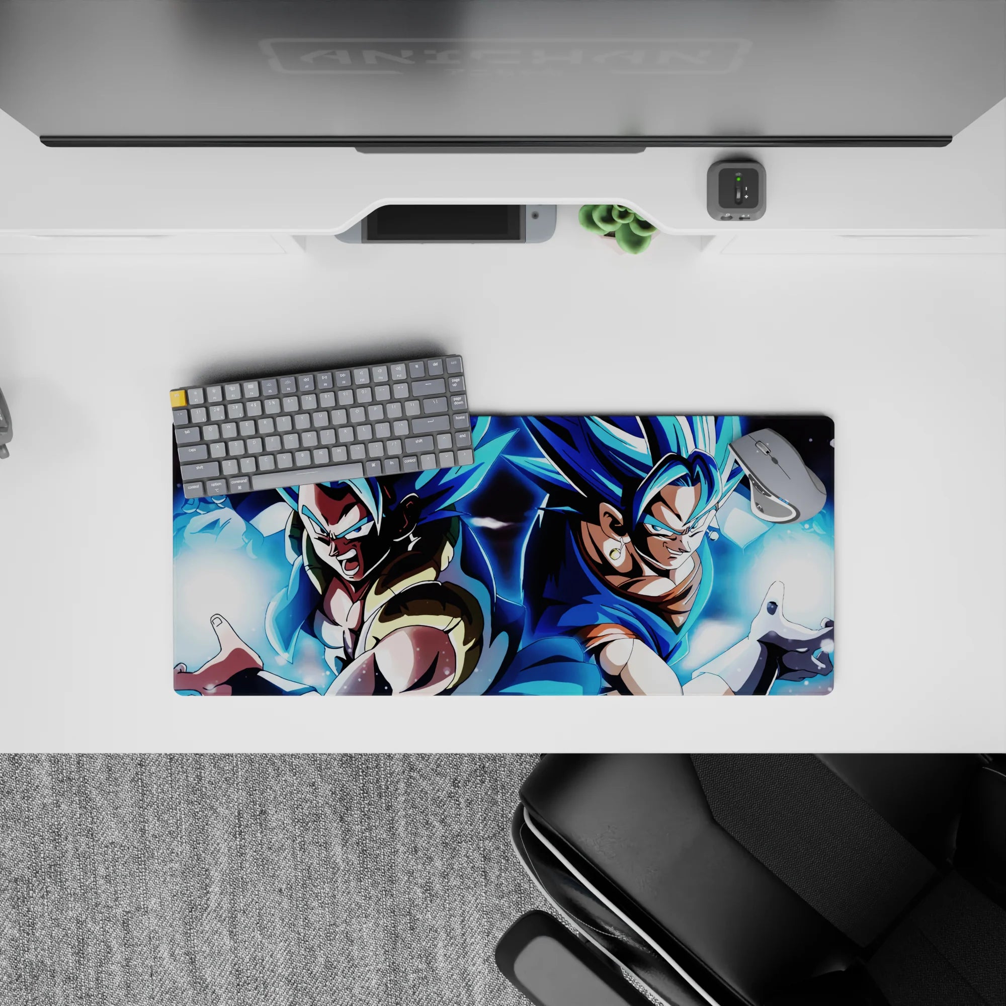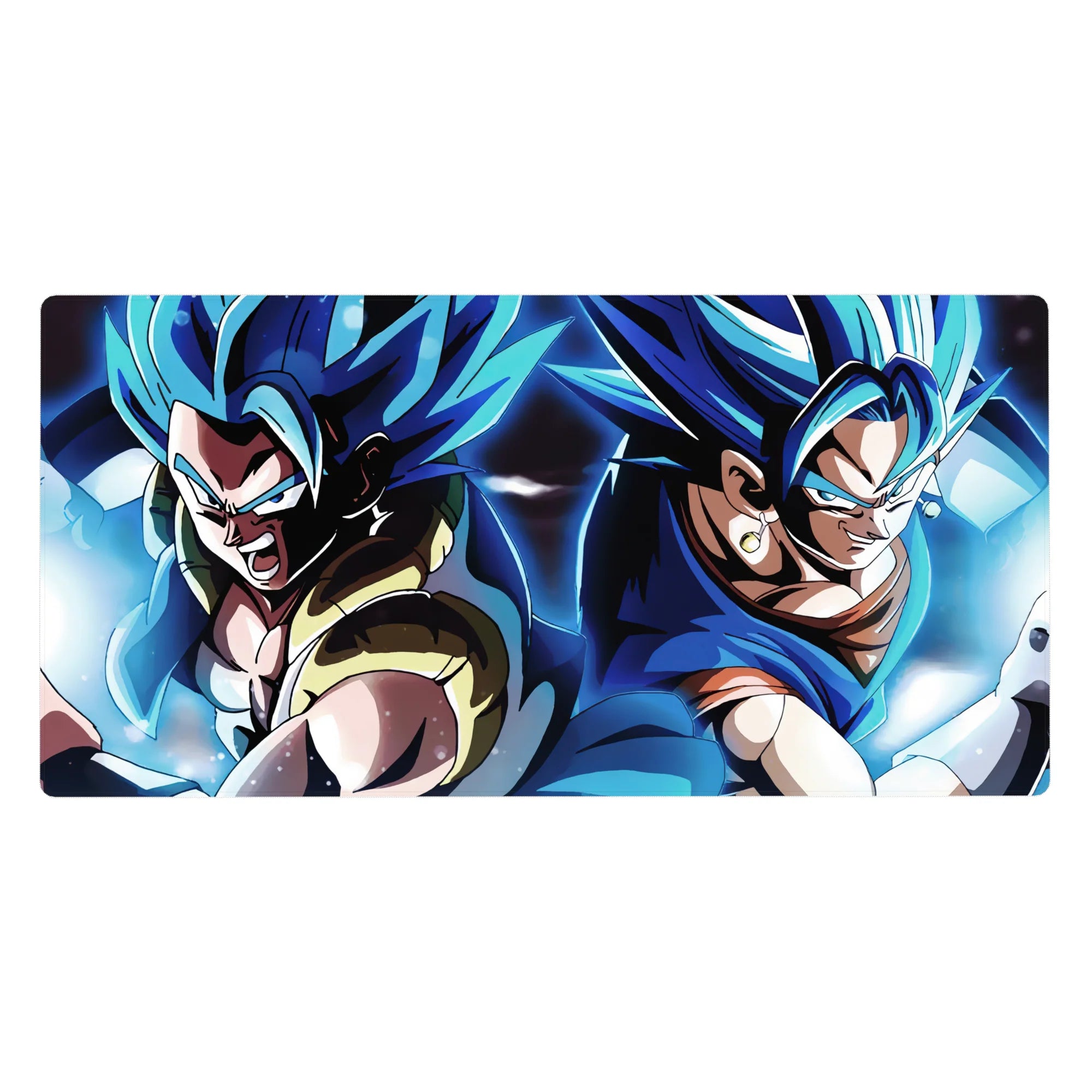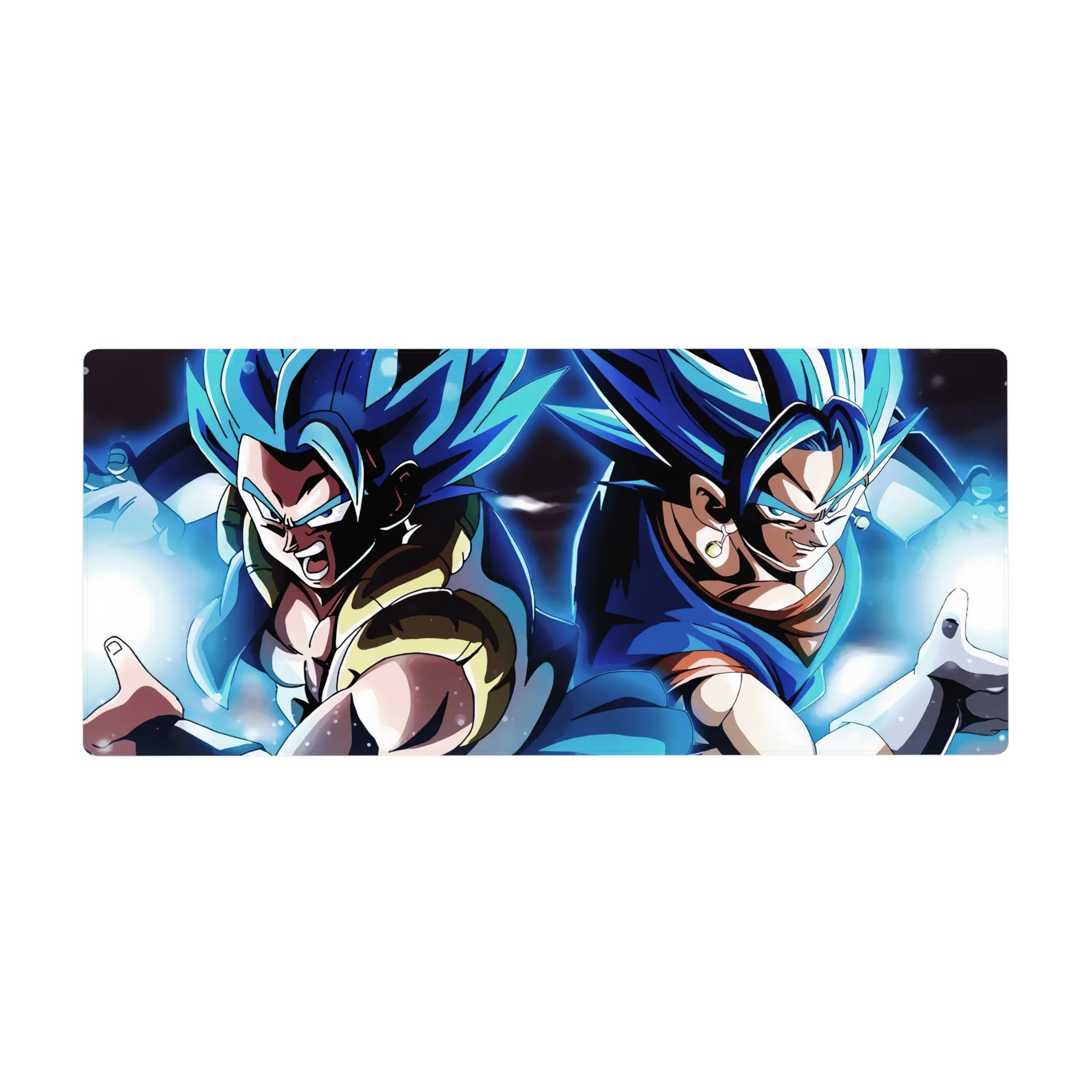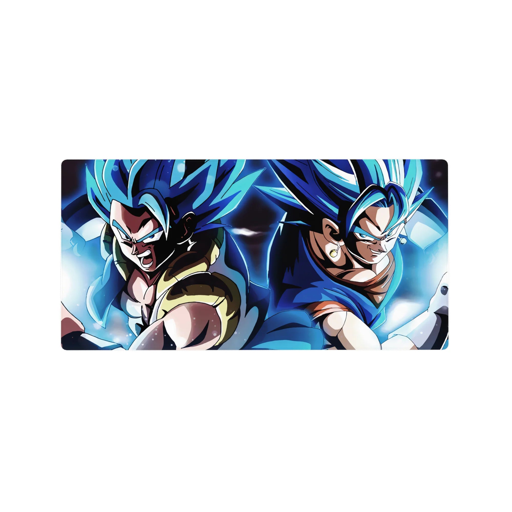 Experience the power of Super Saiyan Blue Gogeta and Vegito with this stunning desk mat. Capturing both fusion warriors as they prepare to unleash their energy, this mat is perfect for any Dragon Ball fan seeking ultimate strength in their workspace.