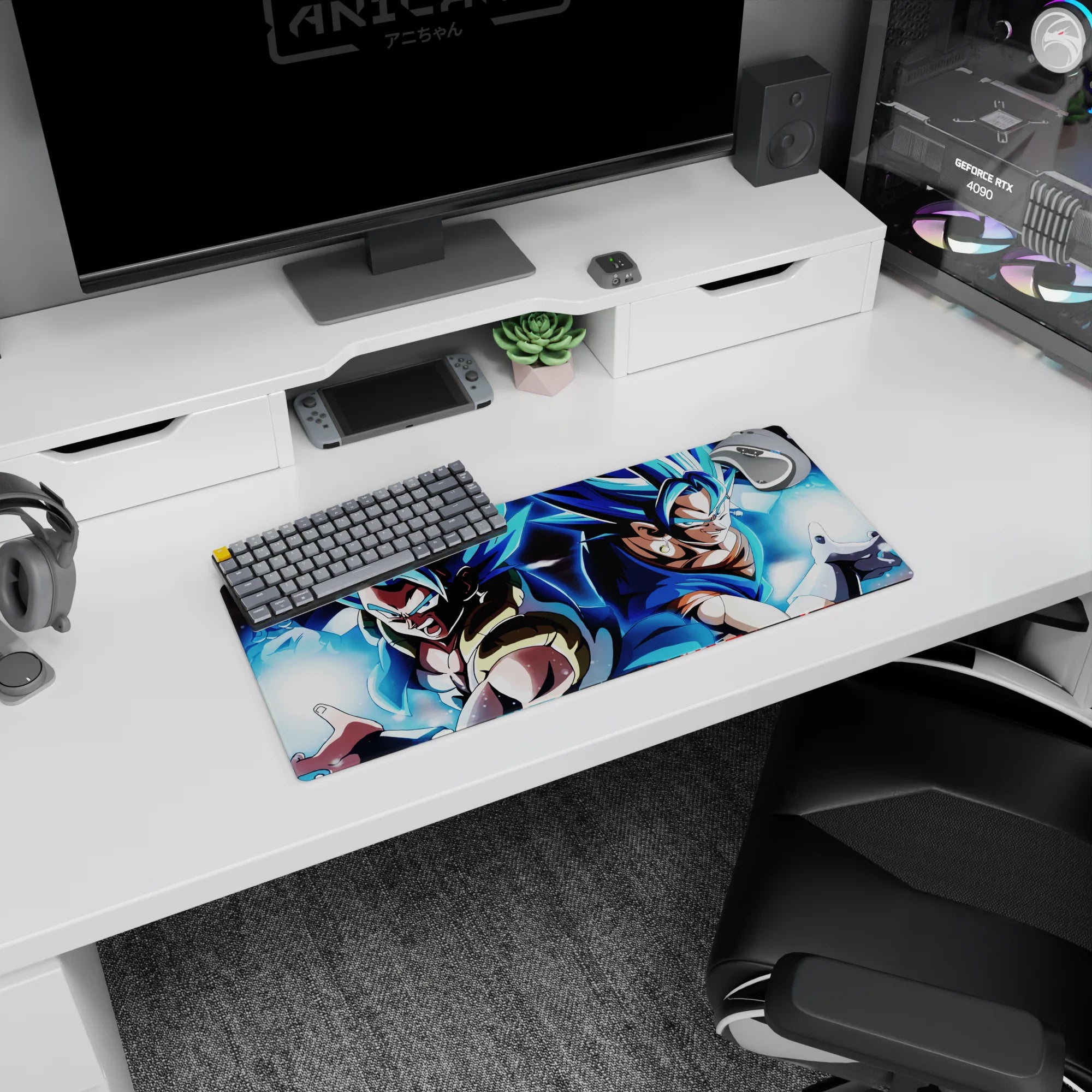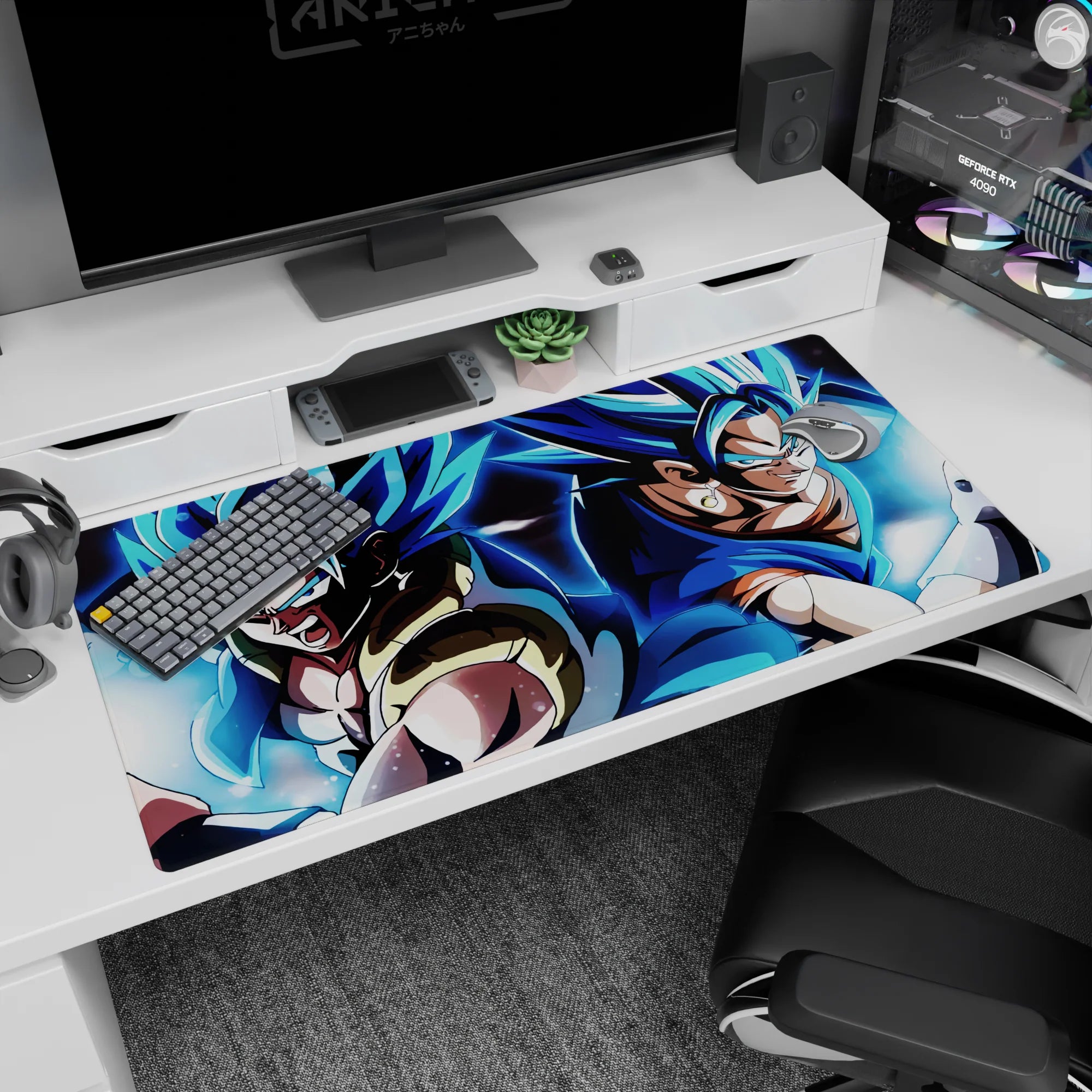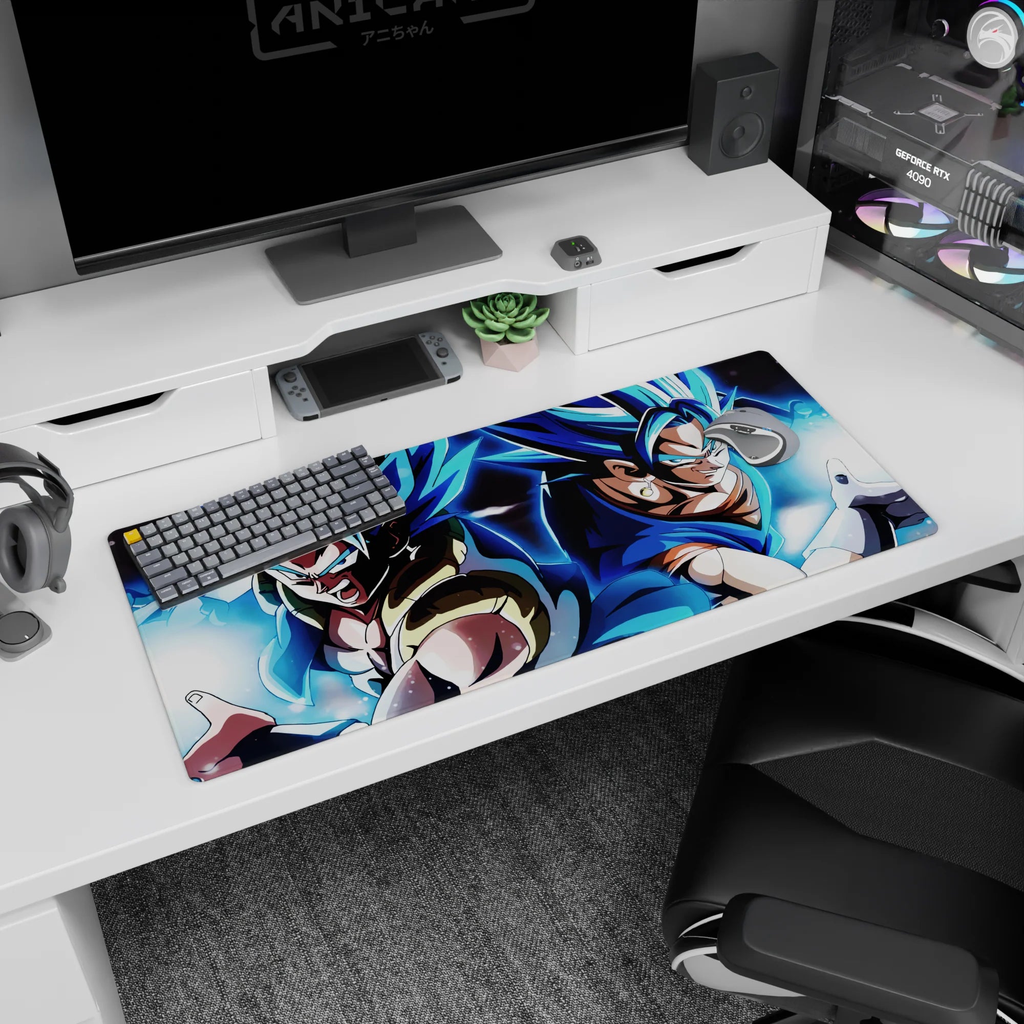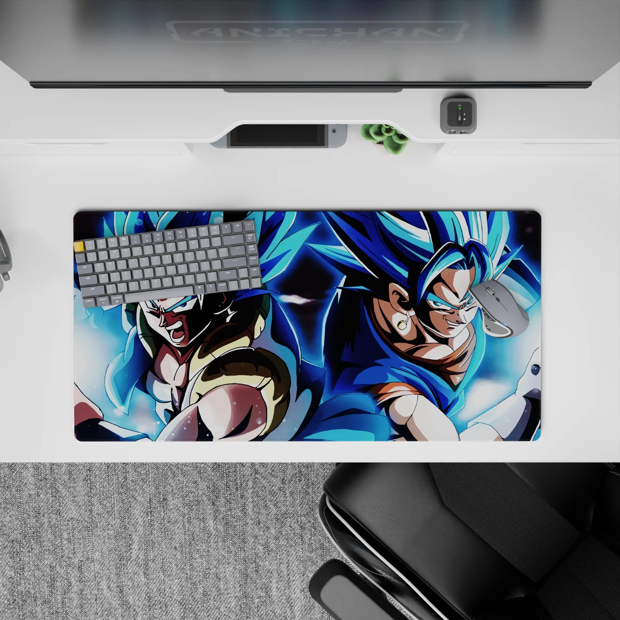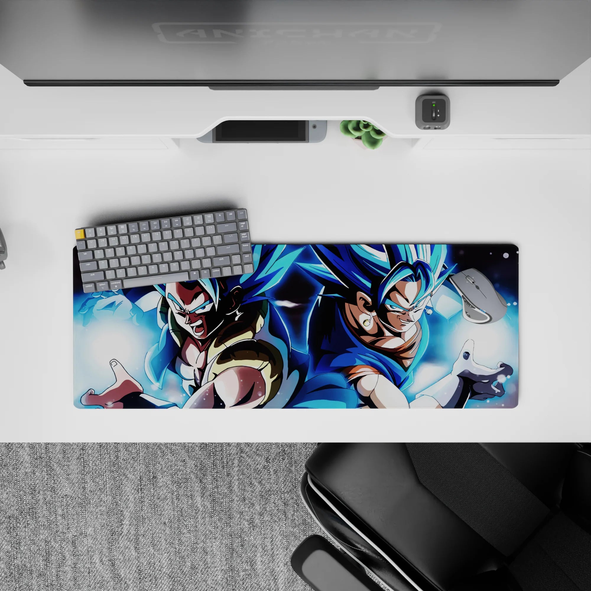 Experience the power of Super Saiyan Blue Gogeta and Vegito with this stunning desk mat. Capturing both fusion warriors as they prepare to unleash their energy, this mat is perfect for any Dragon Ball fan seeking ultimate strength in their workspace.