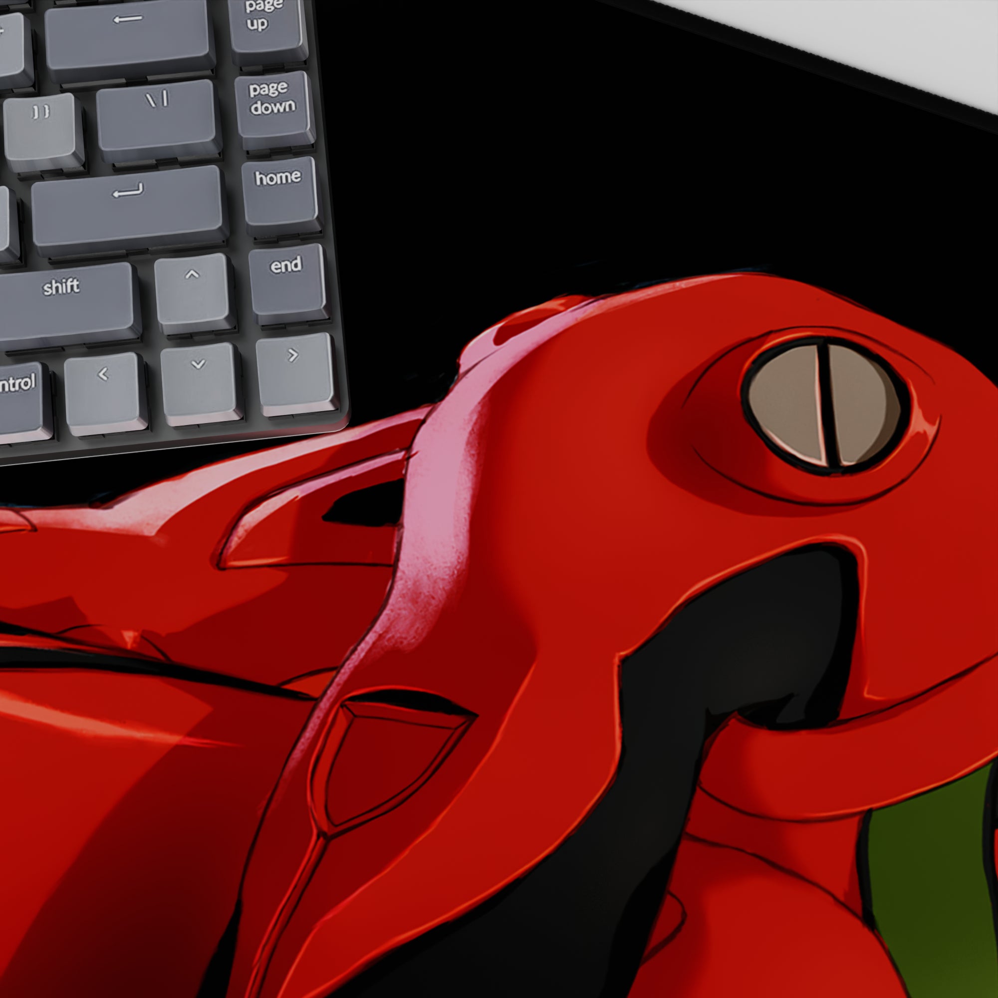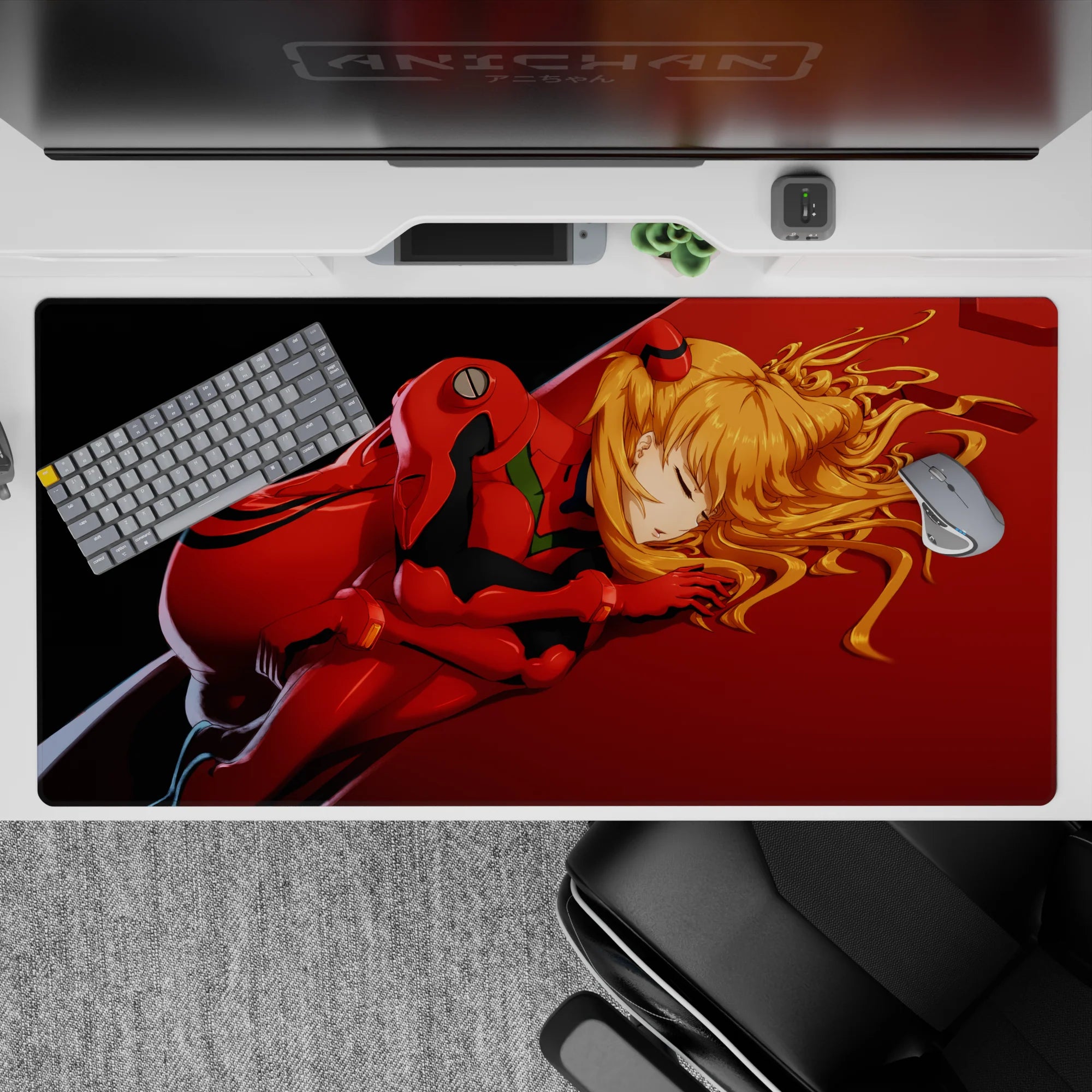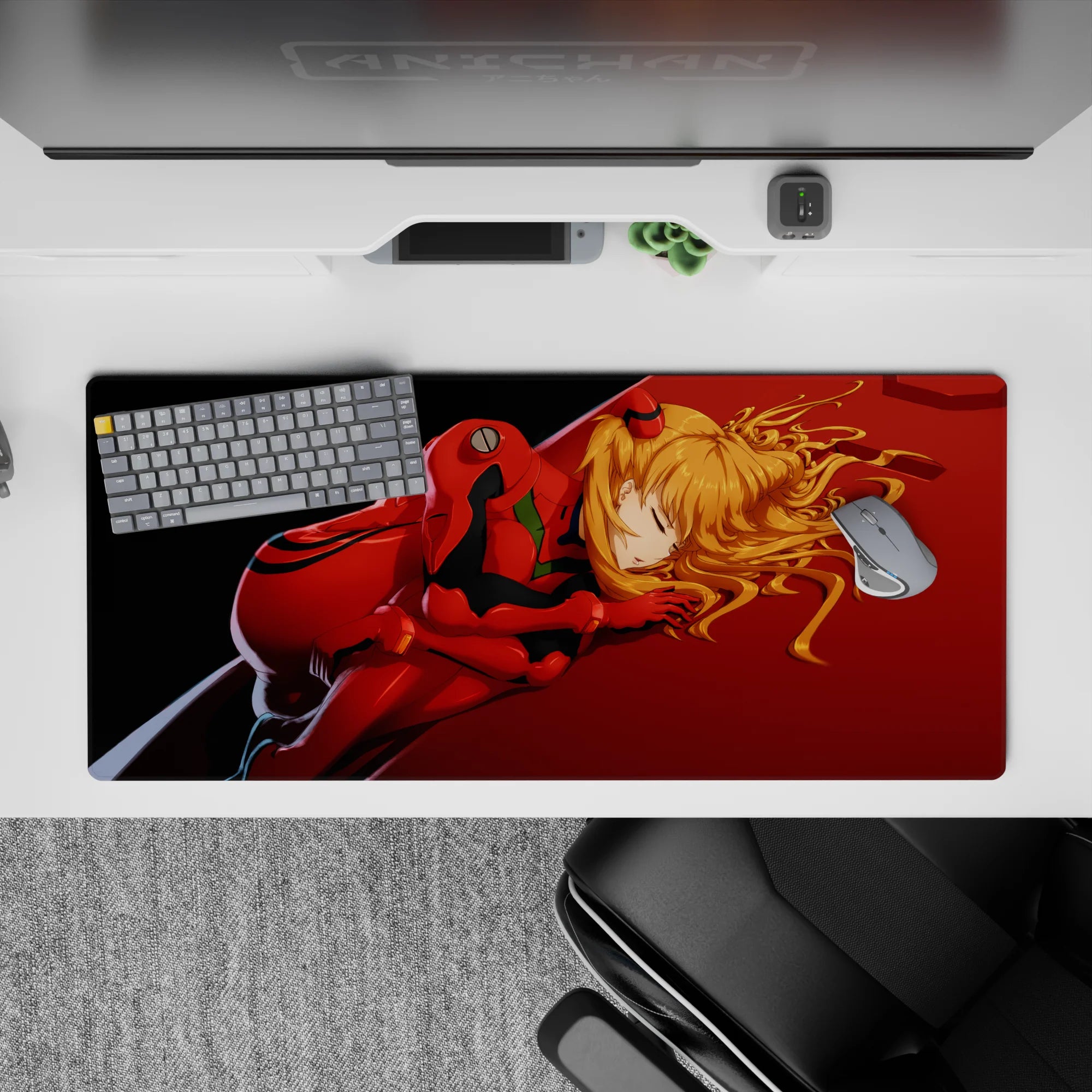 Immerse yourself in the world of Neon Genesis Evangelion with this anime desk pad, showcasing Asuka Langley Soryu resting against Evangelion Unit-02. The bold crimson hues and soft golden highlights make this anime mouse pad a perfect homage to both strength and vulnerability.