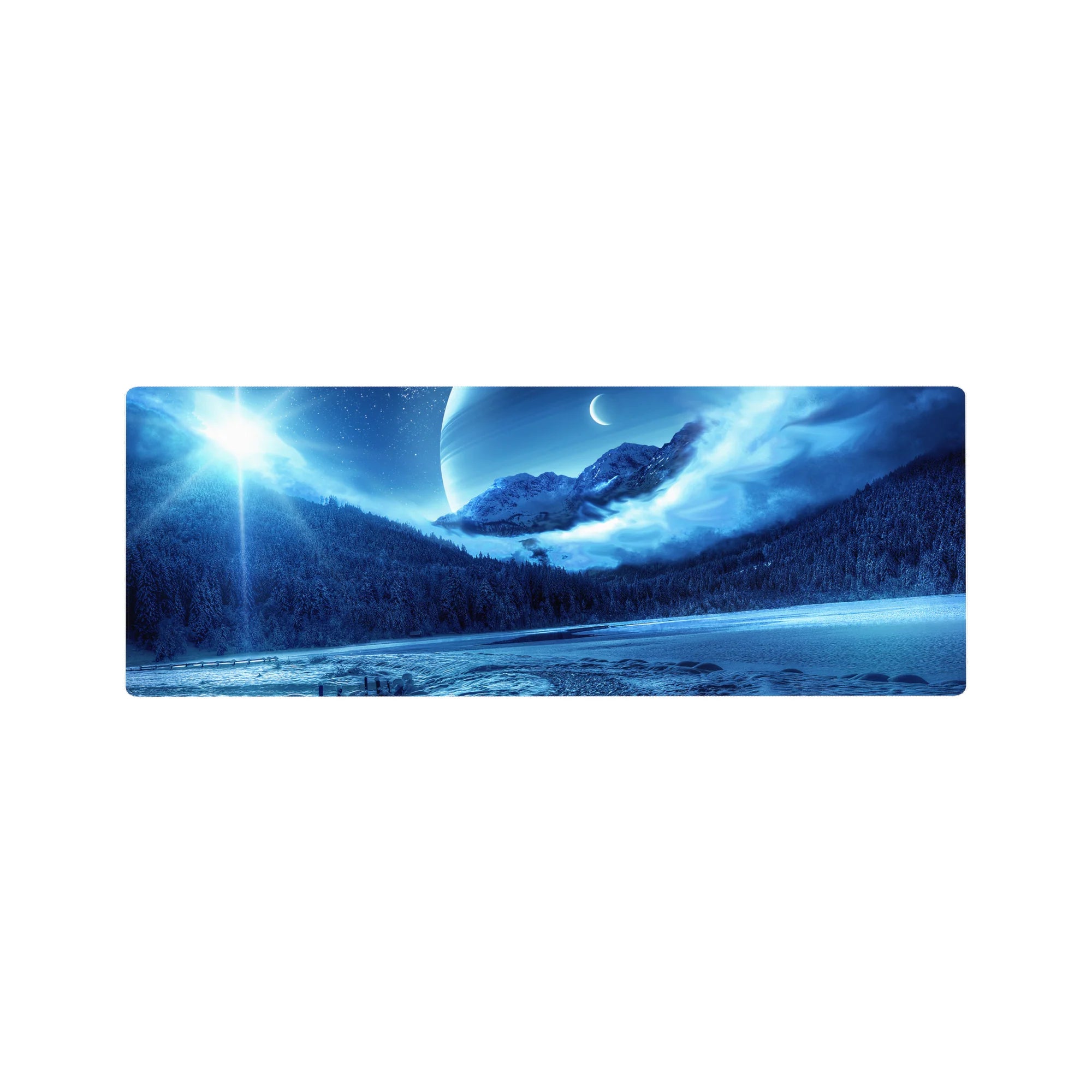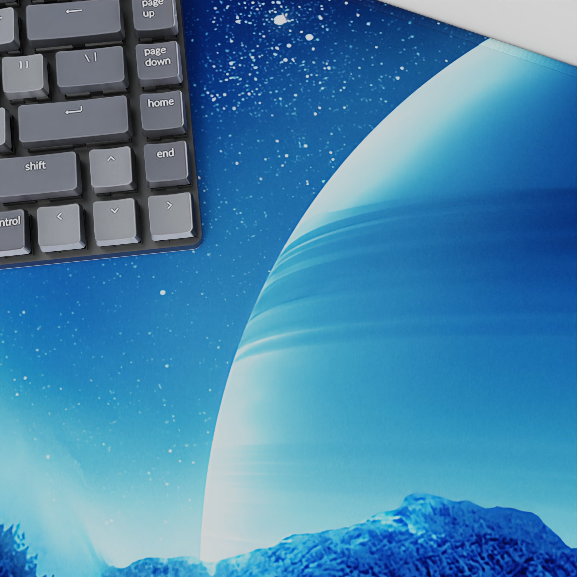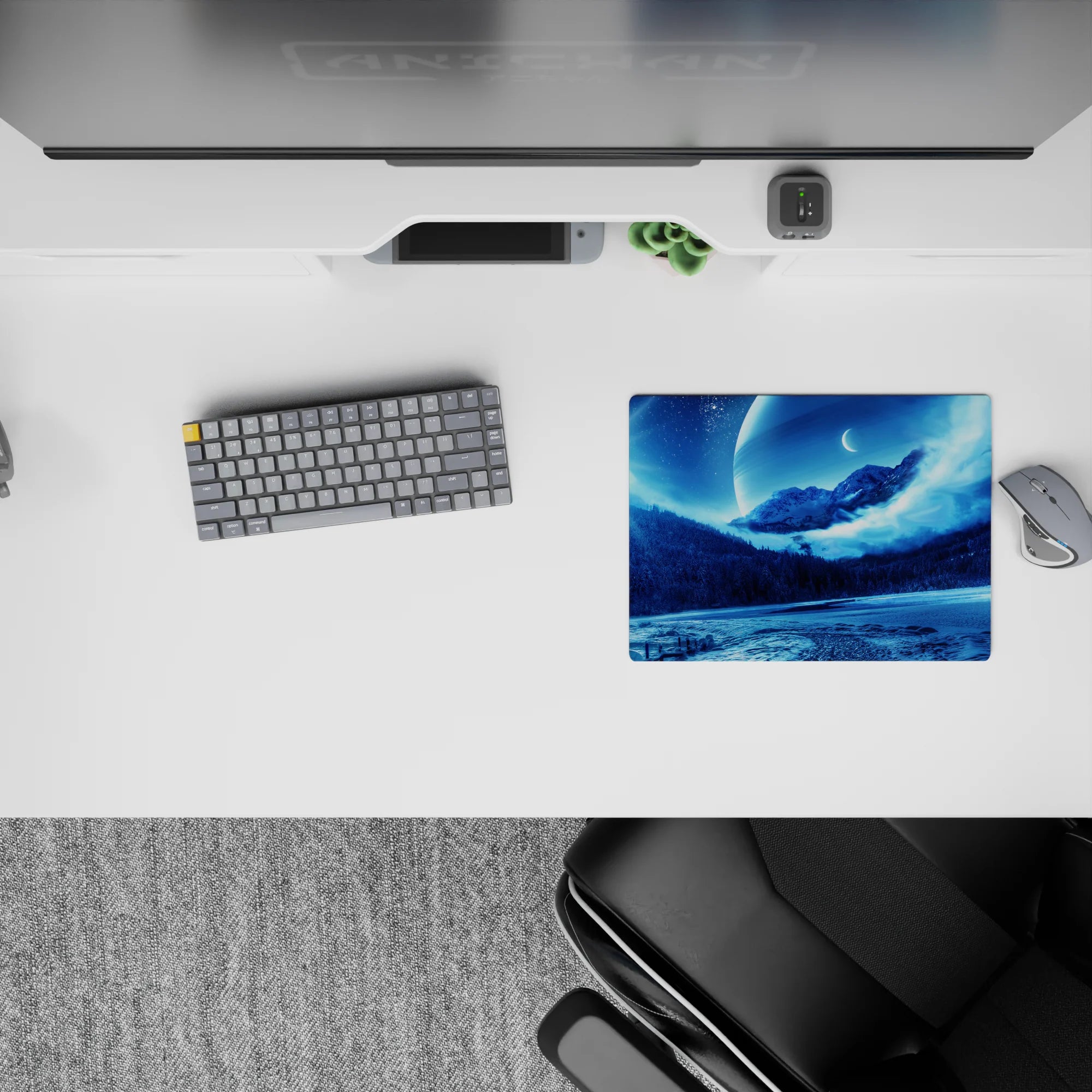 Escape into a frozen dreamscape with this stunning deskmat featuring icy mountains, distant planets, and a cosmic sky. Perfect for those who want a calming yet imaginative workspace, blending mystery and serenity in one breathtaking design.