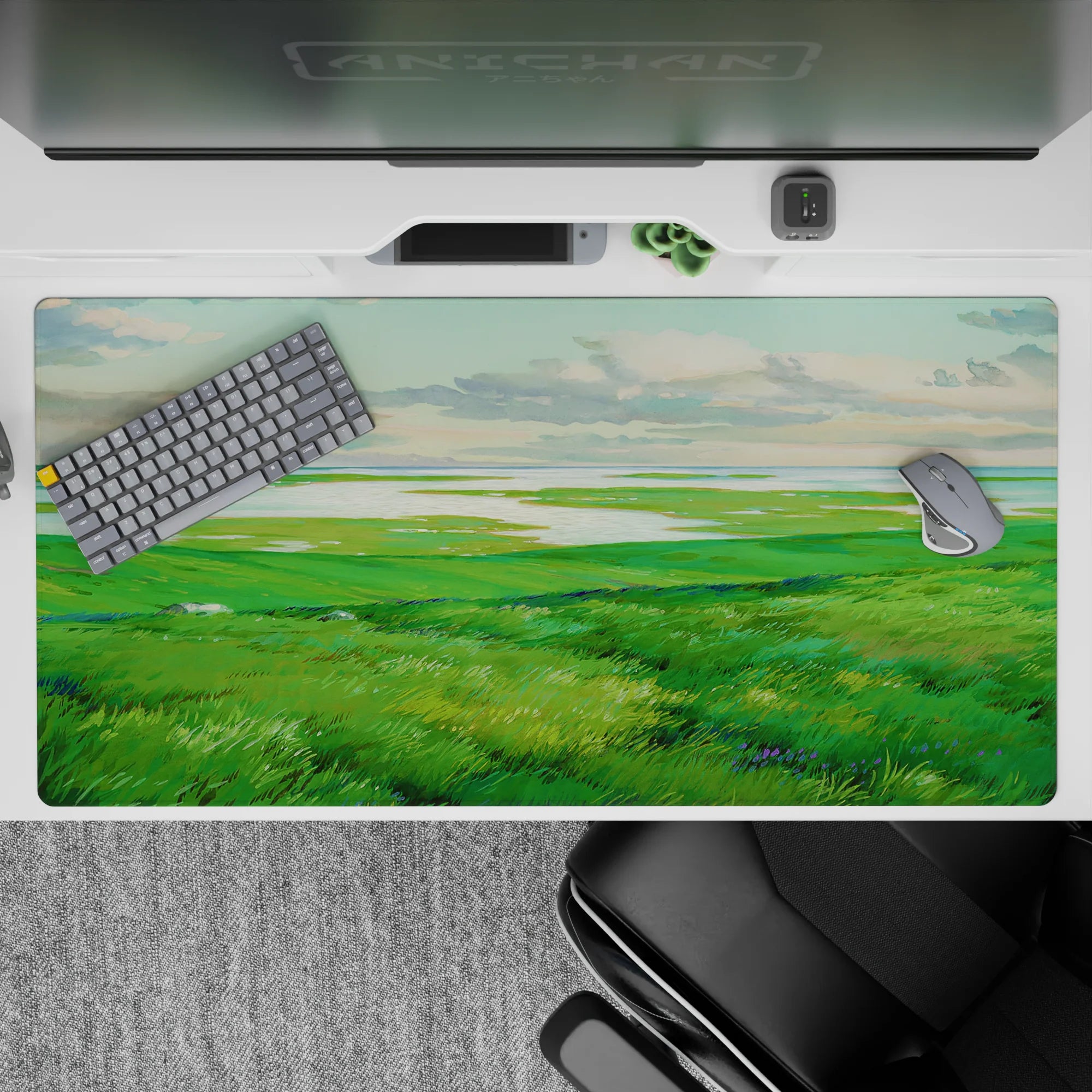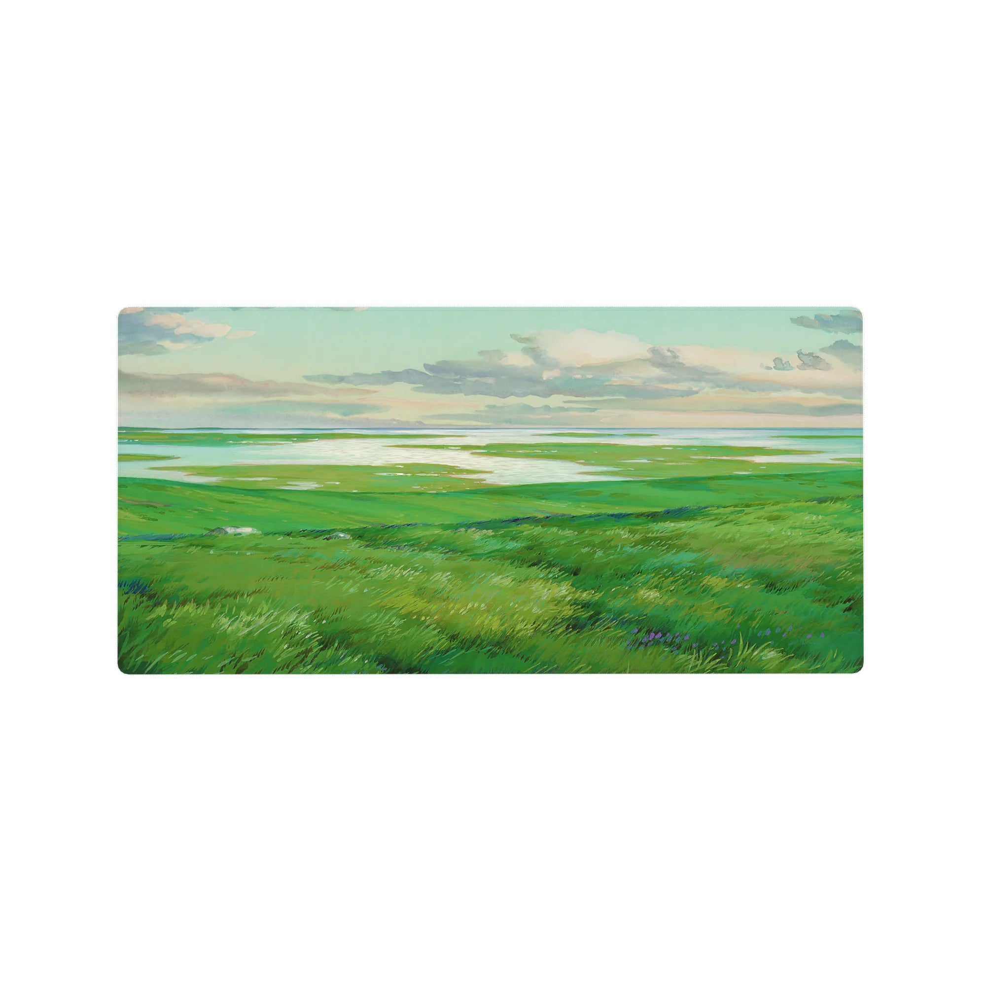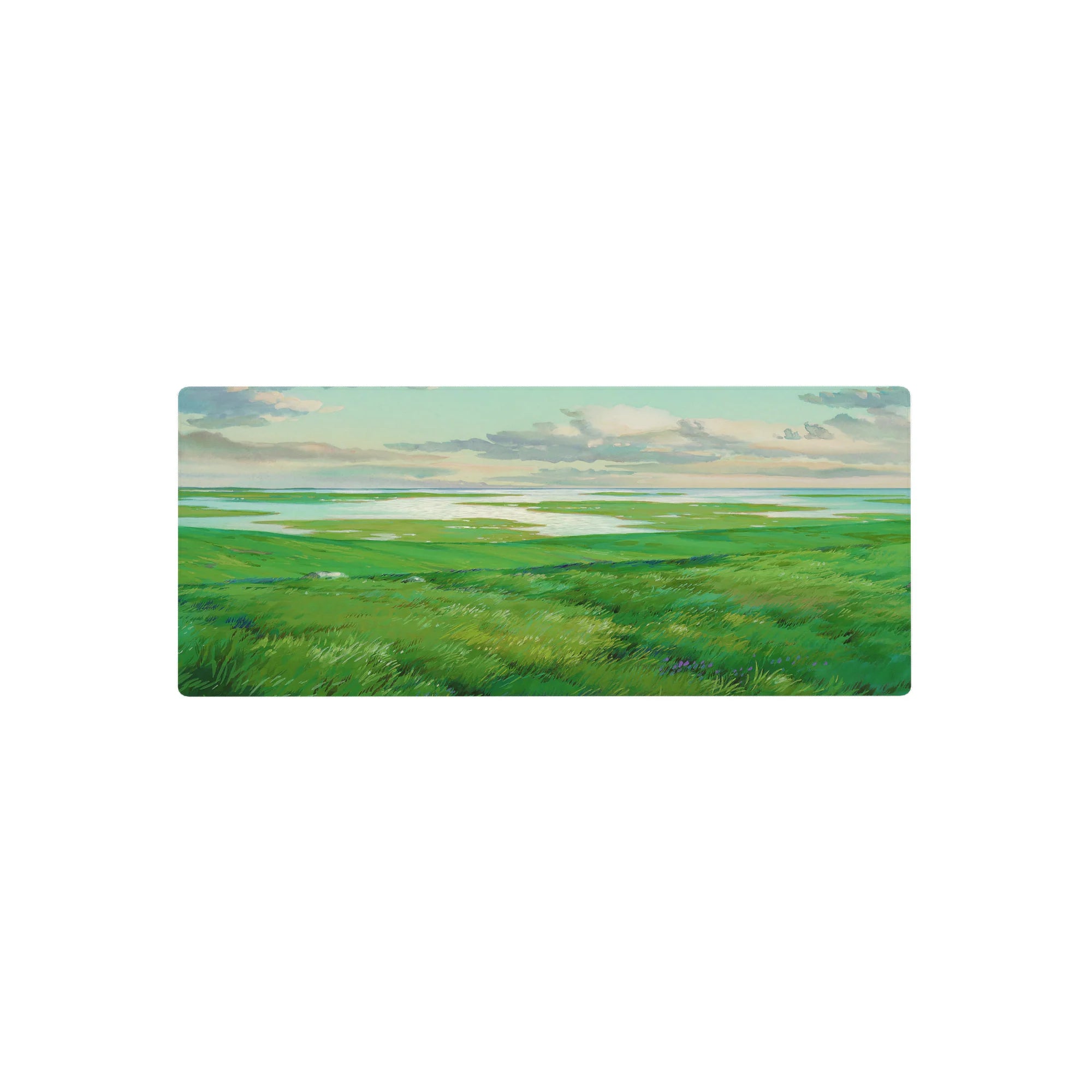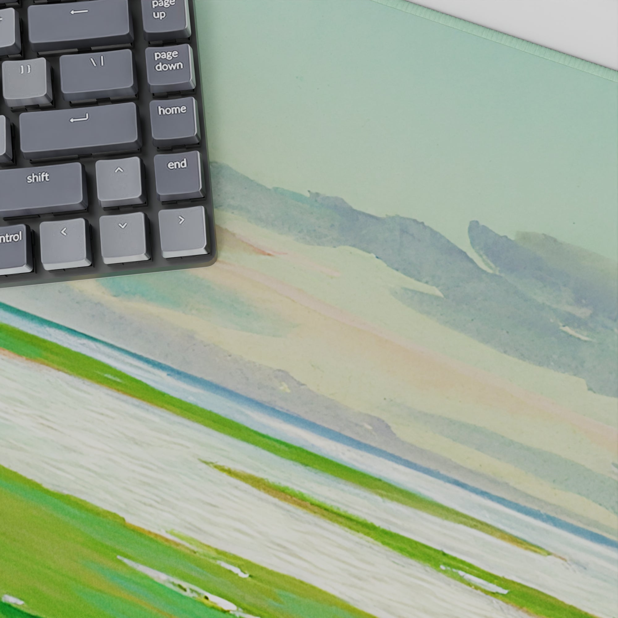 Escape into peaceful nature with this deskmat, featuring rolling green hills and shimmering waters. Perfect for adding a sense of openness and calm to your workspace, this serene design invites quiet reflection and creative freedom.